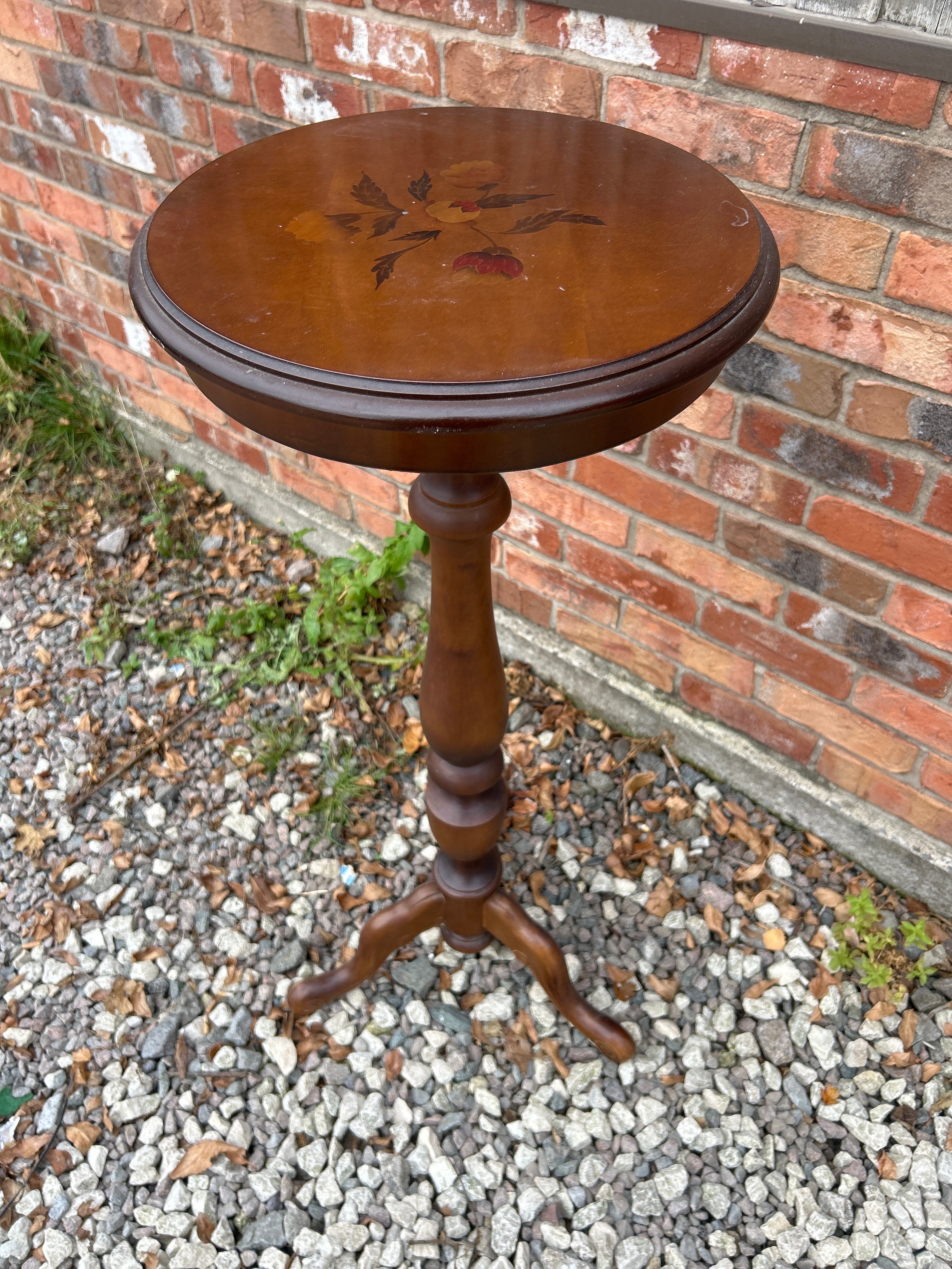 A small, round occasional table crafted from mahogany with a medium-to-dark brown polished finish. It features a turned pedestal leading to a tripod base with gently curved legs. The circular tabletop is decorated with a central floral motif, appearing as an inlay, depicting several flowers and leaves in shades of yellow, red, and dark brown. The design suggests a Victorian or early 20th-century revival style.