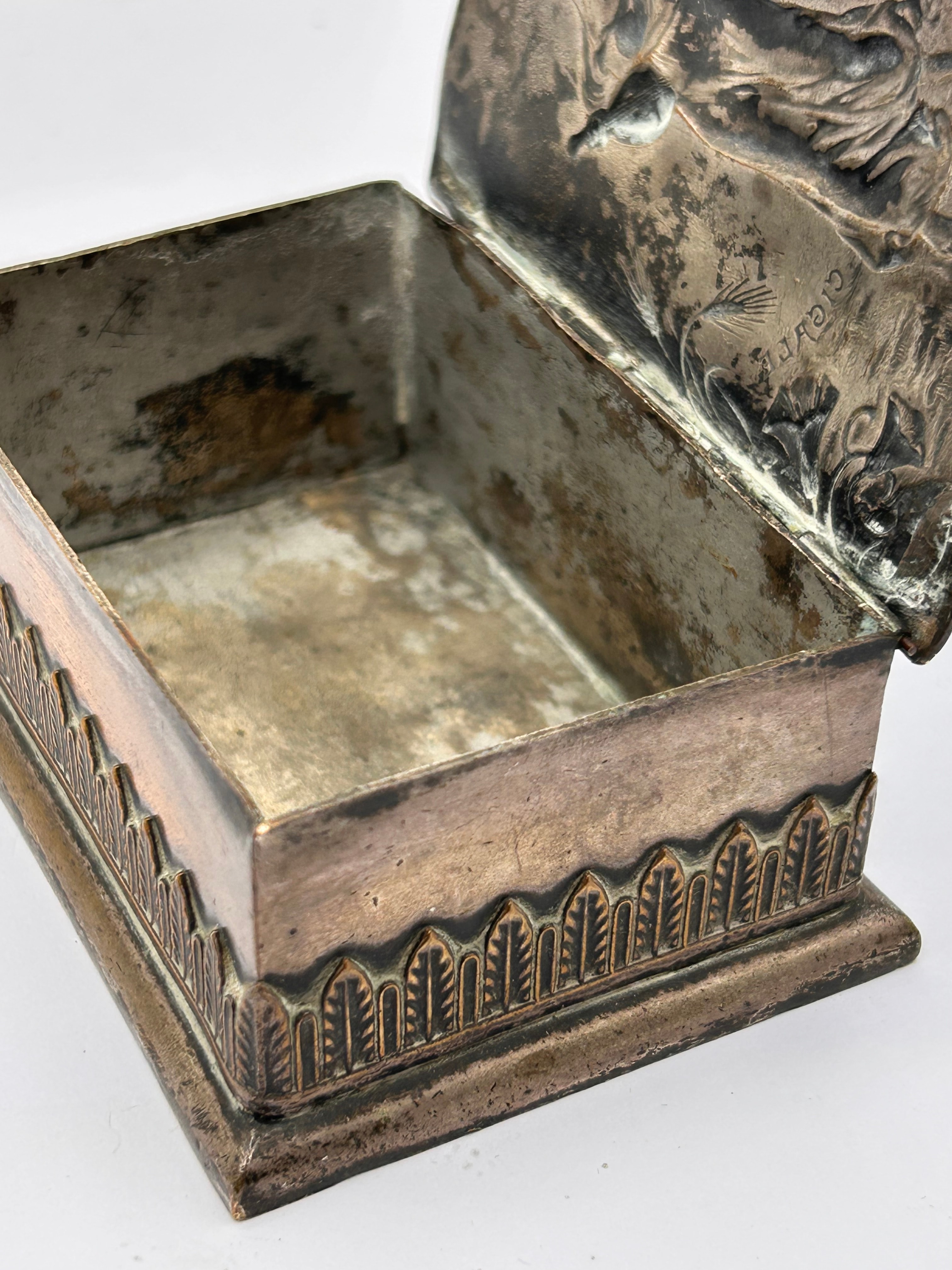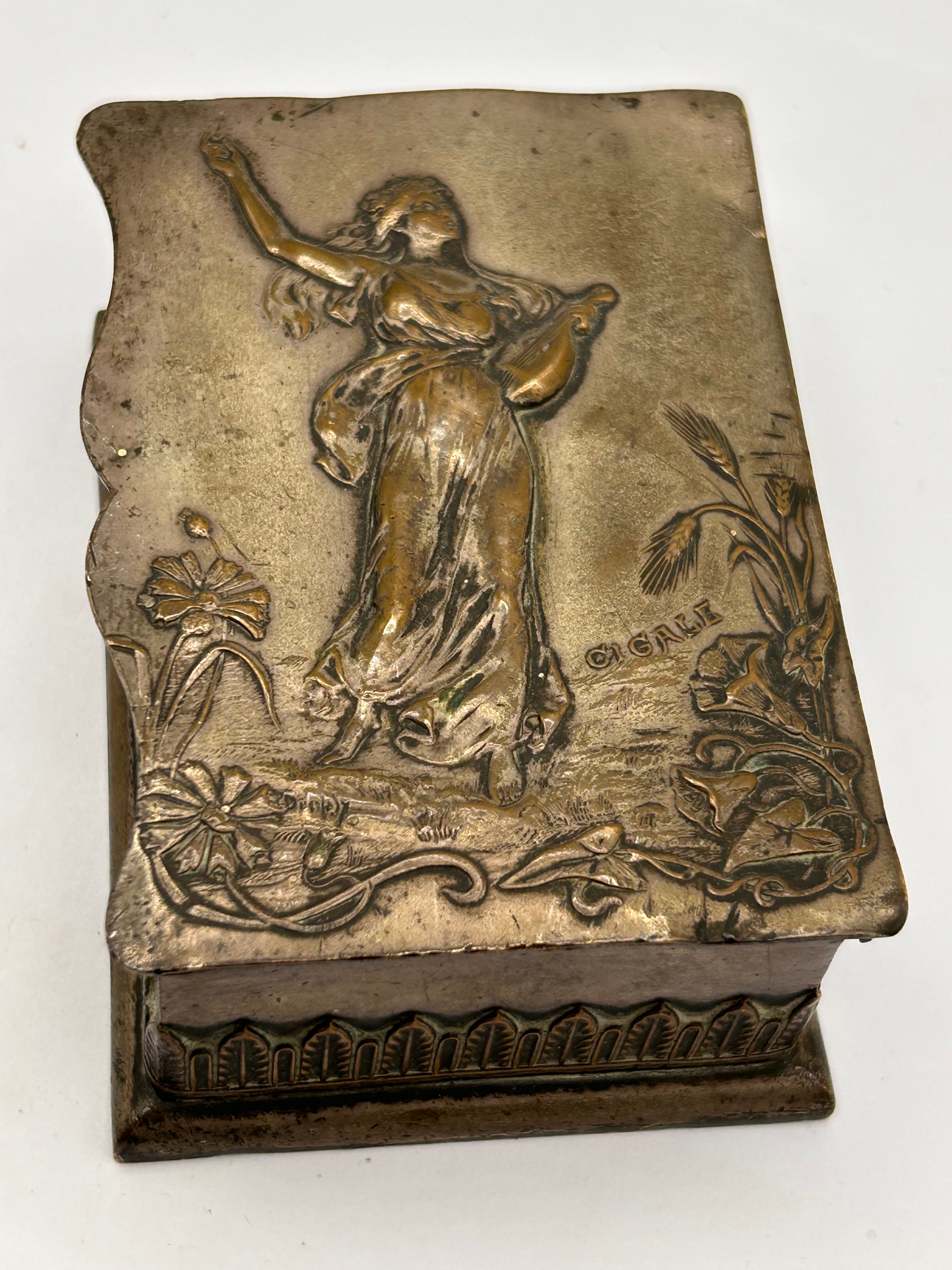 A rectangular lidded box, crafted from a patinated base metal, possibly bronze or brass, in the Art Nouveau style. The lid features a high-relief design depicting a draped female figure amidst stylized flora, including lilies and wheat. The word “CIGALE” (French for “cicada”) is clearly visible on the lid, alongside a less distinct mark. The box’s sides are decorated with a repeating arched motif. The interior is unlined.