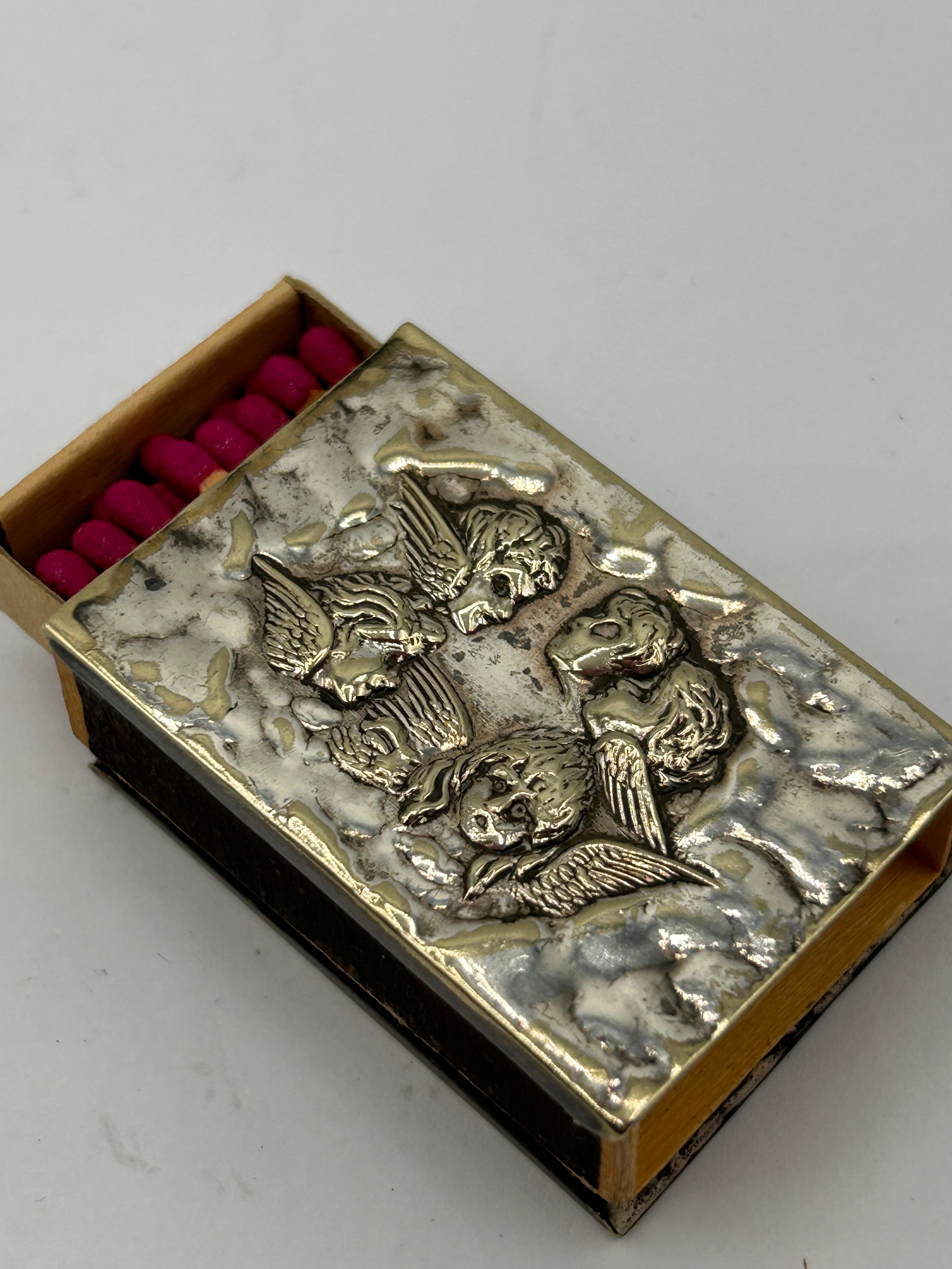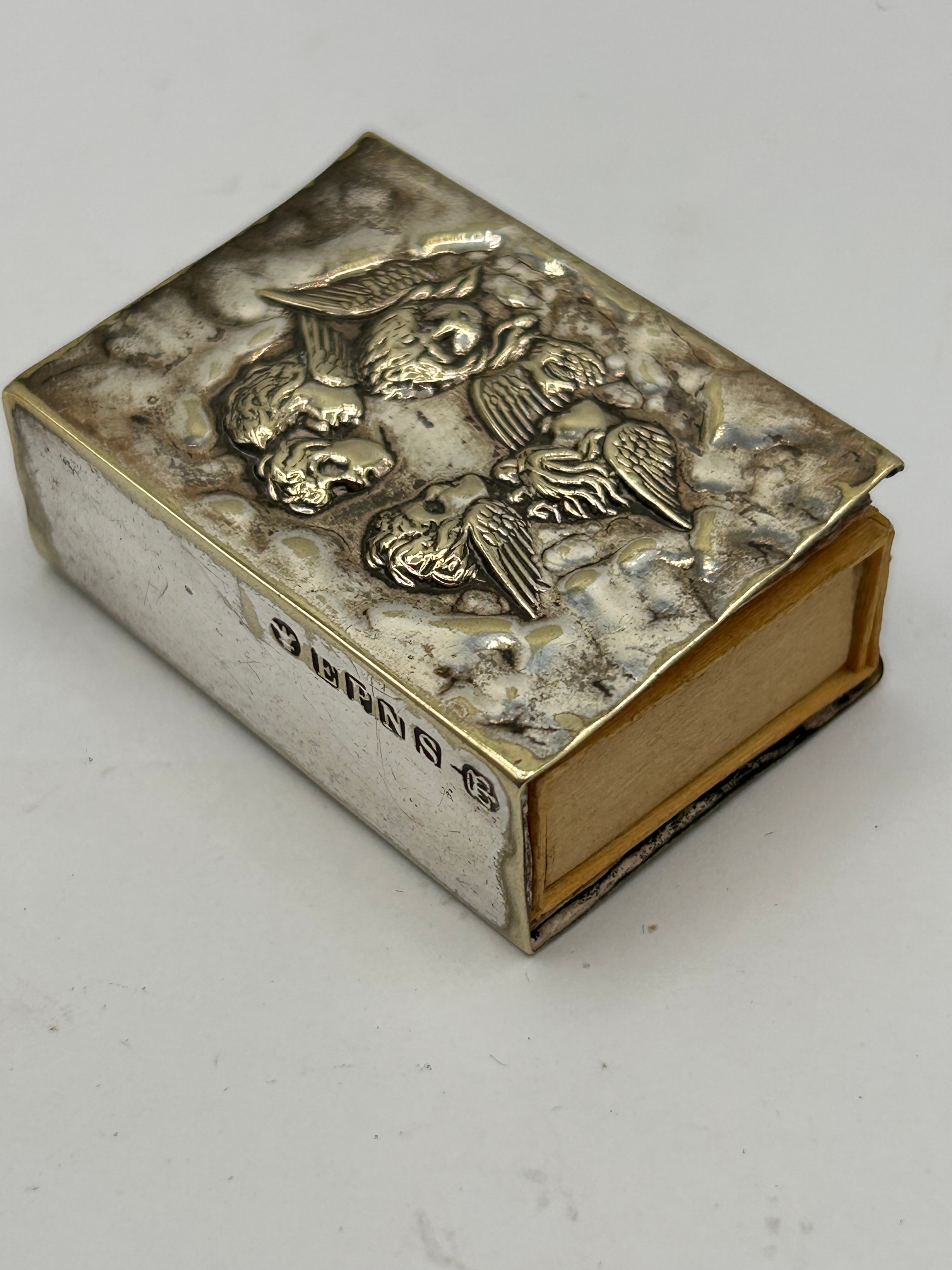 A late 19th Century Birmingham silver P-plated vesta case, of rectangular form, featuring a high-relief repoussé decoration on its lid depicting four winged cherubs or putti. Visible hallmarks on the side include a maker’s mark (possibly ‘JS’ or similar), an anchor for the Birmingham Assay Office, the lion passant indicating sterling silver, and a lowercase Gothic ‘b’ as a date letter, likely corresponding to 1876. It currently houses a standard wooden or cardboard matchbox, containing pink-tipped matches.