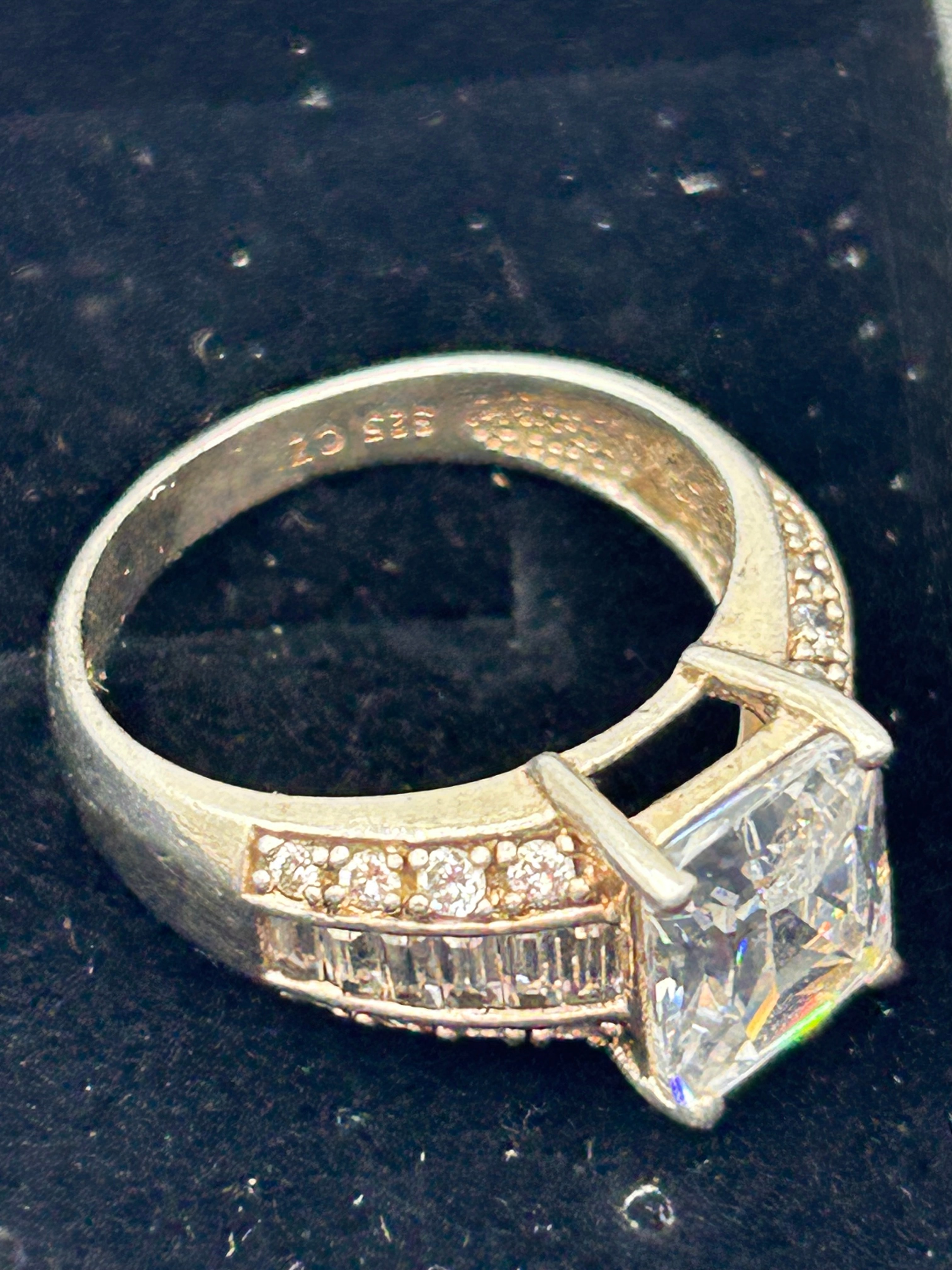 This silver-toned ring is crafted from silver, marked “925” for sterling silver on the inner band. It features a large, rectangular-cut clear center stone, exhibiting strong light dispersion, set in a four-prong setting. The stone is identified as Cubic Zirconia by the “CZ” marking. The broad shoulders of the band are further embellished with multiple rows of smaller clear stones, comprising both baguette-cut and round brilliant-cut accents. The ring appears to be of a contemporary style.