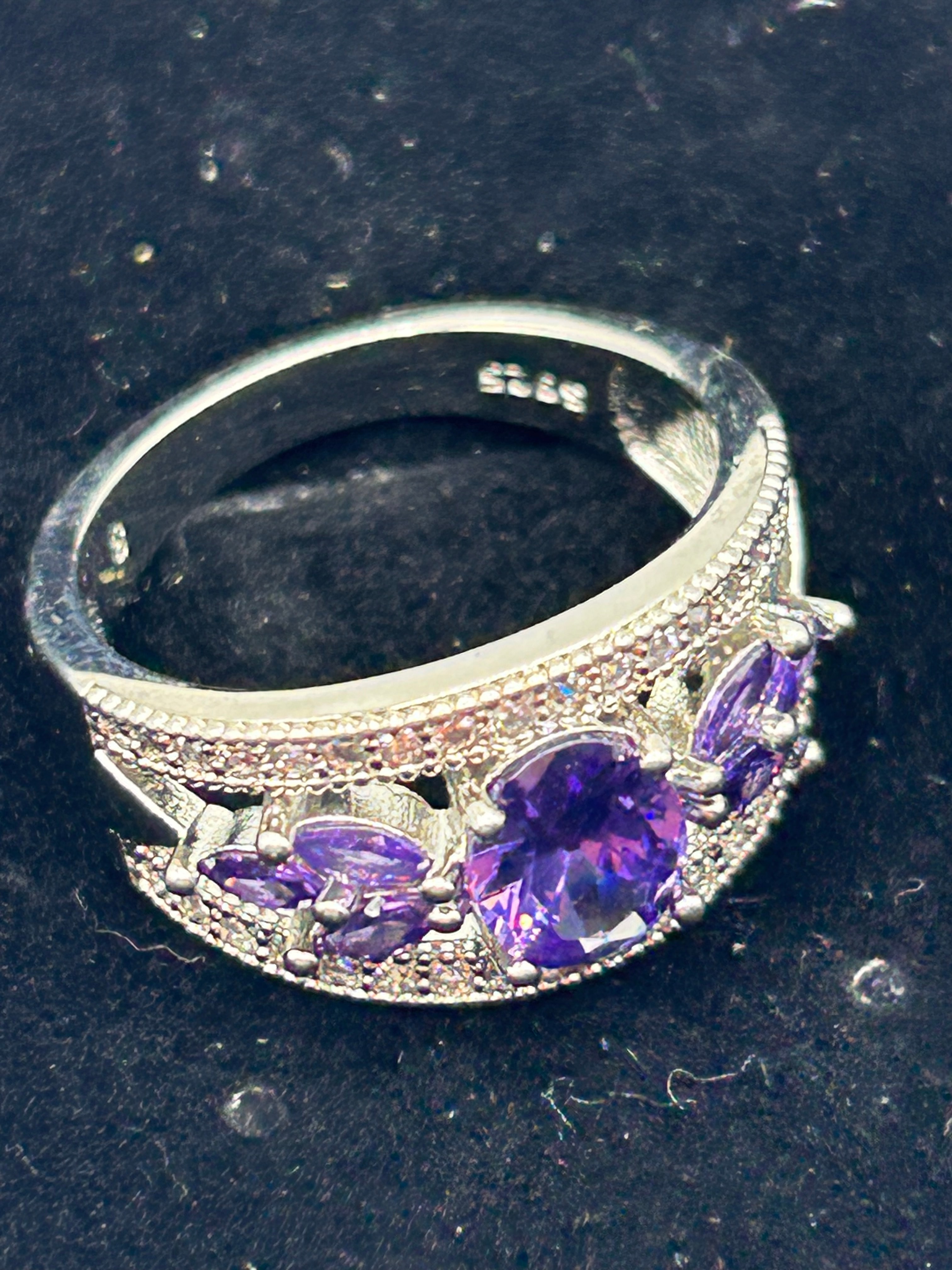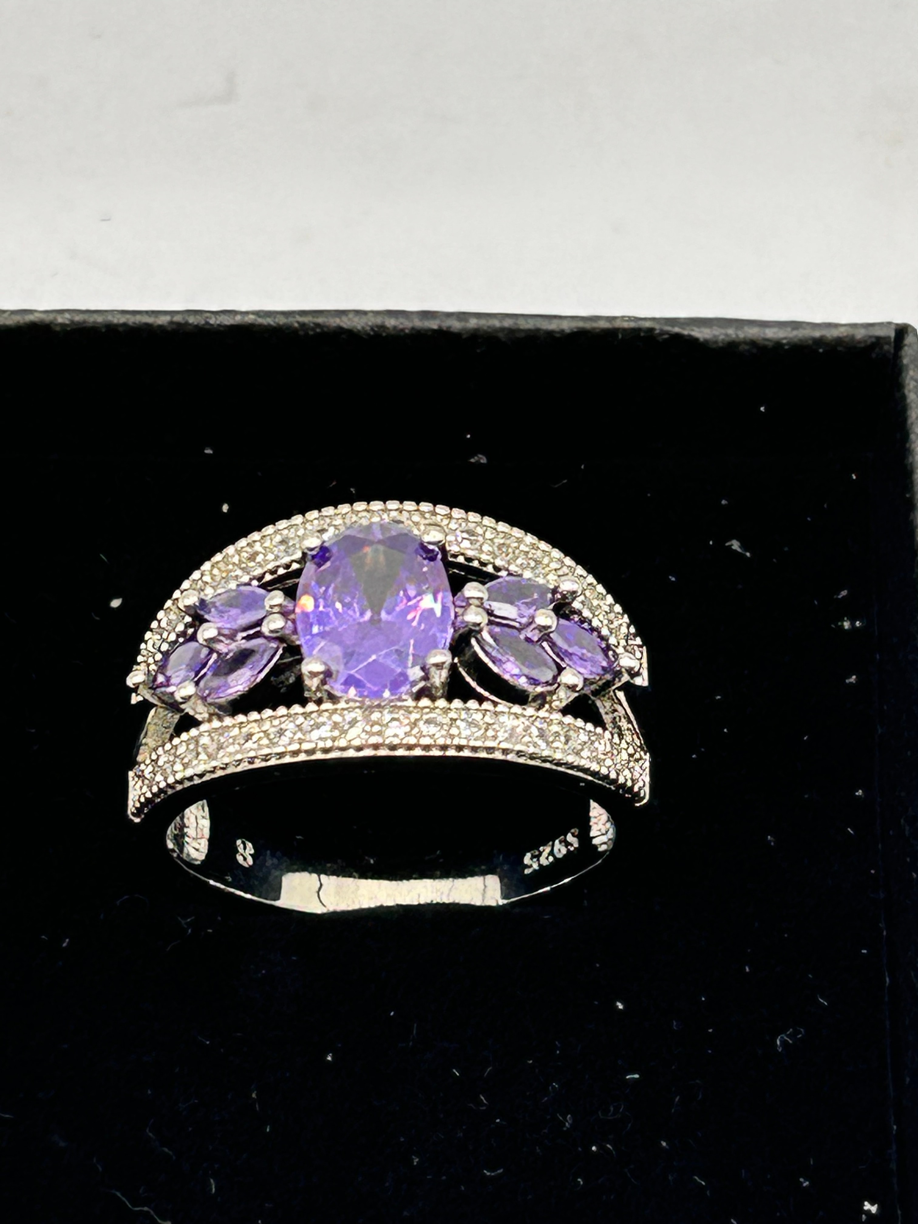 A Silver ring, marked S925, featuring a central oval-cut amethyst-colored stone, flanked by clusters of three marquise-cut amethyst-colored stones on each side. The domed band and settings are extensively embellished with pave-set cubic zirconia accent stones. The interior of the band is visibly marked “S925” and “8”. The item presents in a contemporary decorative style.