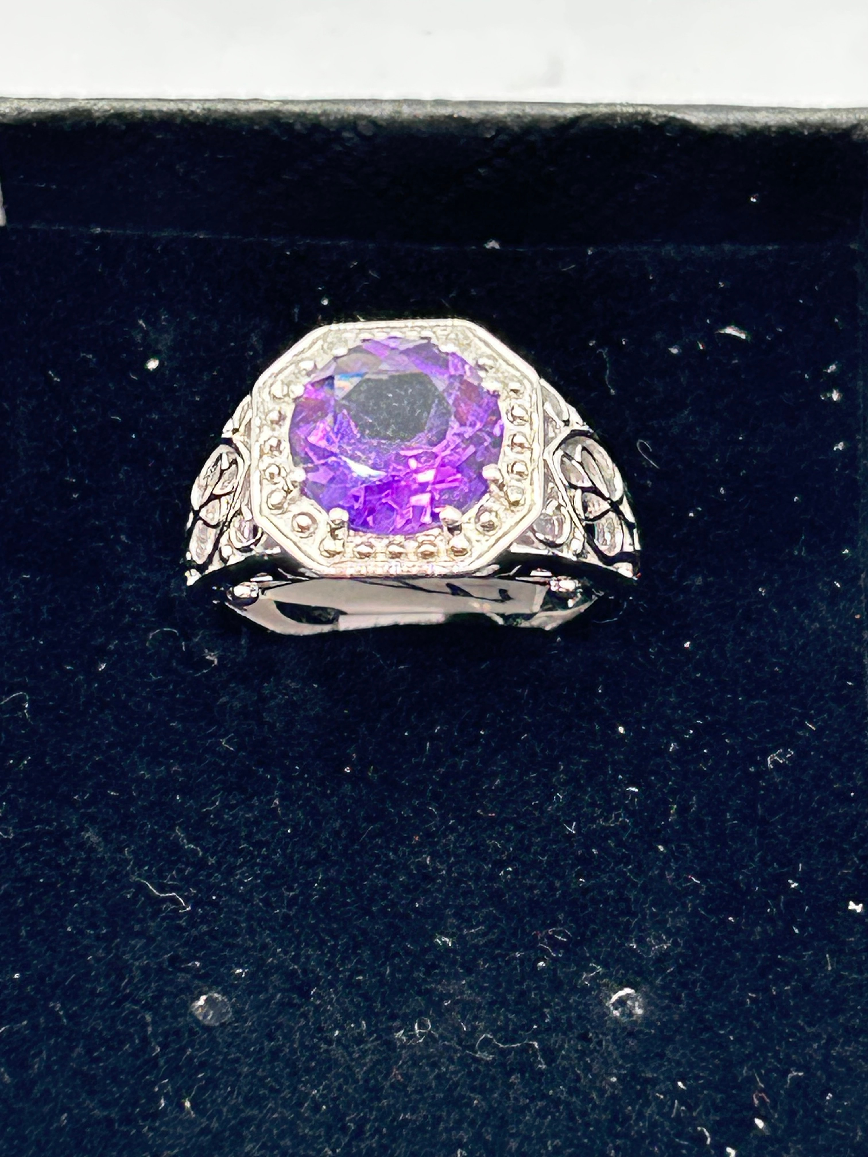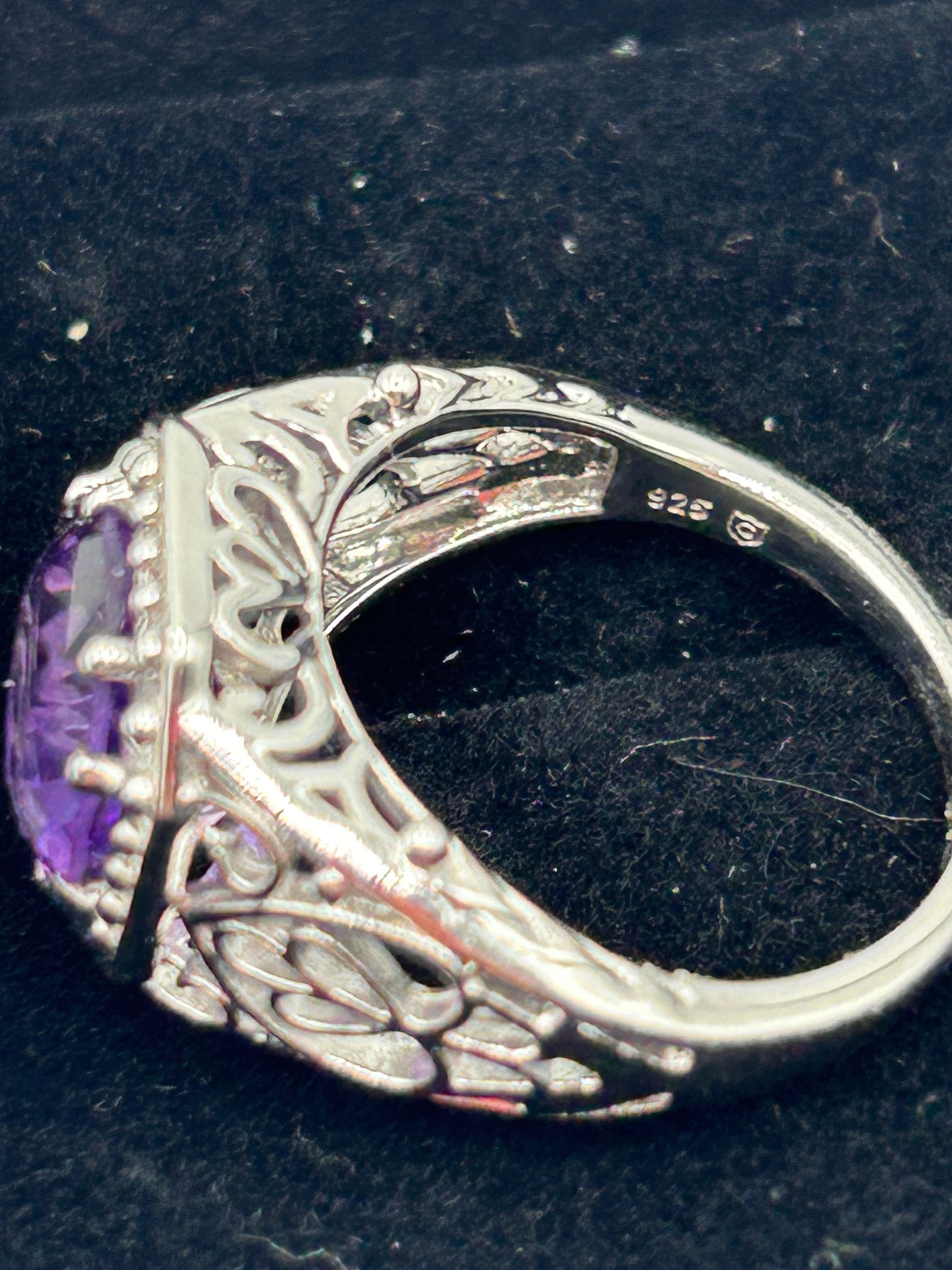 A modern ring crafted from silver, marked “925” alongside an additional hallmark on the interior of the band. It features a prominent octagonal, faceted deep purple amethyst center stone, set within a bezel surrounded by a halo of pave-set smaller, clear stones. The ring’s shoulders exhibit an elaborate openwork or filigree design.