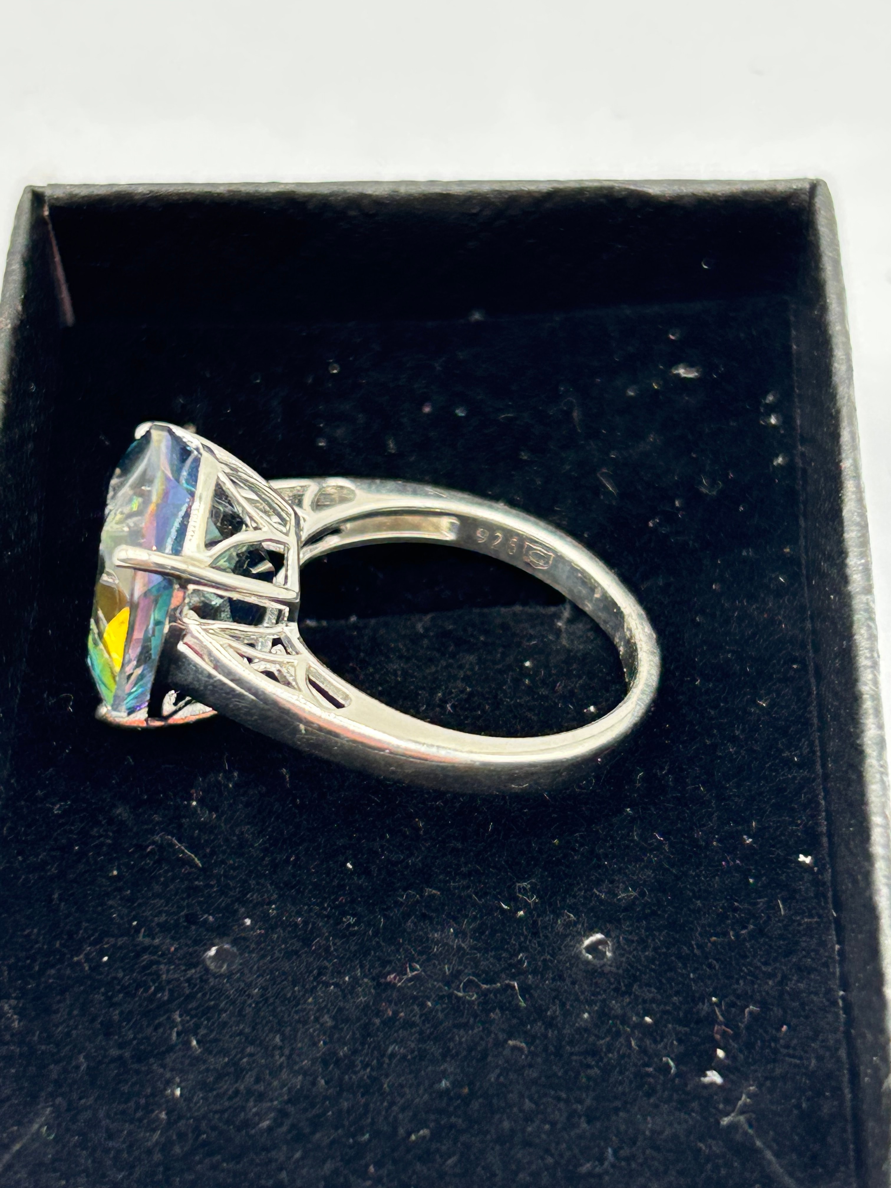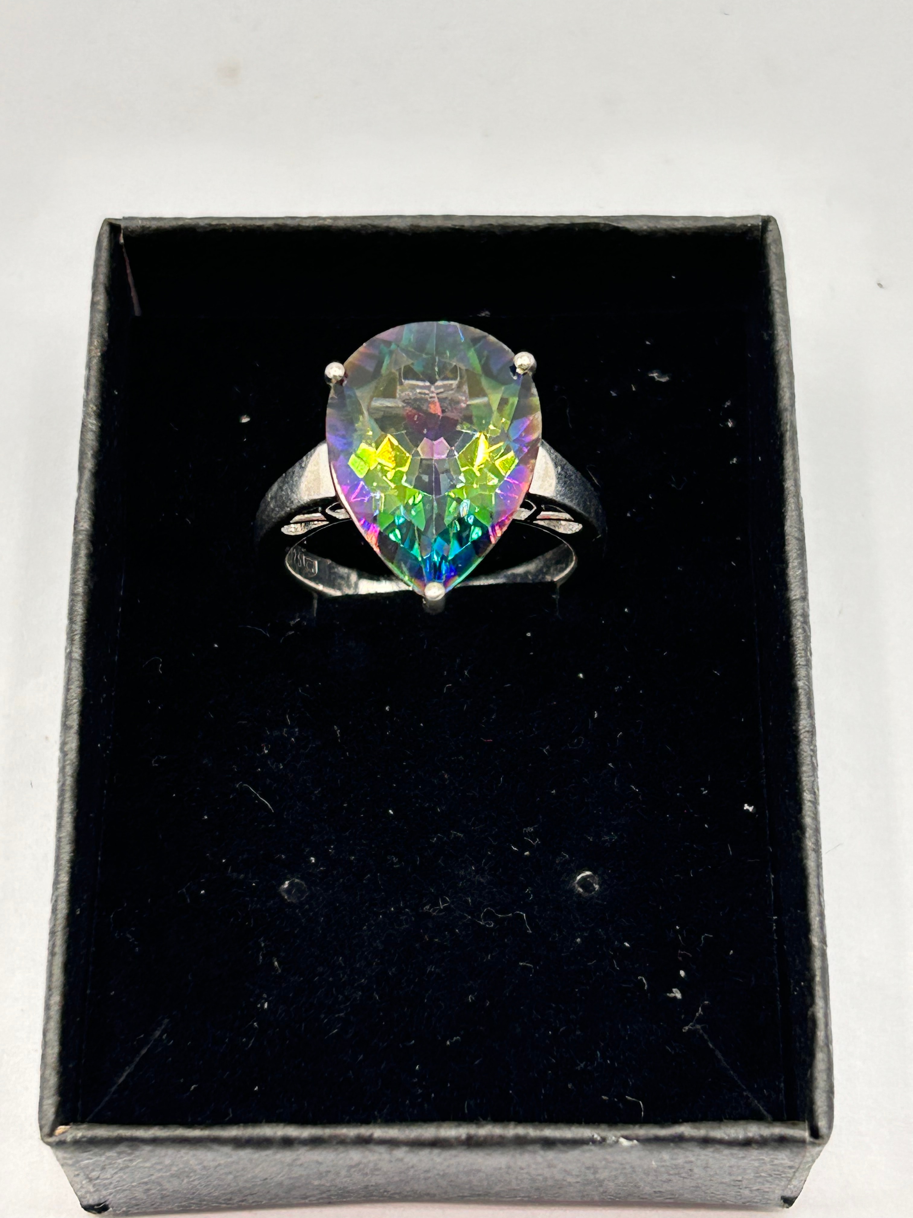 A Sterling Silver Mystic Topaz Pear-Shaped Ring. This modern-style finger ring is crafted from silver, featuring a large, pear-shaped faceted gemstone that exhibits a prominent multi-color iridescent ‘rainbow’ effect. The gemstone is secured by a four-prong setting. The interior of the ring’s band is visibly marked ‘S 925’, confirming sterling silver.