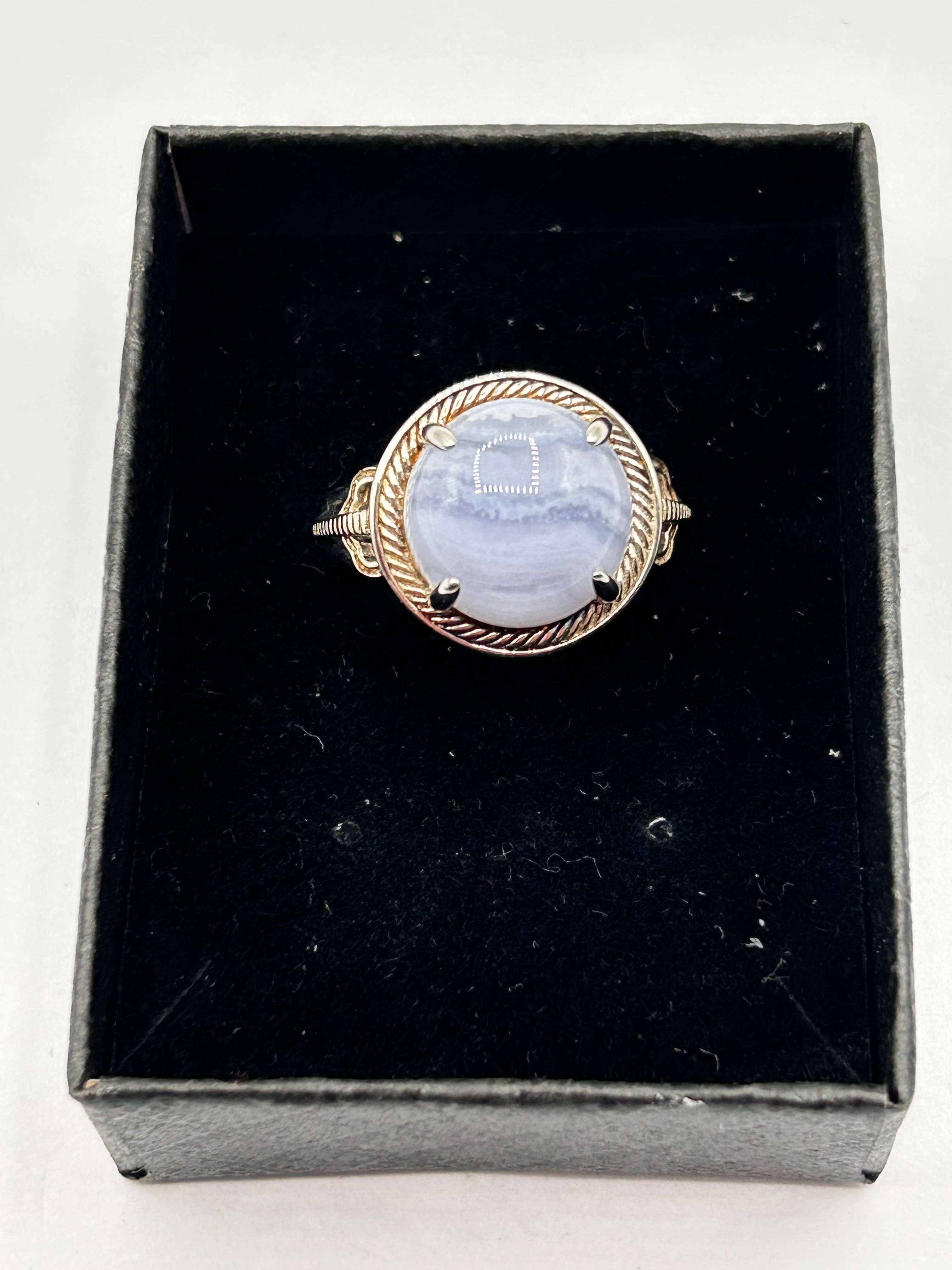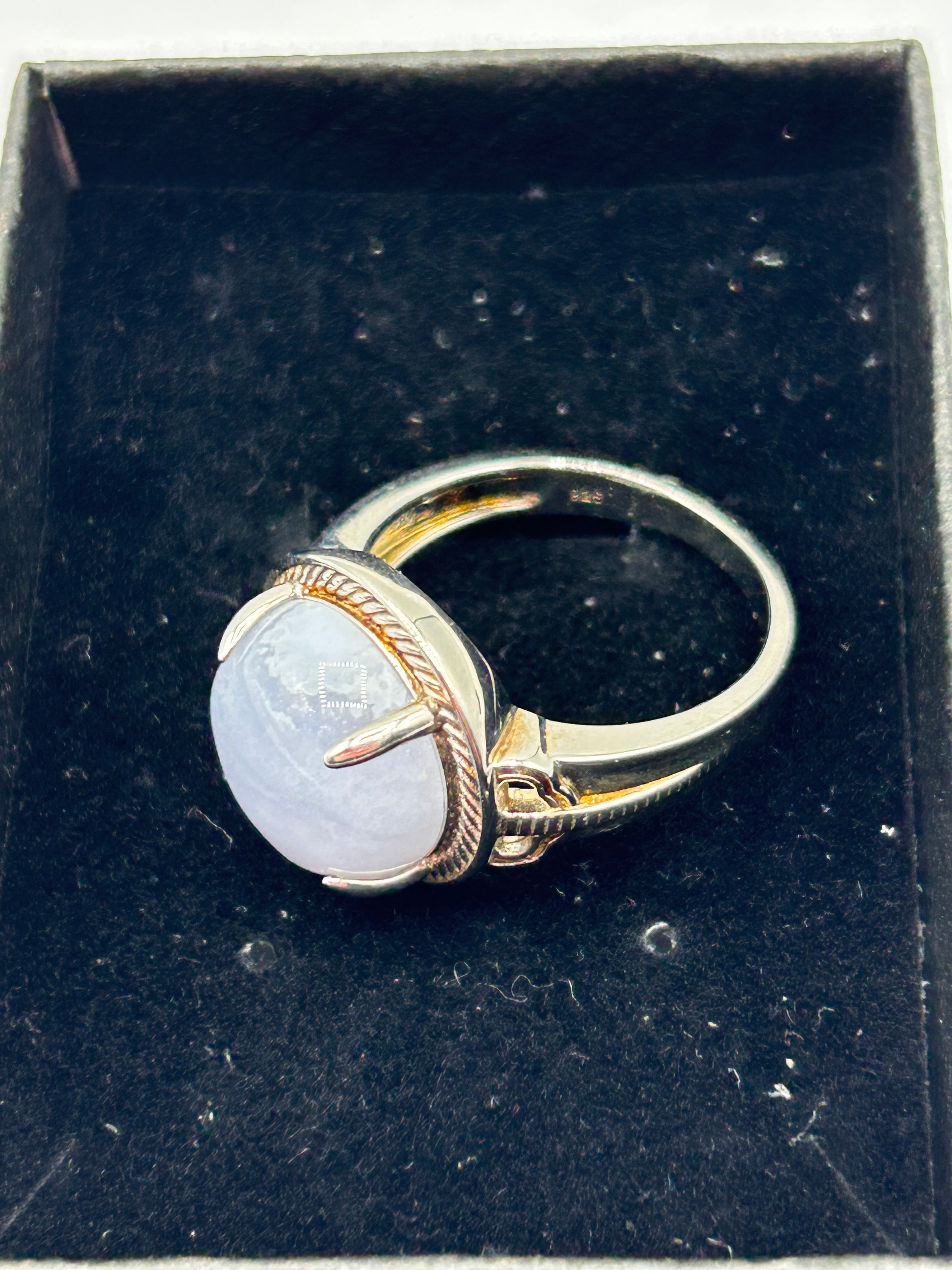 A Silver ring set with a prominent oval-shaped blue lace agate cabochon. The stone is bezel-set, accented with a twisted rope detail, and further secured by four prongs. The shoulders of the band feature a stylized design, leading to a plain shank. A ‘925’ stamp is faintly visible on the interior of the band. The ring is presented in a black, velvet-lined box.