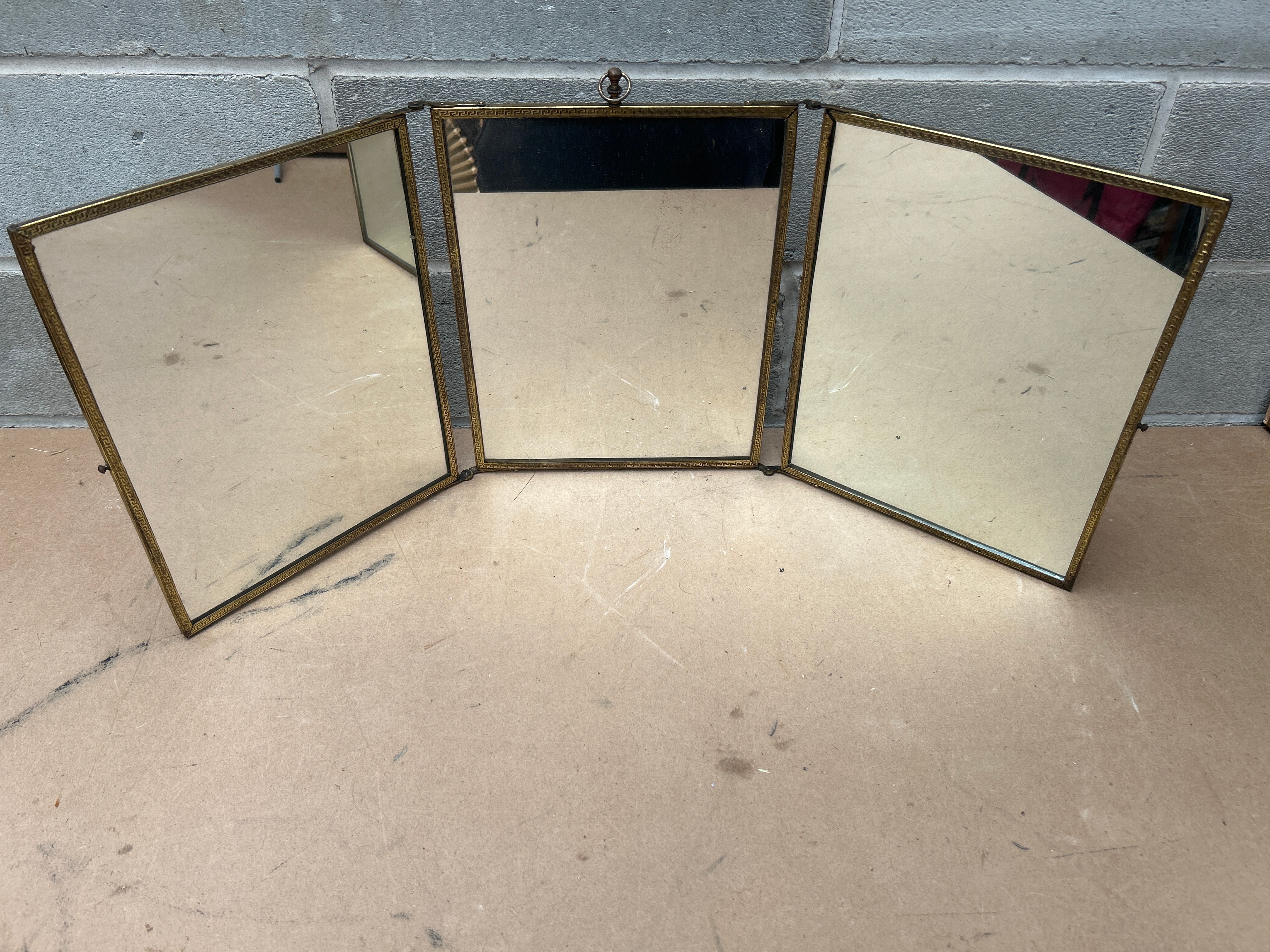 A Victorian Style three-panel folding vanity mirror, featuring Brass frames. The front presents three rectangular glass mirror panels. The reverse side is decoratively finished, comprising a cream-colored relief panel depicting putti and floral elements on the left, a central panel covered in a dark material with a repeating gold fan-shaped pattern, and a right panel showcasing a hand-painted or printed floral design on a light background. A small decorative finial is present at the top of the central frame. The object is consistent with a late 19th to early 20th-century period, possibly Art Nouveau or Edwardian in style.