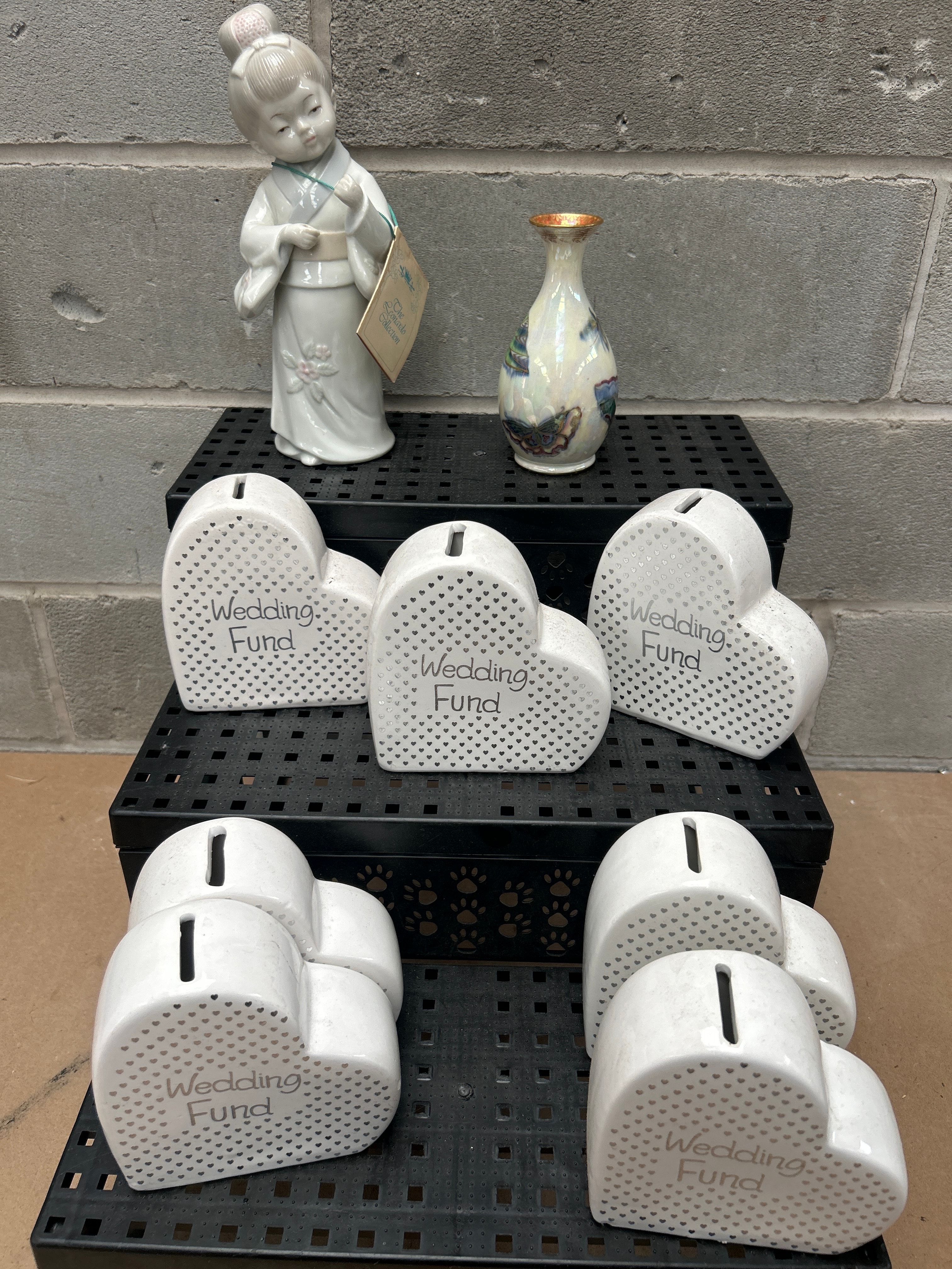 A set of six matching heart-shaped white glazed ceramic money boxes, each featuring a coin slot on top and a subtle pattern of small hearts. The front of each box is inscribed with ‘Wedding Fund’. Also included is a white porcelain or fine ceramic figurine depicting a person in traditional East Asian attire, bearing a tag potentially indicating ‘Leonardo Collection’. Completing the lot is a small, iridescent ceramic vase with a gold-painted rim and floral/butterfly decoration. All items are displayed on tiered black plastic shelving, which is not included in the lot.