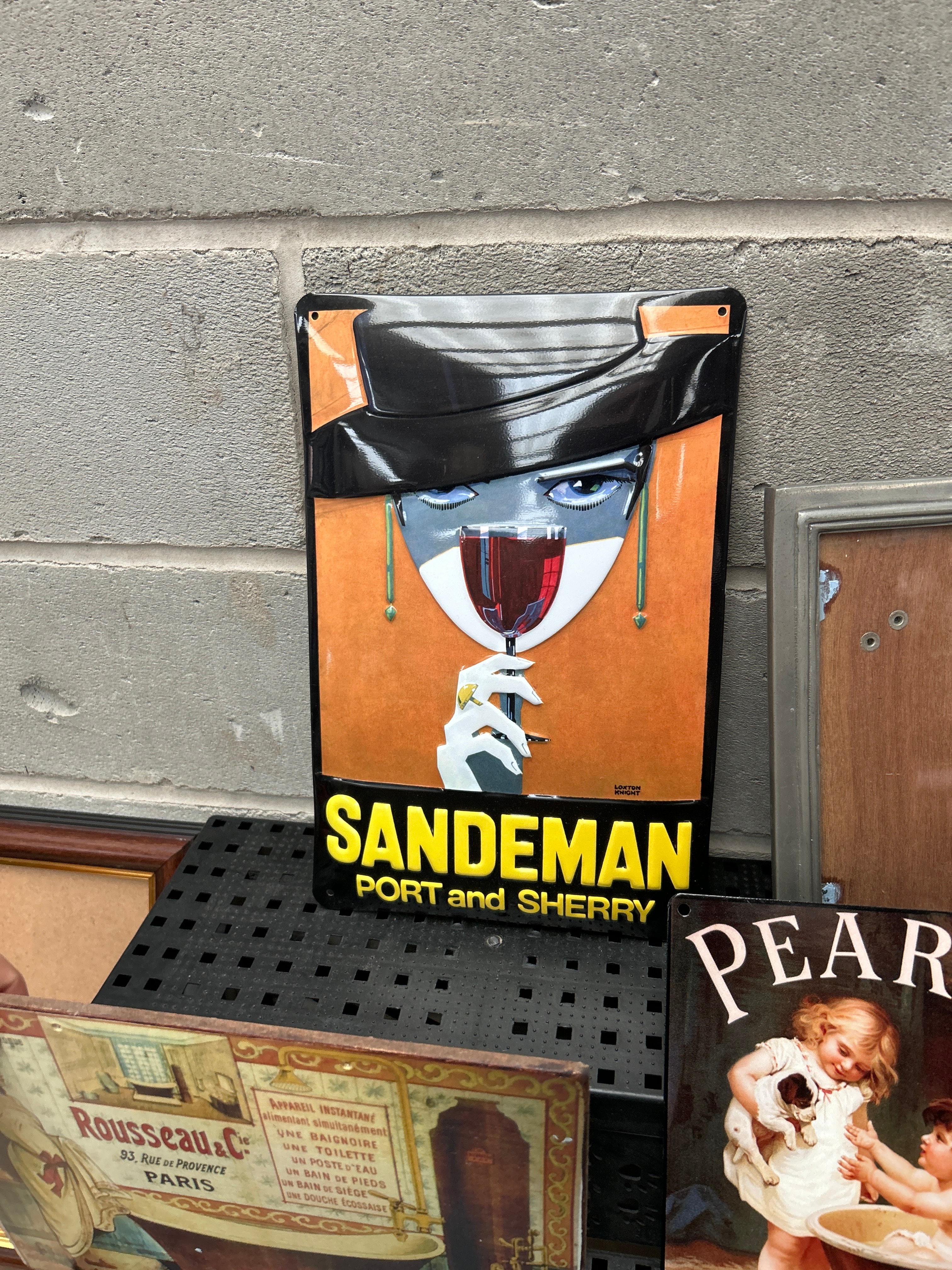 This lot presents a varied collection of decorative items for the home. It includes three rectangular metal advertising signs, one for “SANDEMAN PORT and SHERRY” featuring a stylized figure, another for “PEARS’ SOAP” depicting children, and a third for “Rousseau.C” with French text translating to “INSTANTANEOUS APPLIANCE, ensuring simultaneously FOR A TOILET, A BATH OR A BOILING SHOWER, 93, RUE DE PROVENCE PARIS, BATHROOM OFFICE 350.” Also present are three modern decorative plaques, one reading “The NAUGHTY Corner GRAB A GLASS & JOIN ME!”, another “LAUNDRY -drop your pants here-“, and a third “IF YOU OBEY ALL THE RULES YOU MISS ALL THE FUN.” The collection further comprises a group of empty picture frames in various sizes and wood tones, including one fitted with a cork board, and a stack of fruit still-life themed coasters. The advertising signs are crafted from metal, while the frames and decorative plaques are made from wood or MDF.