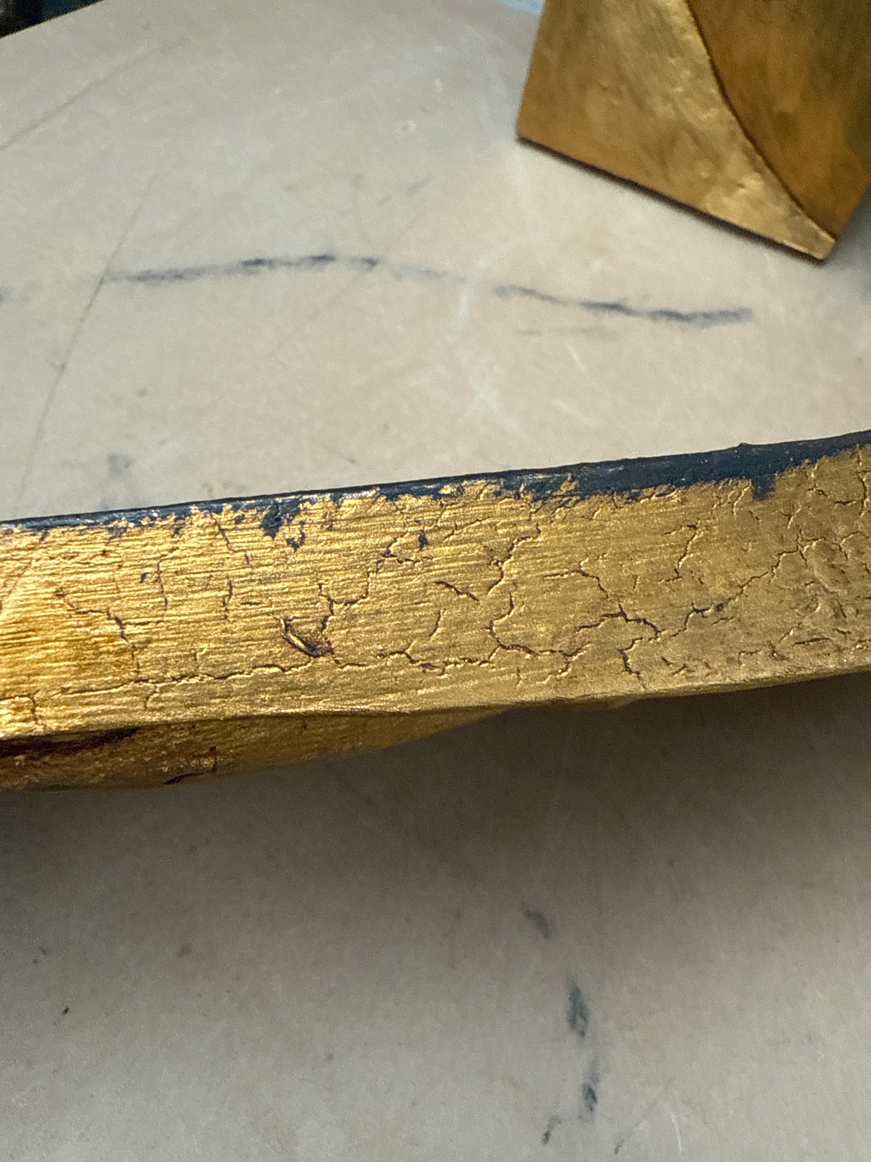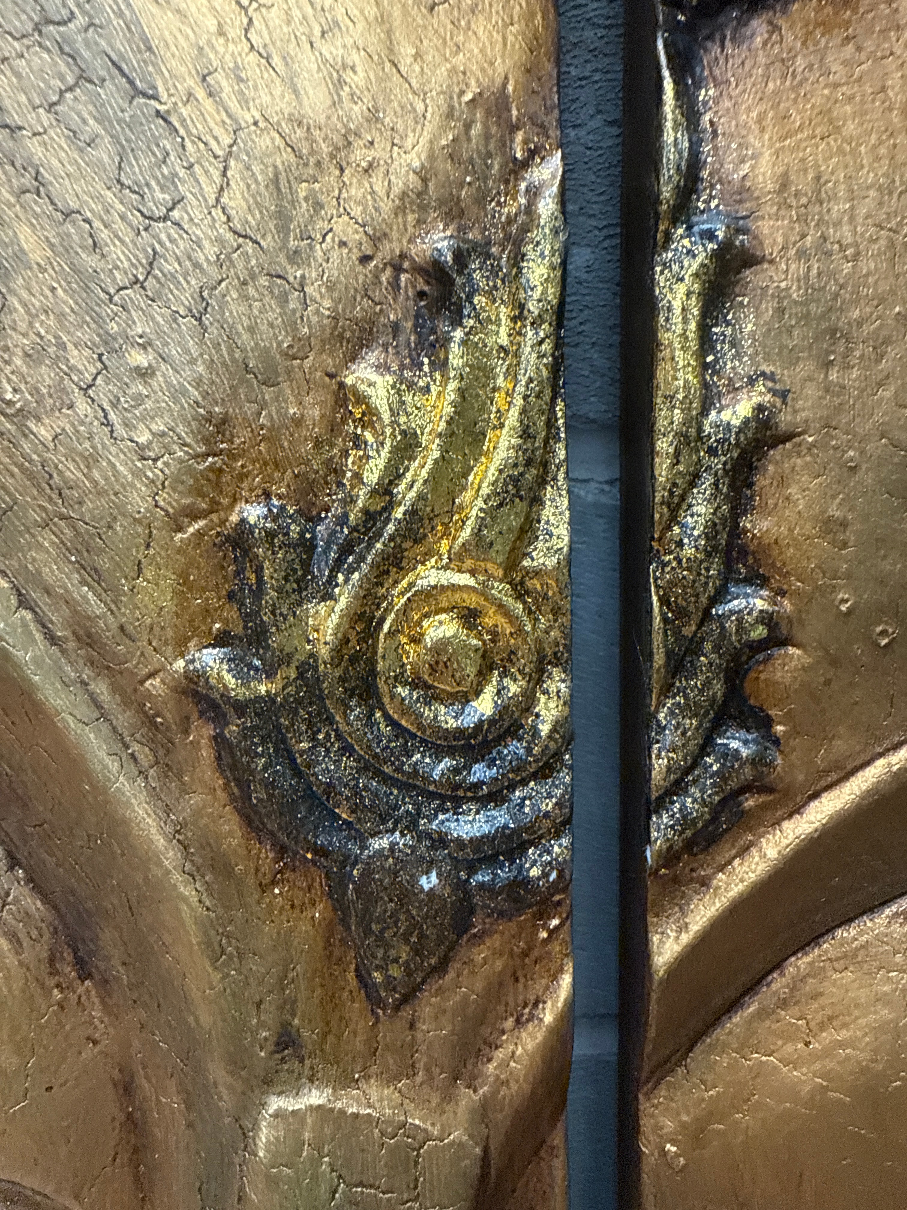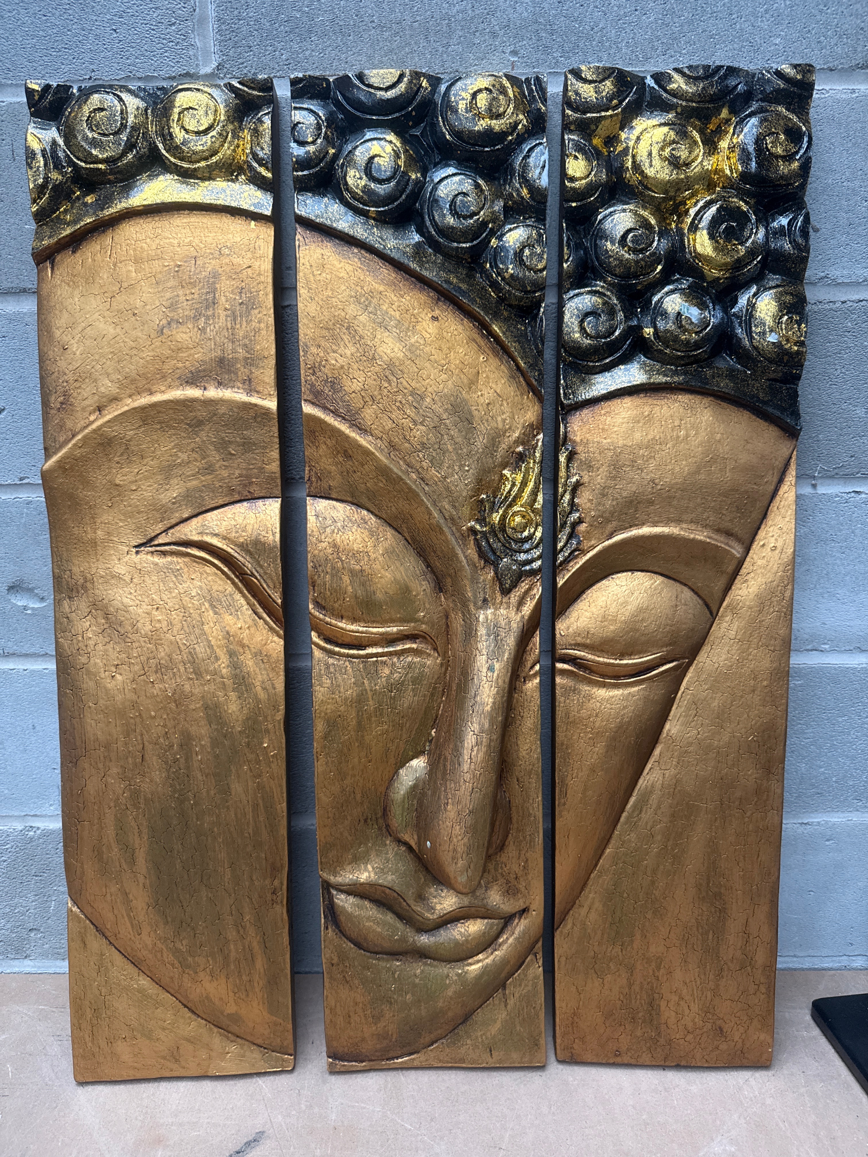 A three-panel Balinese hand carved wood relief sculpture depicting the serene face of a Buddha. The surface is finished with a gold-tone metallic paint or leaf, featuring an intentional crackle effect, and accented with textured black detailing on the stylized hair curls and the flaming urna motif on the forehead. The panels are designed to be displayed with slight separations.