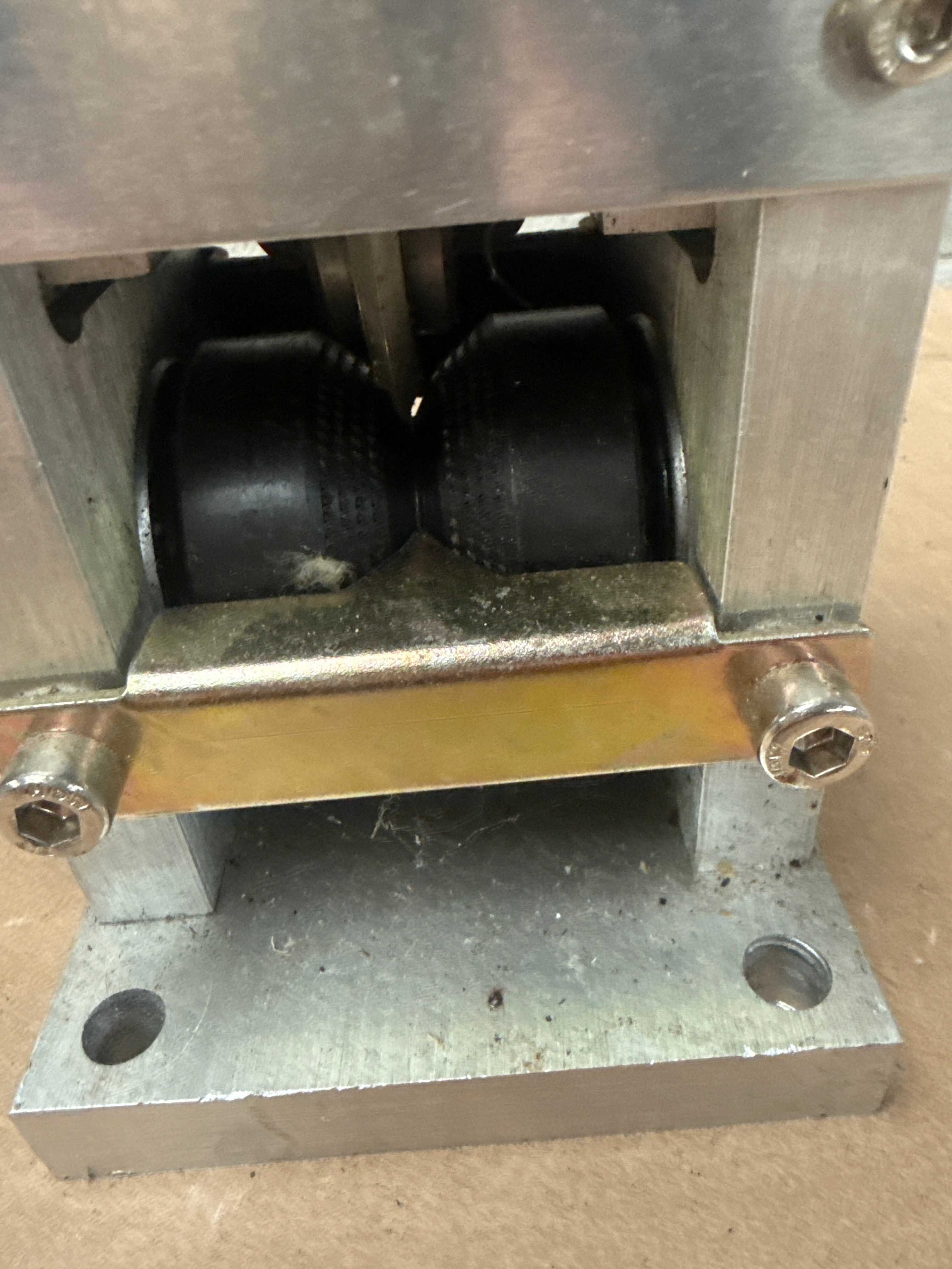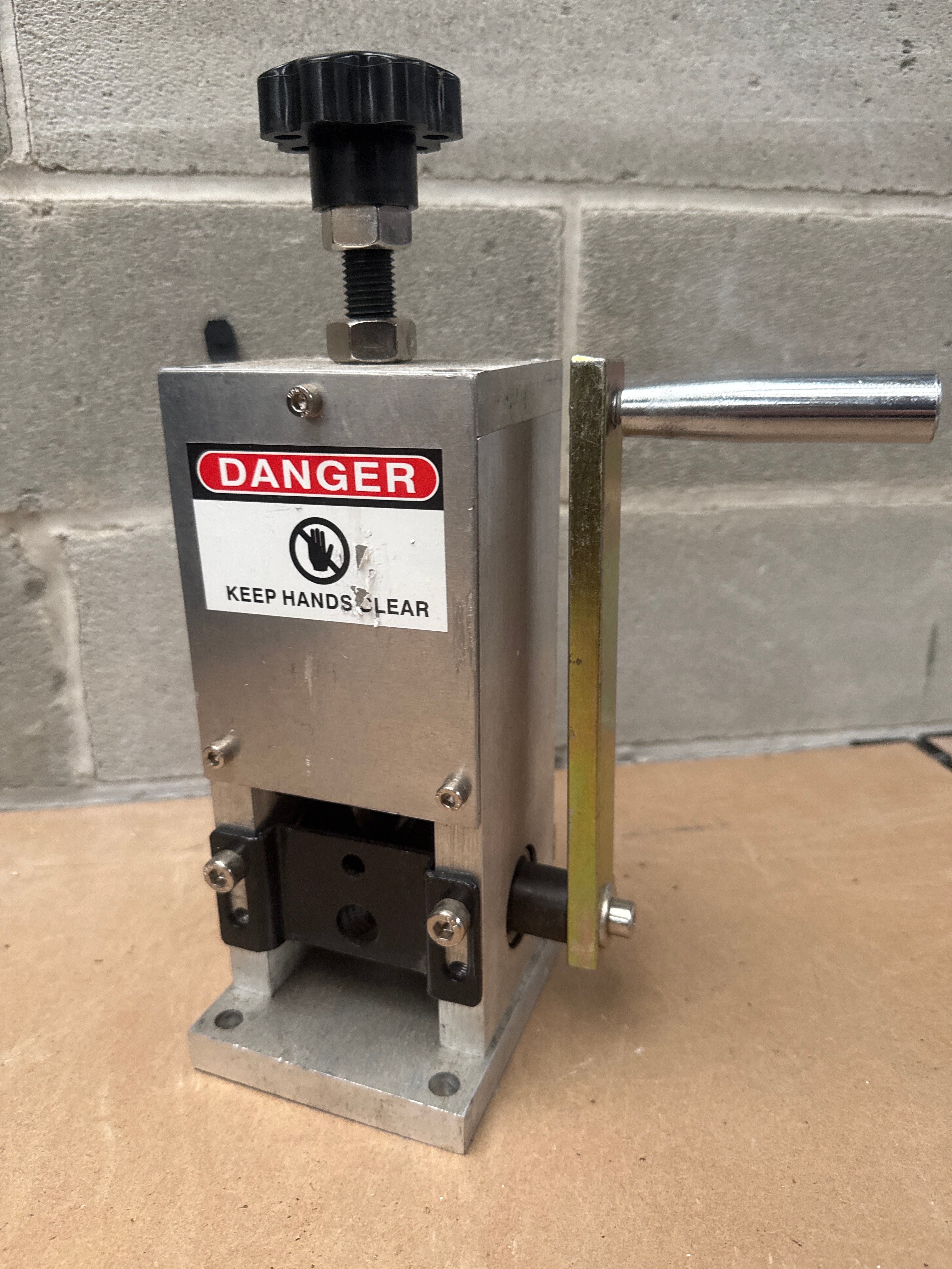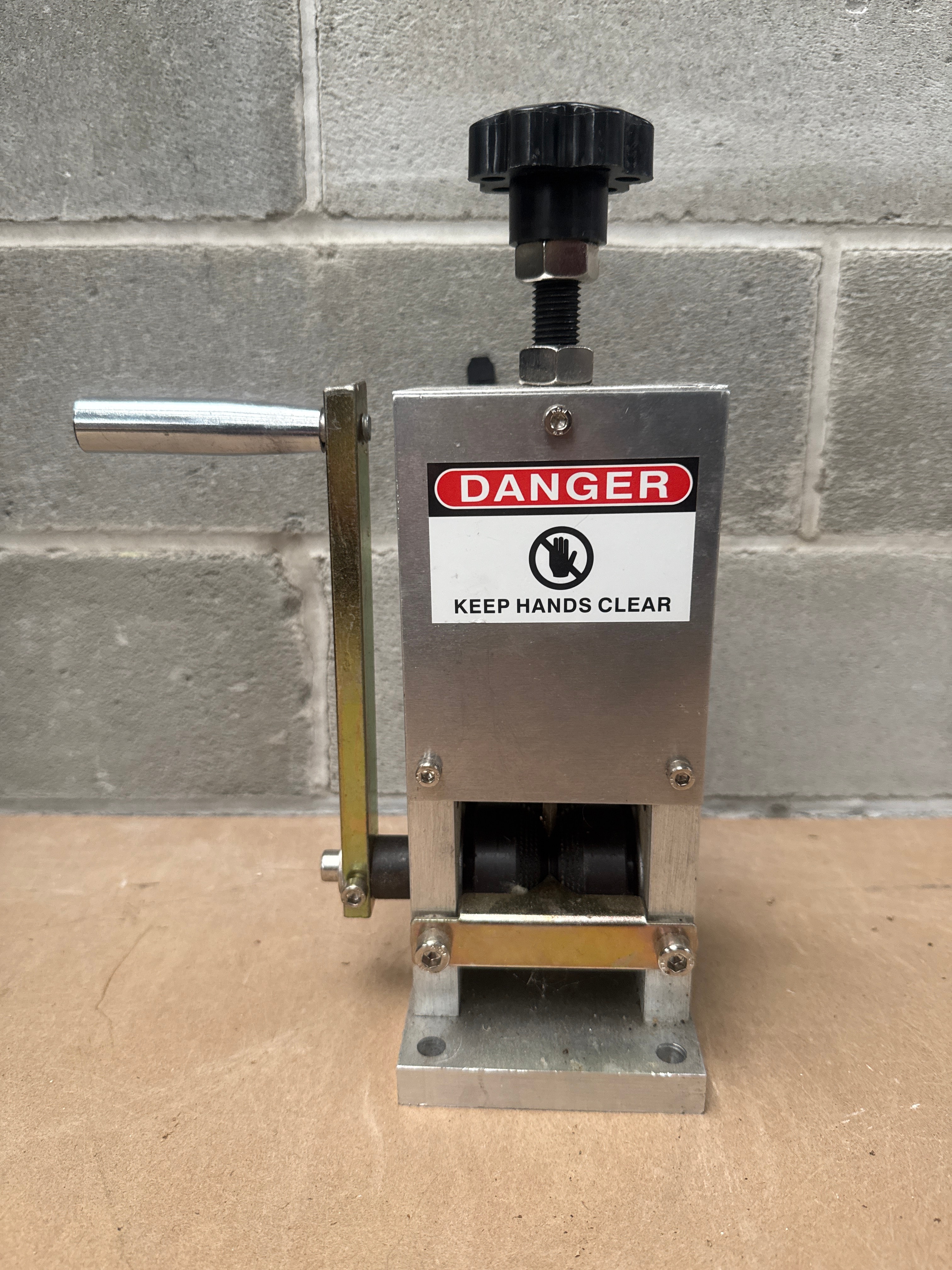 This item is a modern, industrial-style manual wire stripping machine, primarily constructed from silver-colored metal (likely aluminum or stainless steel) for its main body and base. It features a brass-toned metal plate around the rollers, a black plastic adjustment knob, and black rubber rollers. A prominent warning label on the front features a red “DANGER” banner, a ‘do not touch’ symbol depicting a crossed-out hand, and the text “KEEP HANDS CLEAR” in white. Web intelligence indicates such machines are designed for stripping scrap copper wire, capable of being operated manually via a hand crank or powered by an electric drill, typically handling wire diameters ranging from approximately 1.5mm to 25mm (0.06 in. to 1 in.).