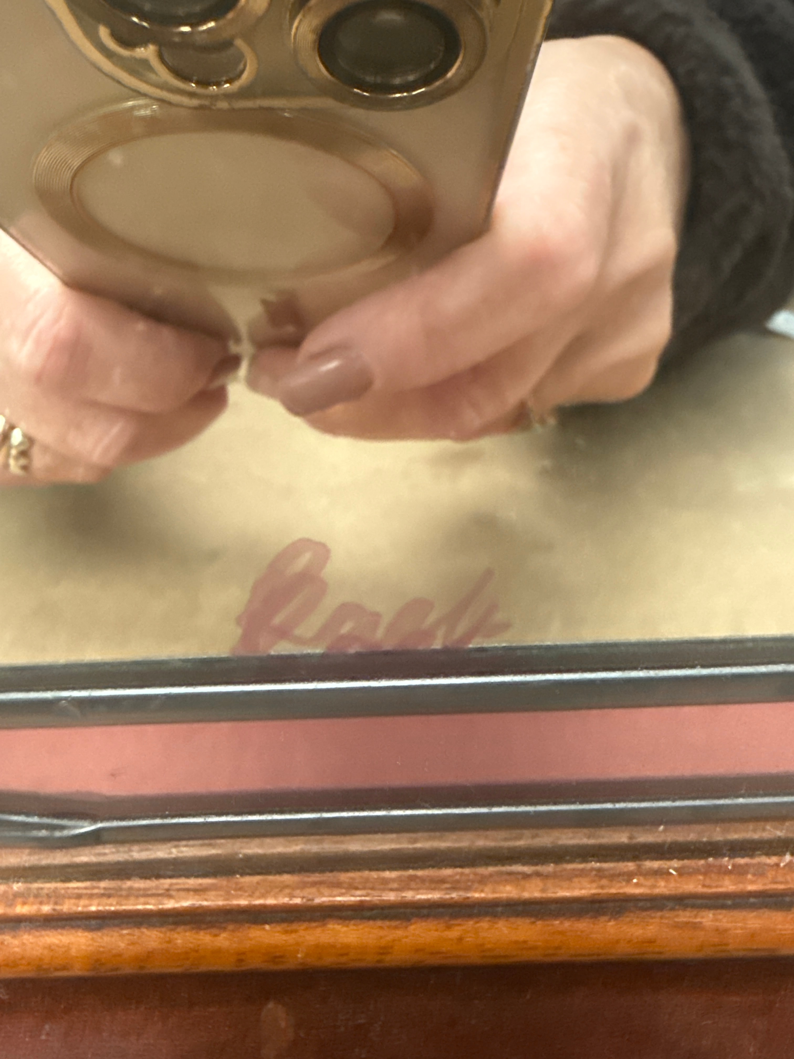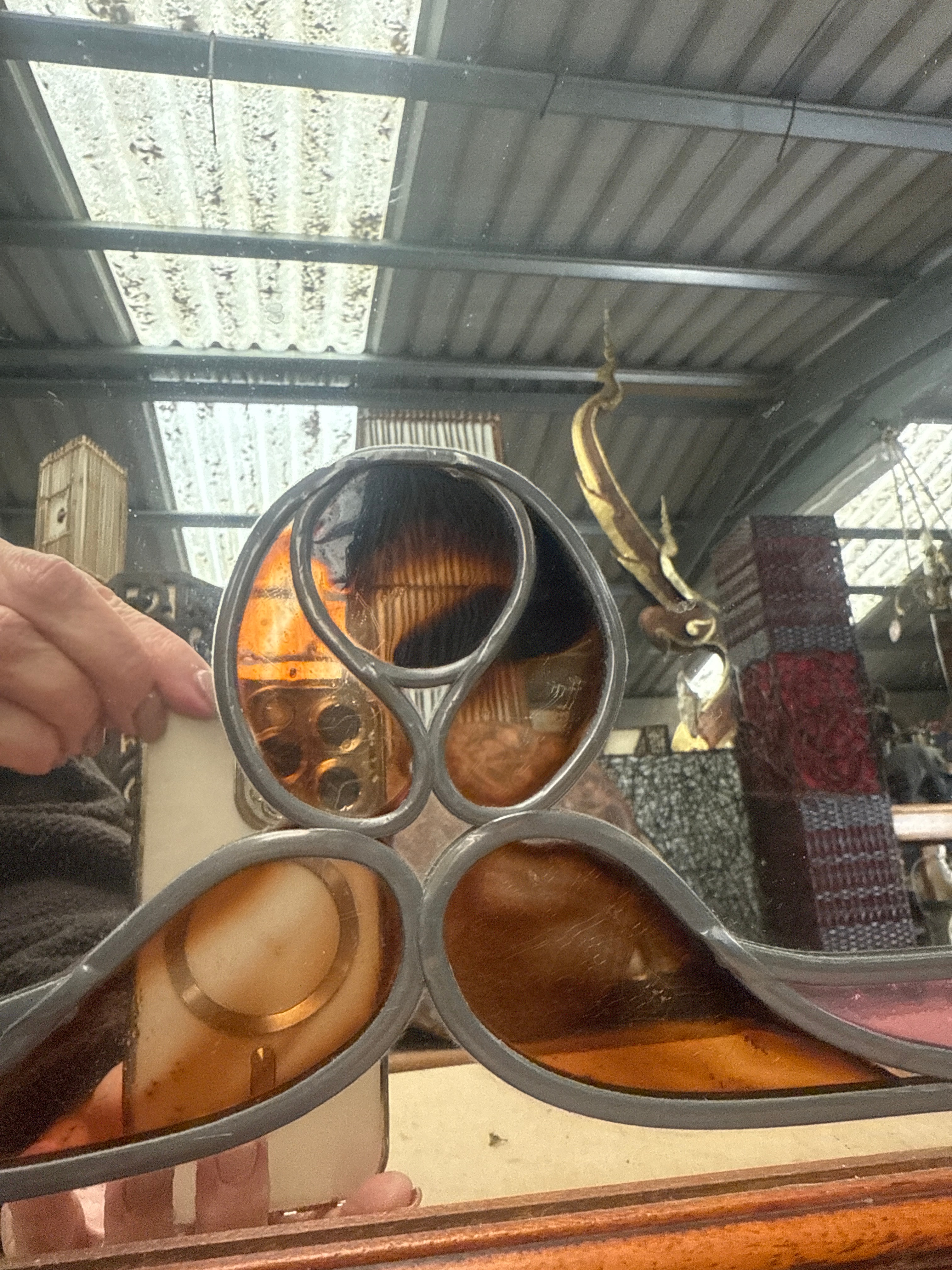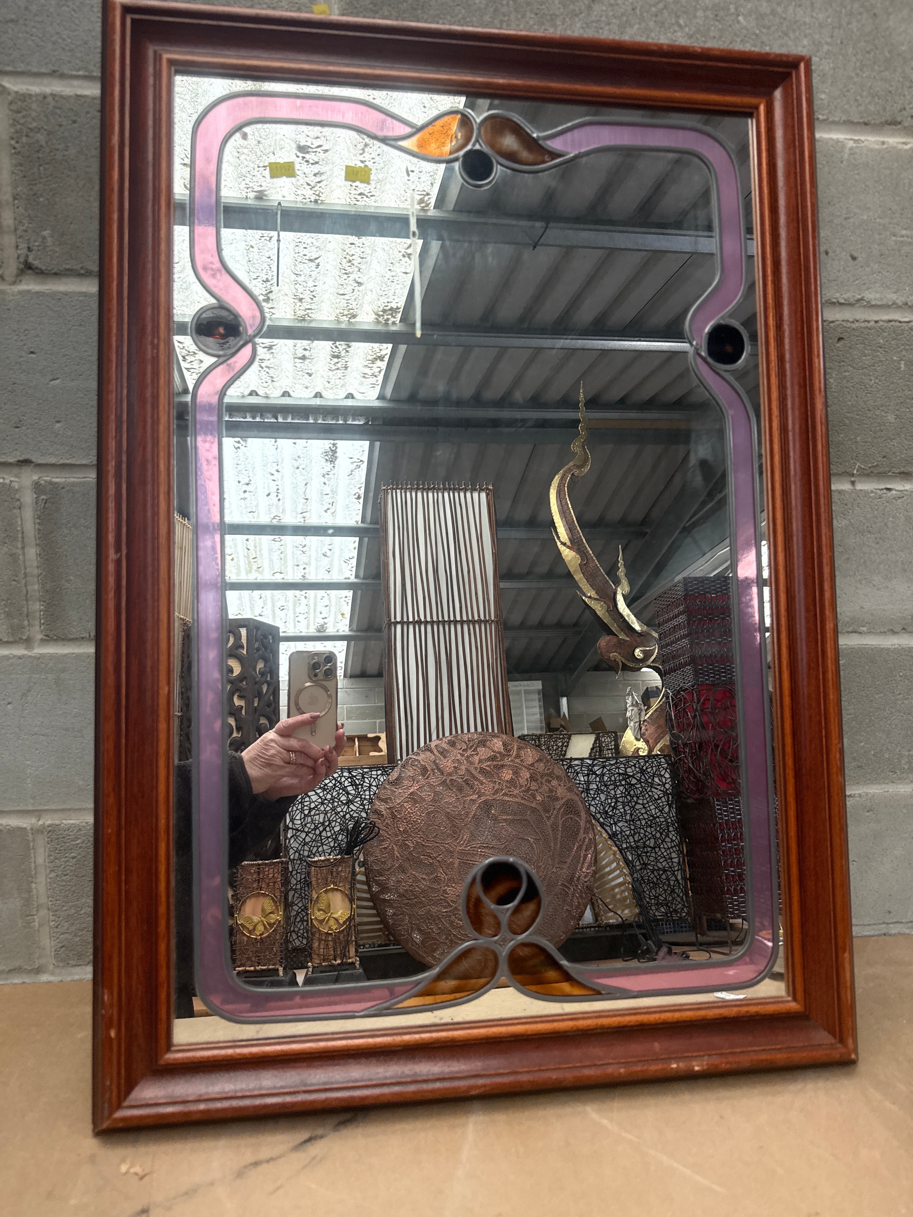 A rectangular wall mirror, featuring a reddish-brown wooden frame and a central mirrored panel. The mirror is adorned with a decorative leaded glass border, characterized by organic, flowing shapes in shades of pale purplish-pink, amber, and frosted or clear textured glass, suggesting a mid-20th century to contemporary style. A faint reflection of script text, possibly “Haas” or “Haus,” is visible on the mirror surface, though it does not appear to be a permanent marking on the item itself.