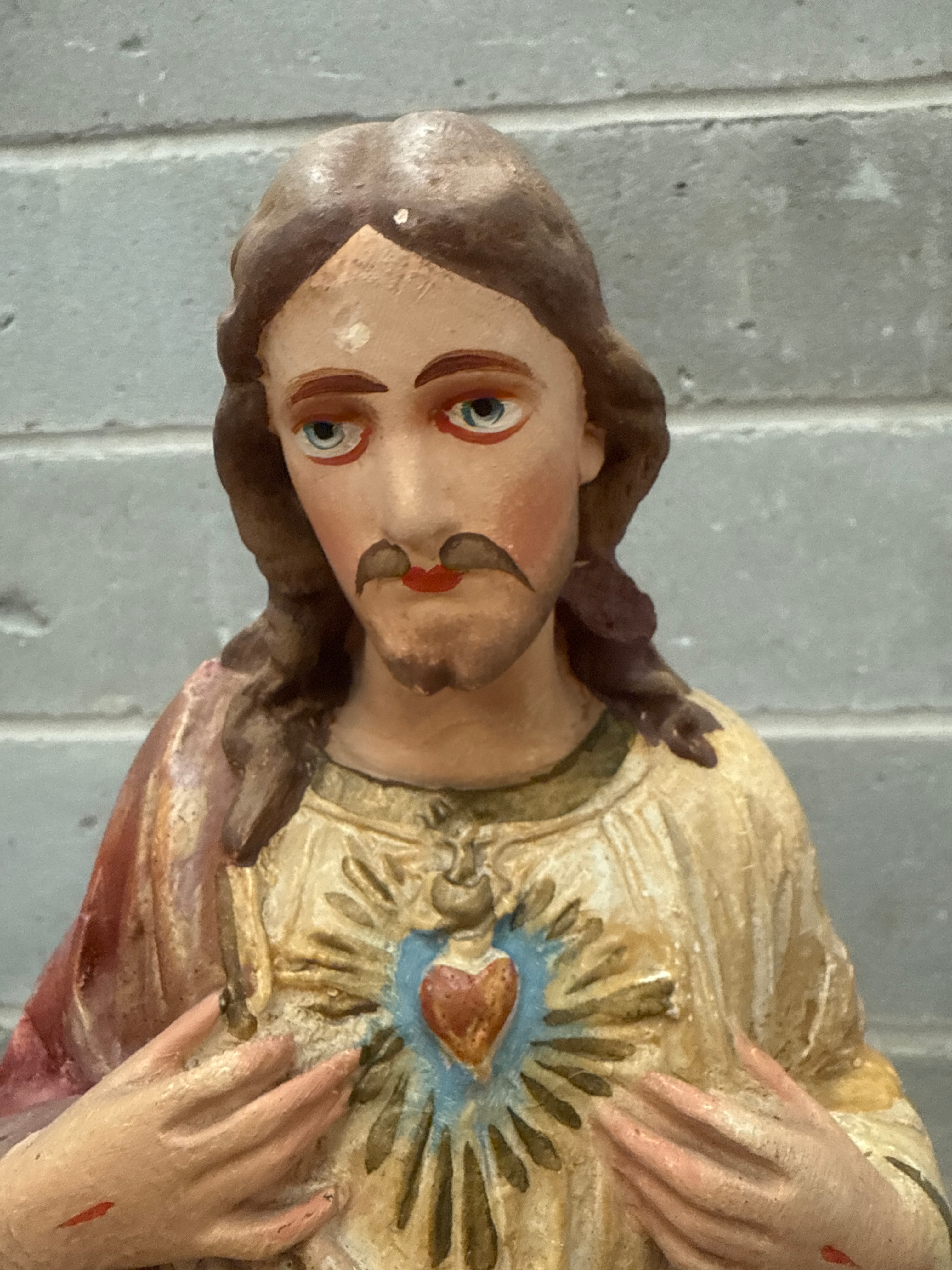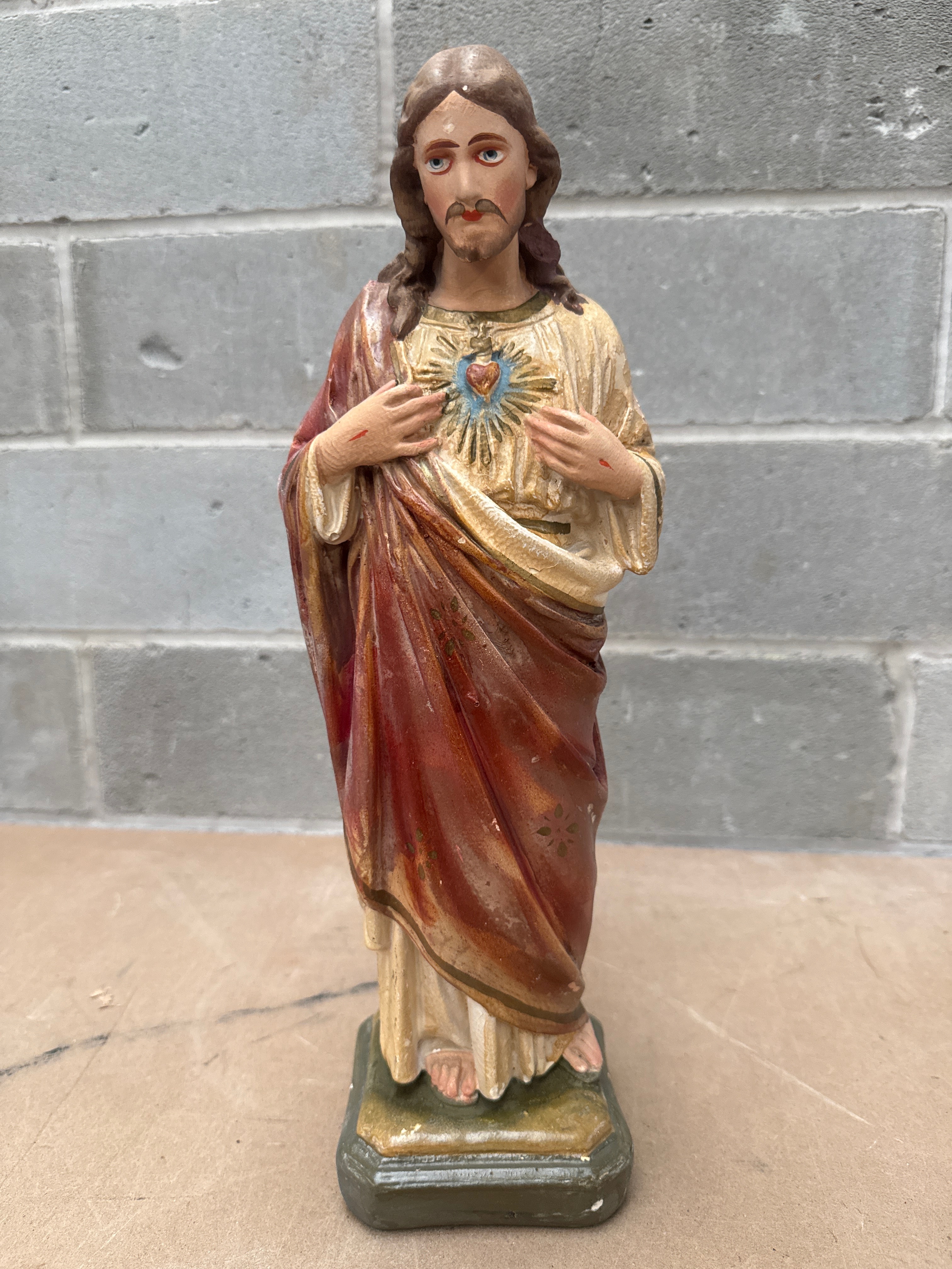 A vintage polychrome religious figurine depicting Jesus Christ as the Sacred Heart, crafted from Chalk. The figure stands on a rectangular base, dressed in a cream tunic and a deep red mantle, with both hands raised towards his exposed Sacred Heart emblem, which features a central red heart with a blue outline, surrounded by golden rays and flames. Distinctive features include long brown hair, a mustache and beard, and red stigmata-like markings on the back of each hand. The piece exhibits a traditional devotional style with hand-painted details.