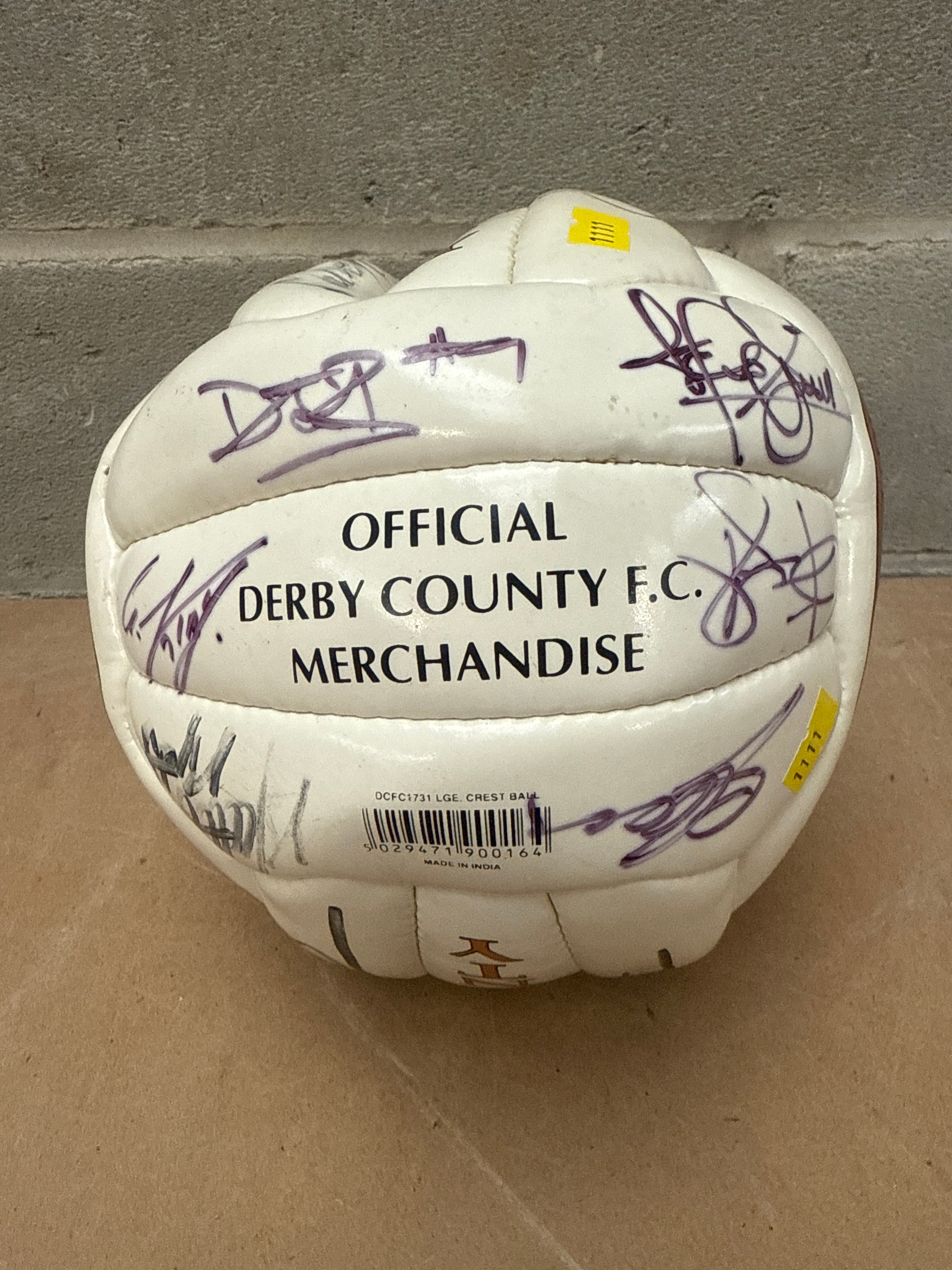 A white, modern-era synthetic football, officially identified as “OFFICIAL DERBY COUNTY F.C. MERCHANDISE” and a “DCFC1731 LGE CREST BALL”. The ball bears the barcode “5029672000164” and is marked “MADE IN INDIA”. It is covered with numerous handwritten signatures in both black and purple marker. One panel features a circular logo indicating size “S” (likely size 5), along with inflation instructions that include “DEFALTE”, “MOISTEN NEEDLE”, “INFLATE TO 8 LBS.”, and “PRESSURISED AIR”. Small stickers are present on the surface, one of which is marked “1111”.