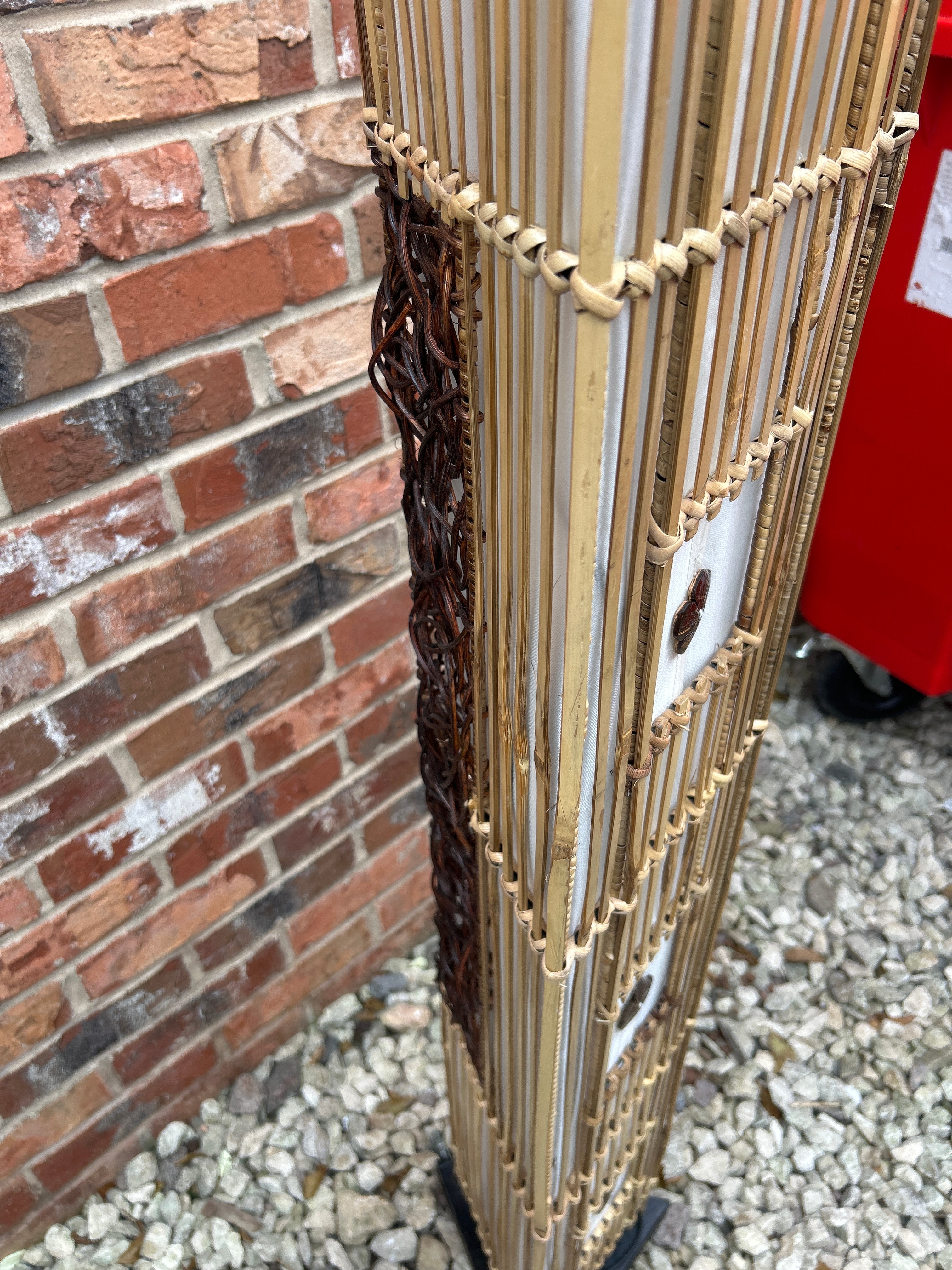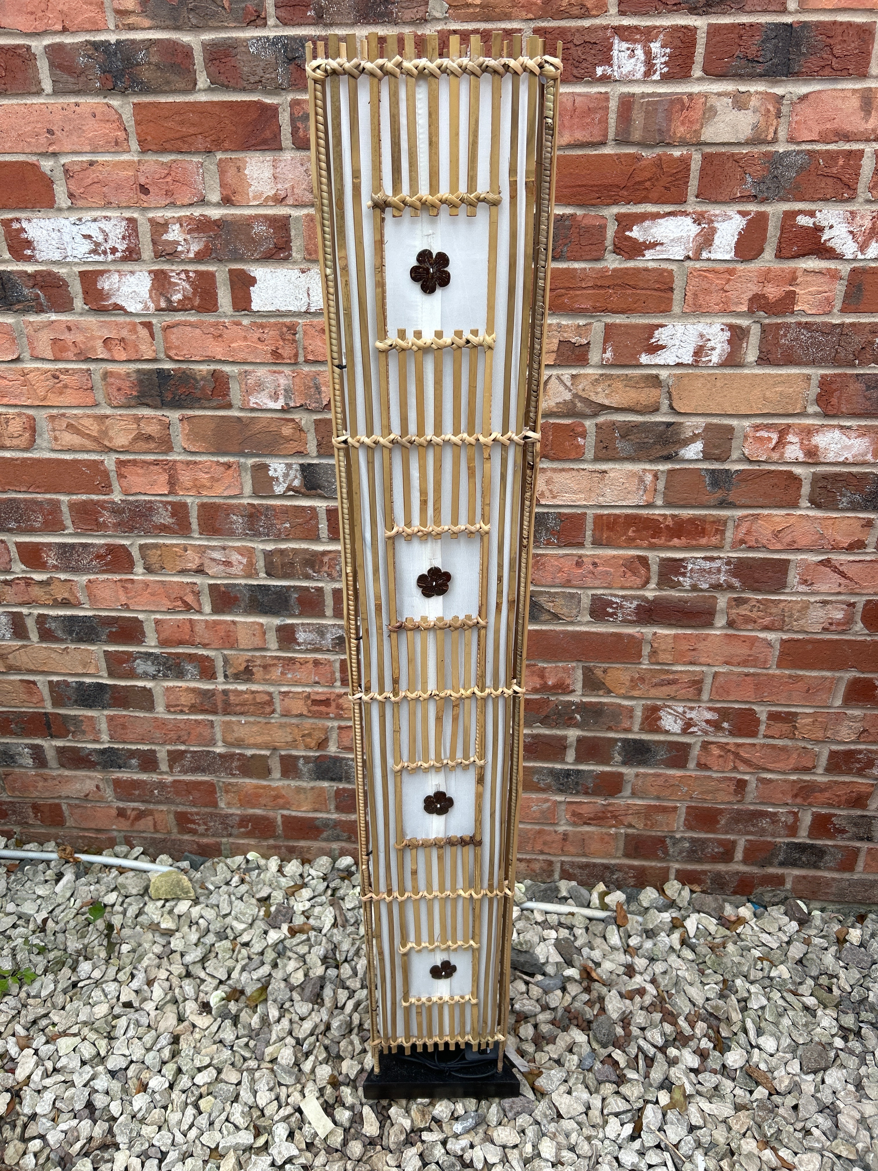 A tall, rectangular-prism shaped floor lamp, exhibiting a Mid-Century Modern or Bohemian aesthetic. Constructed from vertical bamboo poles, interwoven with lighter natural fibers. It features several internal white diffusing panels, each adorned with a small, dark, flower-shaped appliqué. One side also incorporates darker, possibly wicker or rattan, woven detailing. The item rests on a dark-colored base, likely wood or metal. Made in Thailand.