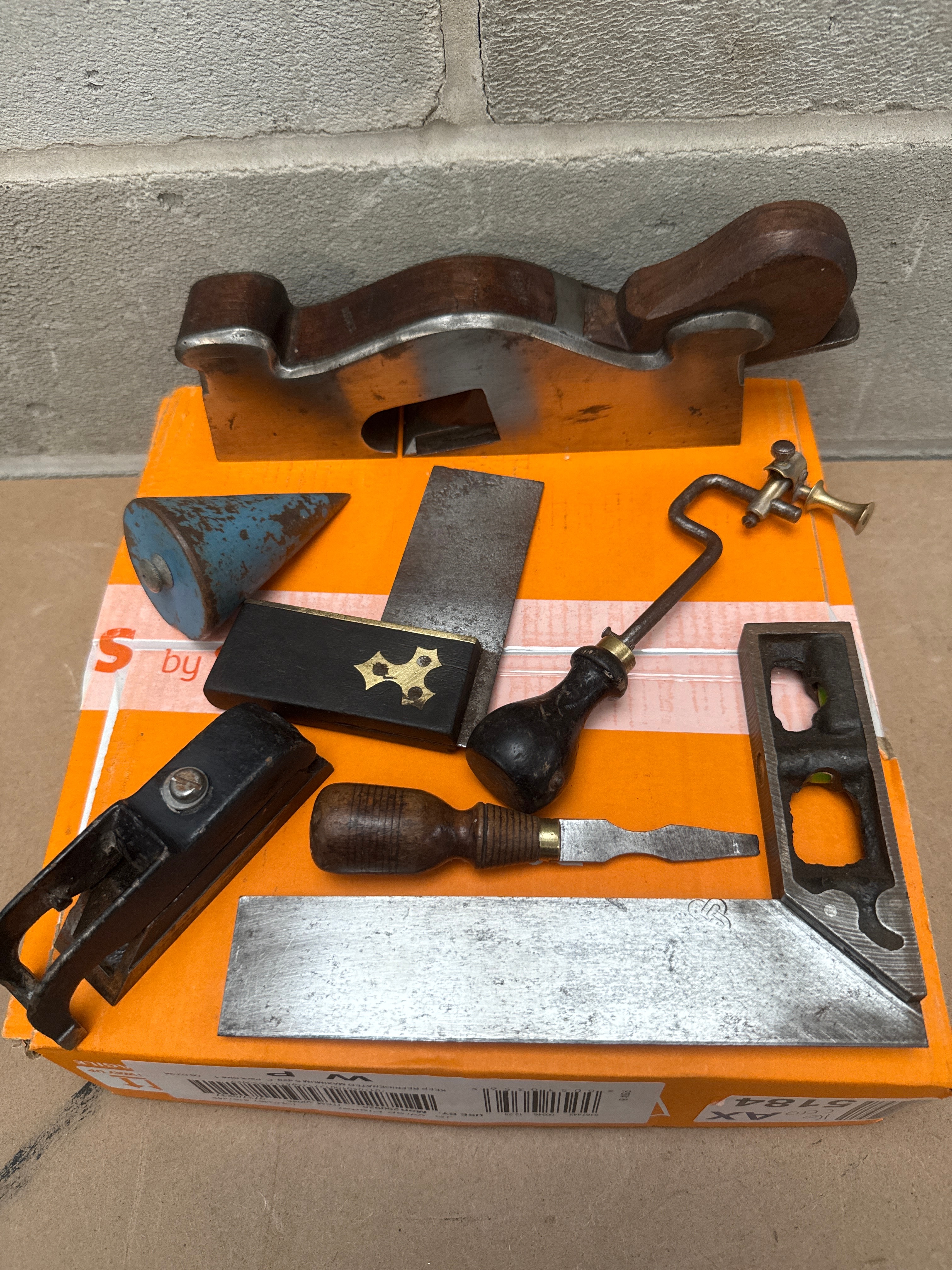 A collection of utilitarian craftsman woodworking hand tools, likely dating from the late 19th to mid-20th century. The assortment comprises a large wooden-bodied hand plane with a metal sole, two smaller metal hand planes (one black-painted, one conical and blue-painted, likely a sharpening stone or honing guide), a small dark wooden try square or marking gauge head with distinctive brass inlay, a curved metal auger-like tool with a dark wooden handle and brass adjustment, and a smaller wood-handled carving tool with a brass ferrule. Completing the set are a flat metal ruler/blade and a cast iron or steel combination square head, the latter’s accompanying blade marked with ‘1’ and a stylized monogram. Constructed from various woods, steel, cast iron, and brass.