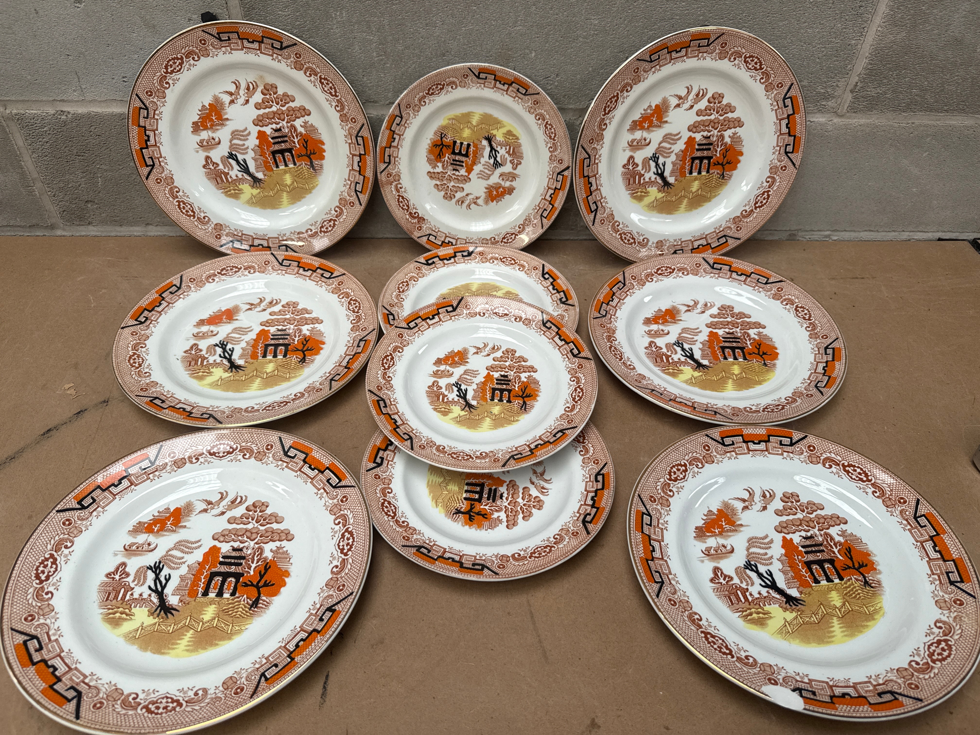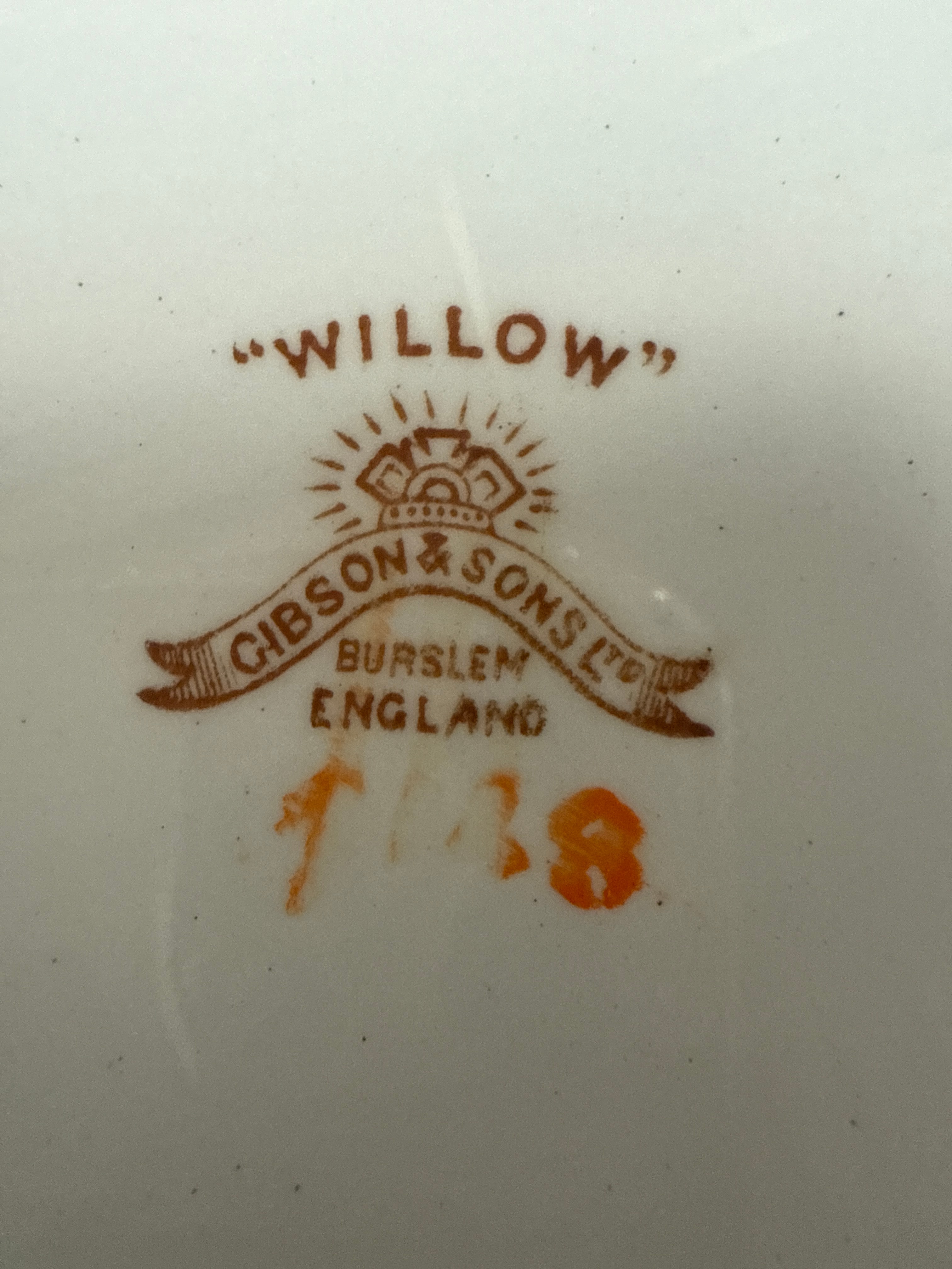 A set of 10 ceramic plates by Gibson & Sons Ltd, Burslem, England, in the ‘Orange Willow’ pattern. Each plate features a multi-color transferware decoration in shades of orange, brown, gold, and black on a white ground. The Chinoiserie landscape depicts pagodas, bridges, trees, and birds, bordered by a geometric and floral design, and rimmed in gold. The plates vary in size. The reverse of one plate bears a printed maker’s mark featuring a crown motif above a banner reading “GIBSON & SONS LTD”, with “BURSLEM ENGLAND” below, and the pattern name “‘WILLOW'”. An orange handwritten number “1138” is also visible.