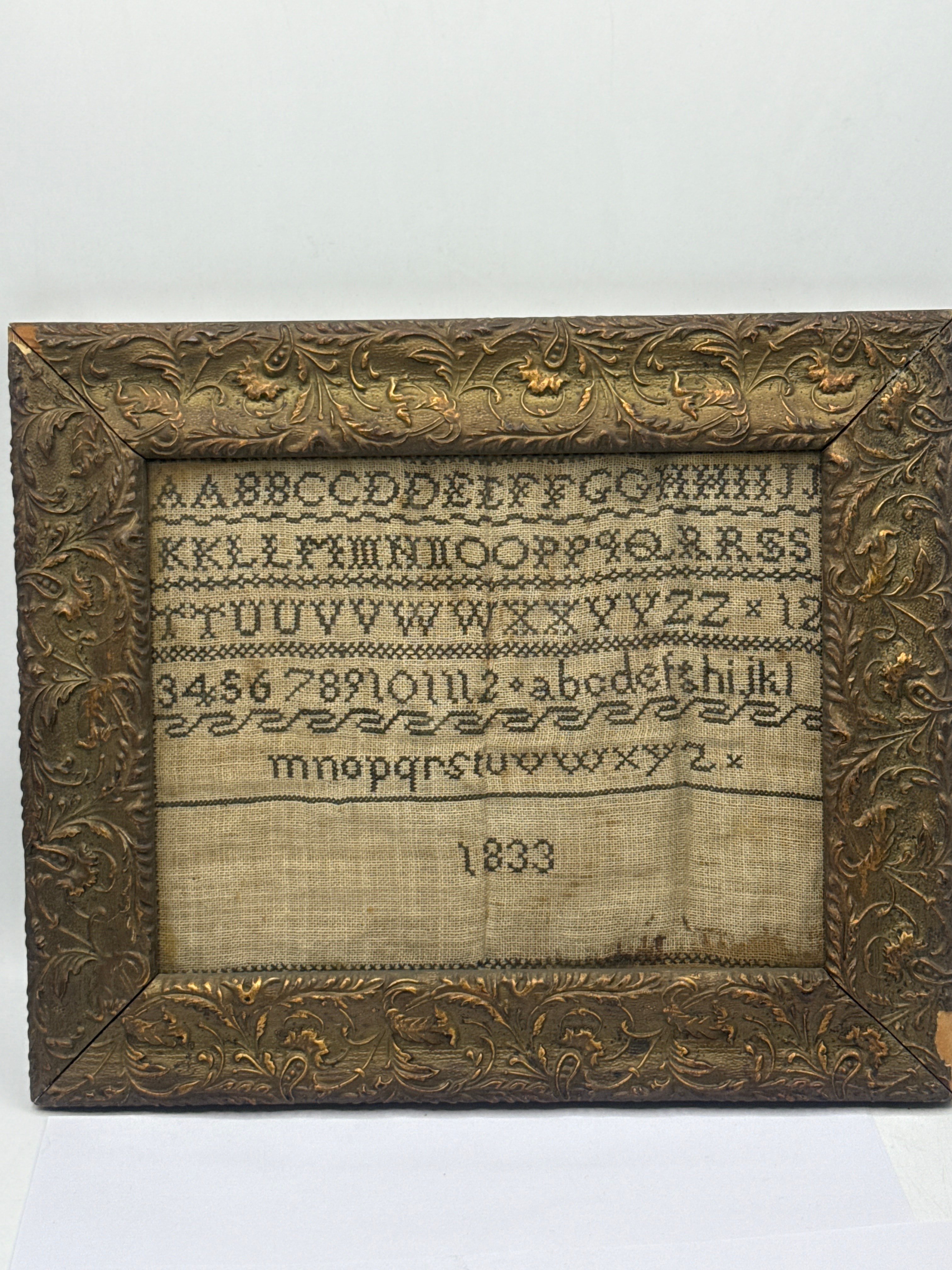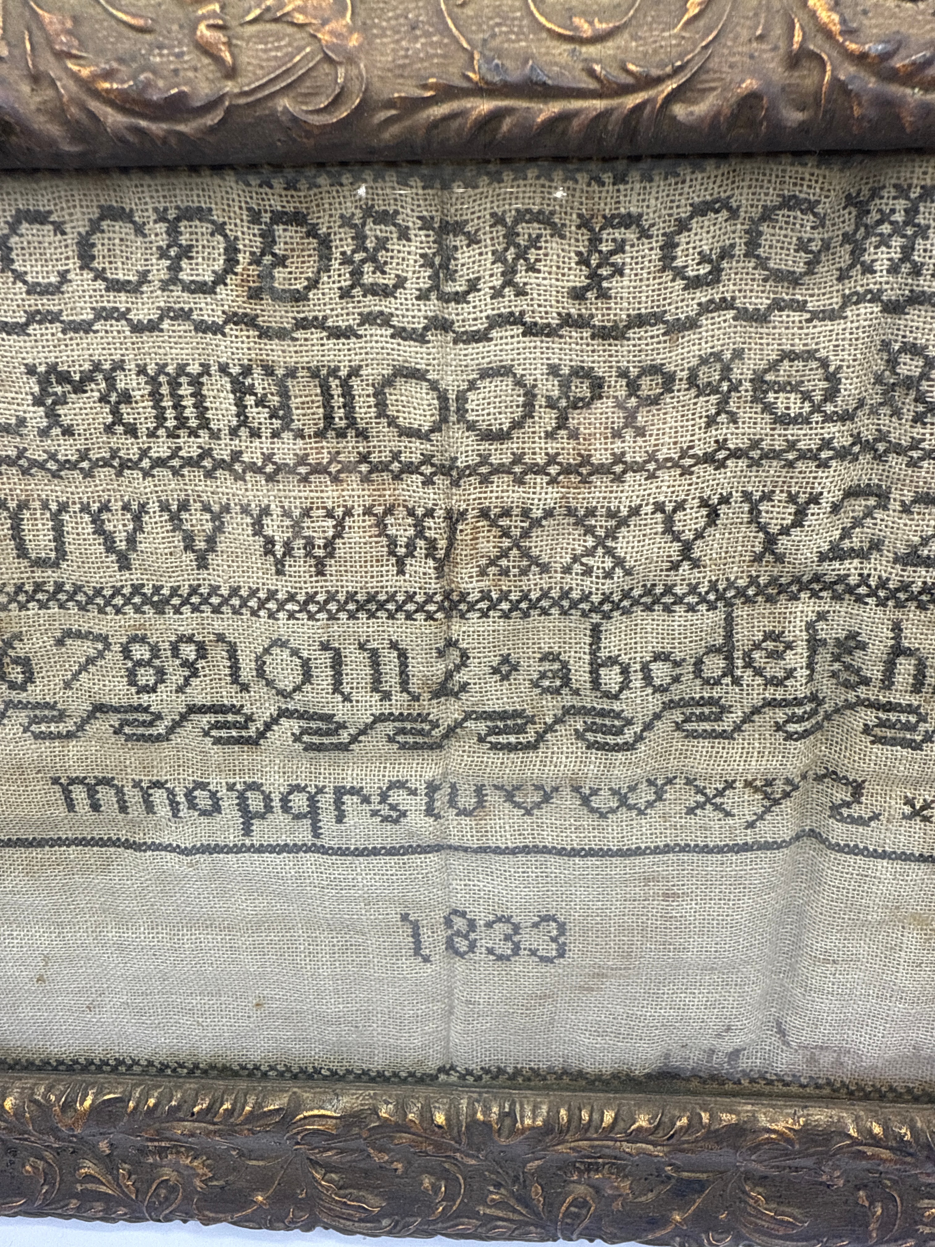 A framed needlework sampler featuring black cross-stitch embroidery on a natural-toned, likely linen or canvas fabric. The stitched composition includes multiple rows of uppercase and lowercase English alphabet letters, Arabic numerals 3 through 12, and various decorative borders. The prominent date “1833” is stitched at the bottom. It is presented in an ornate, possibly carved or gessoed and gilded/bronzed wooden frame, decorated with scrolling acanthus leaf motifs.