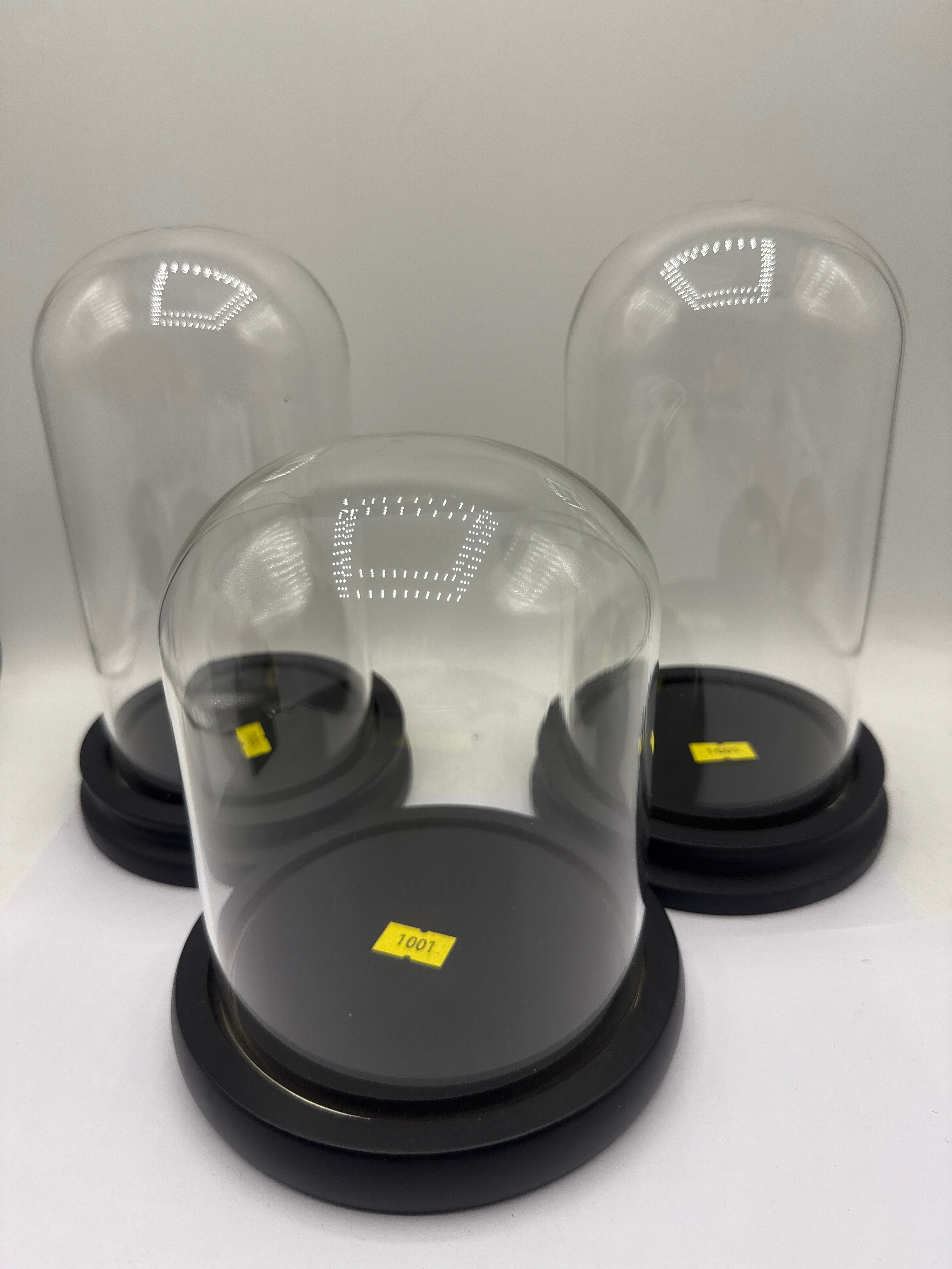 A lot comprising three contemporary bell-jar style display domes, or cloches. Each dome is crafted from transparent Glass and set upon a circular, stepped black base. The bases appear to be made of wood or a composite material with an opaque black finish. The items exhibit a minimalist aesthetic, with no discernible historical style or period-specific ornamentation. Each dome’s base features a small yellow sticker with the black numerical marking “1001.”