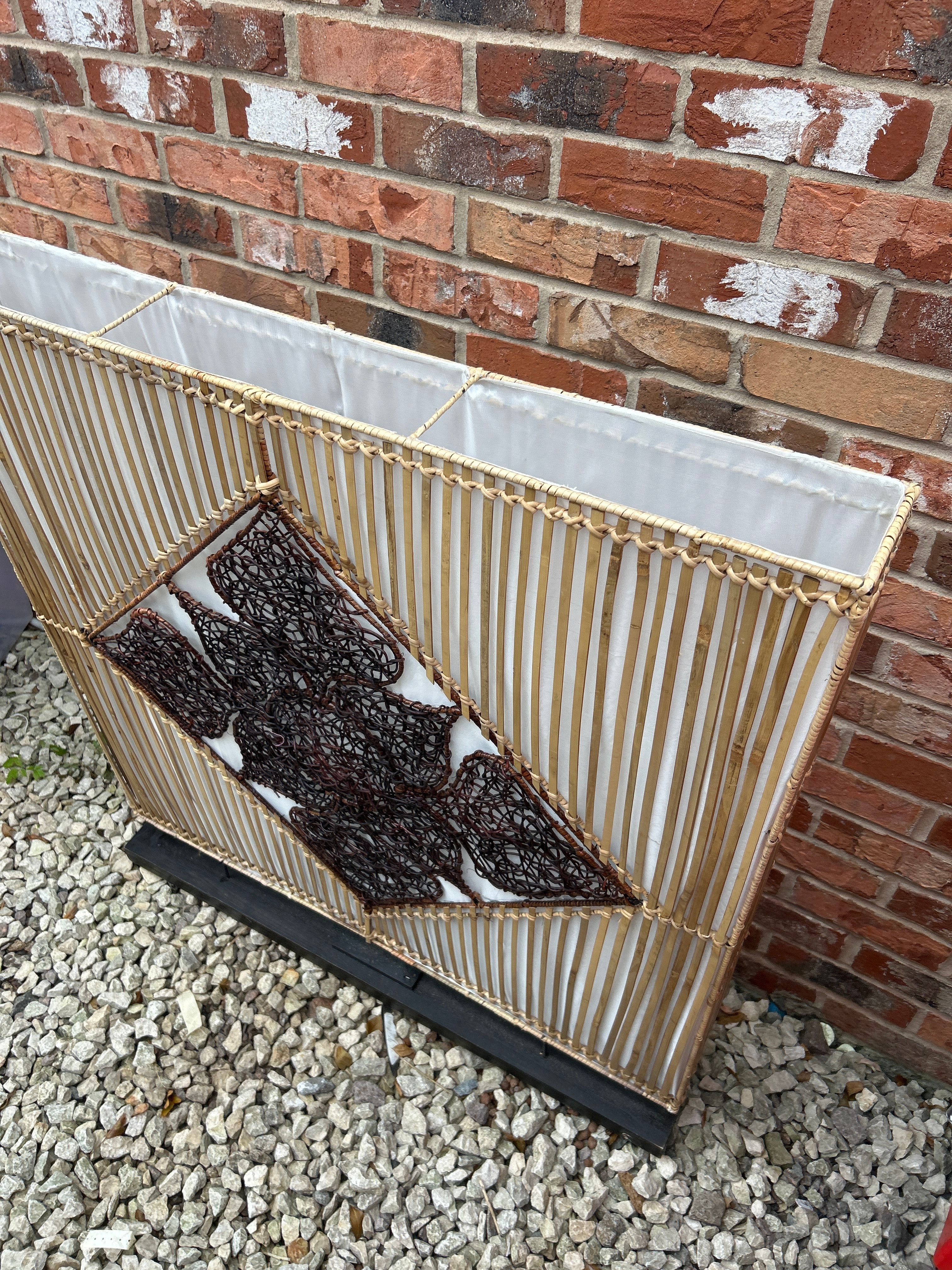 A Thai handmade decorative screen or room divider, constructed from vertical light-toned bamboo or rattan-like slats, secured with woven cord. The interior is lined with white fabric panels. The front features a central diamond-shaped appliqué with an abstract, multi-lobed floral or organic motif, crafted from dark, tangled fibers, possibly dyed rattan or string, set against a white ground. The piece rests on a dark-stained or painted base. Made in Thailand.