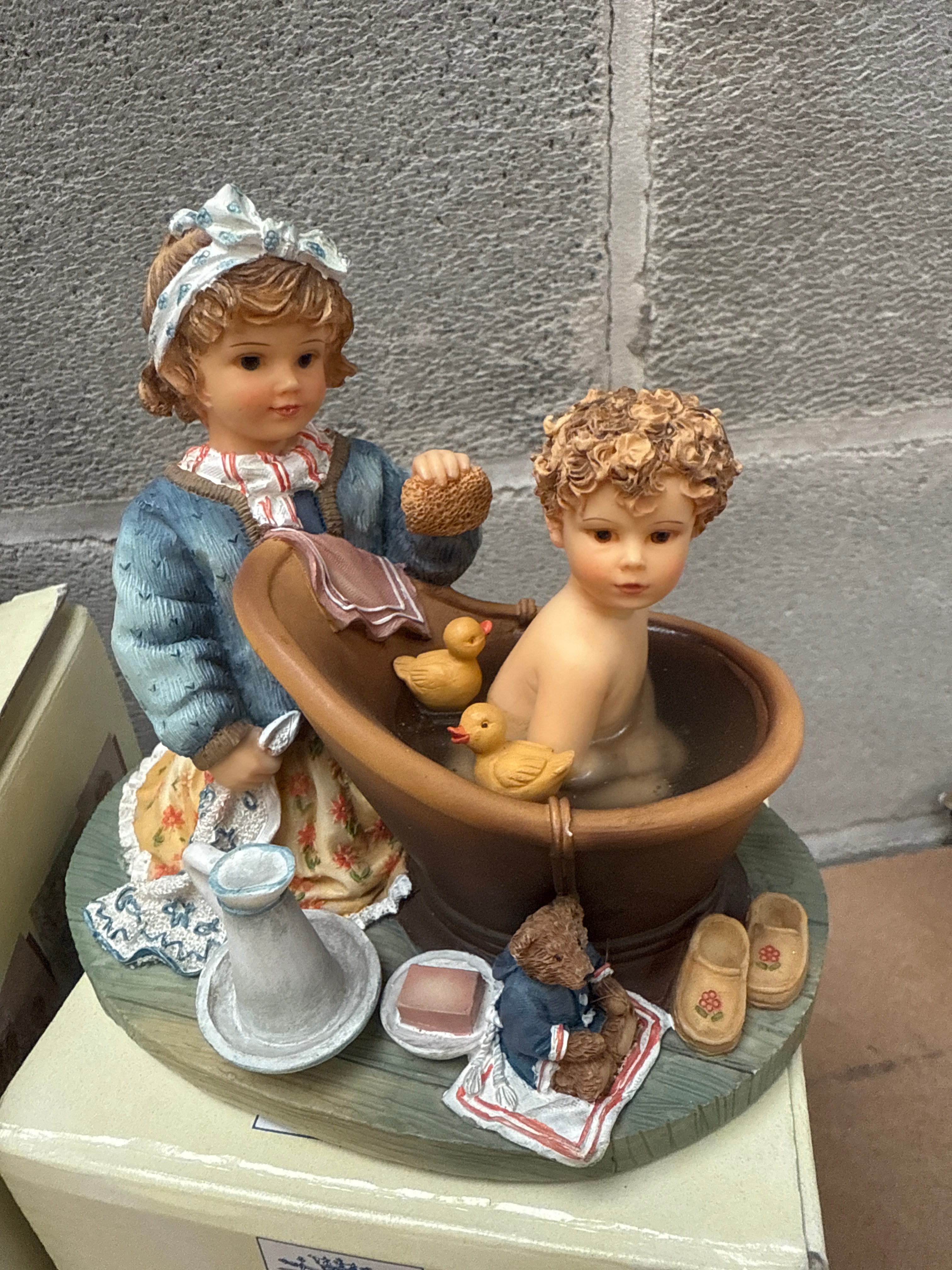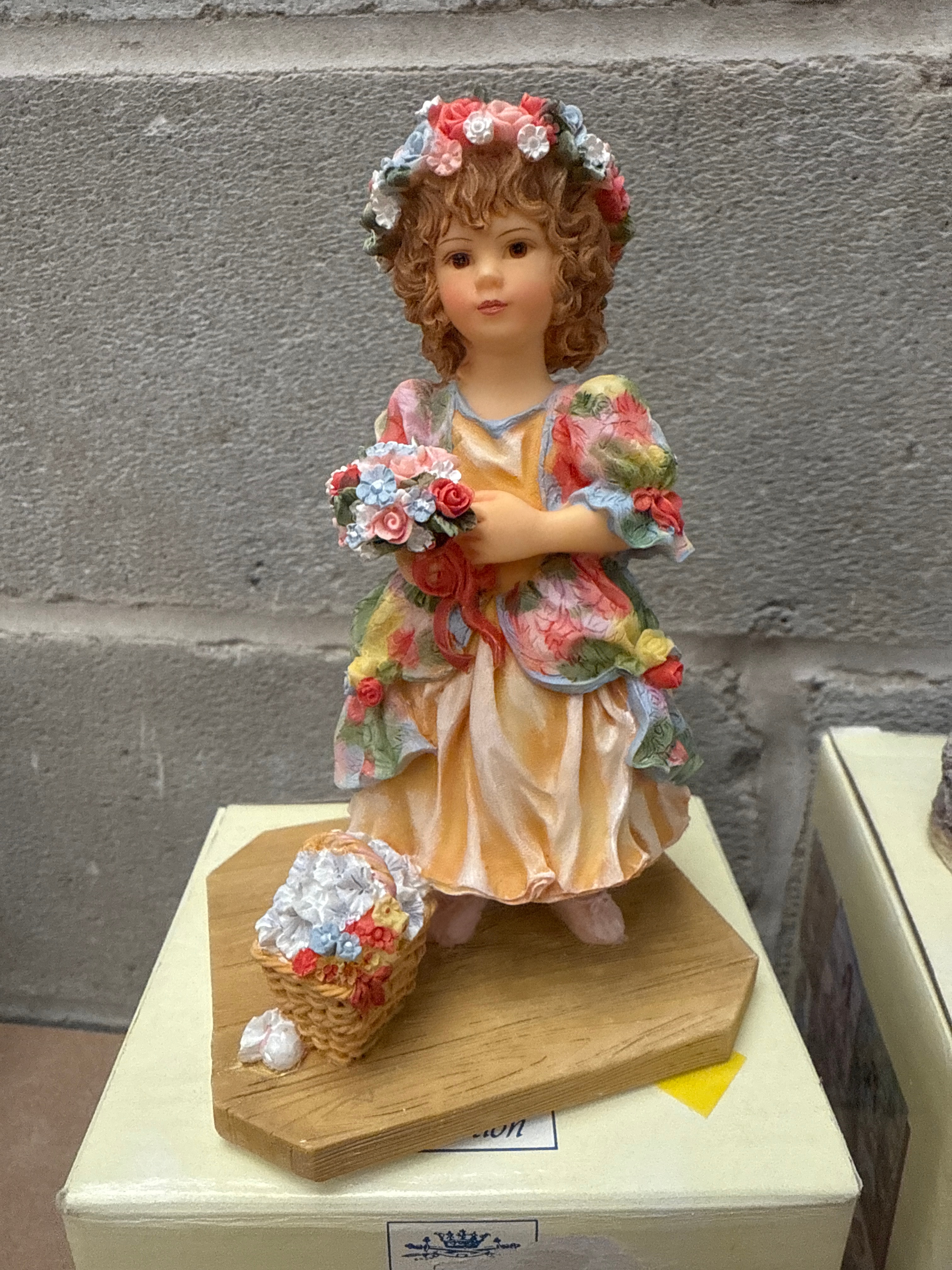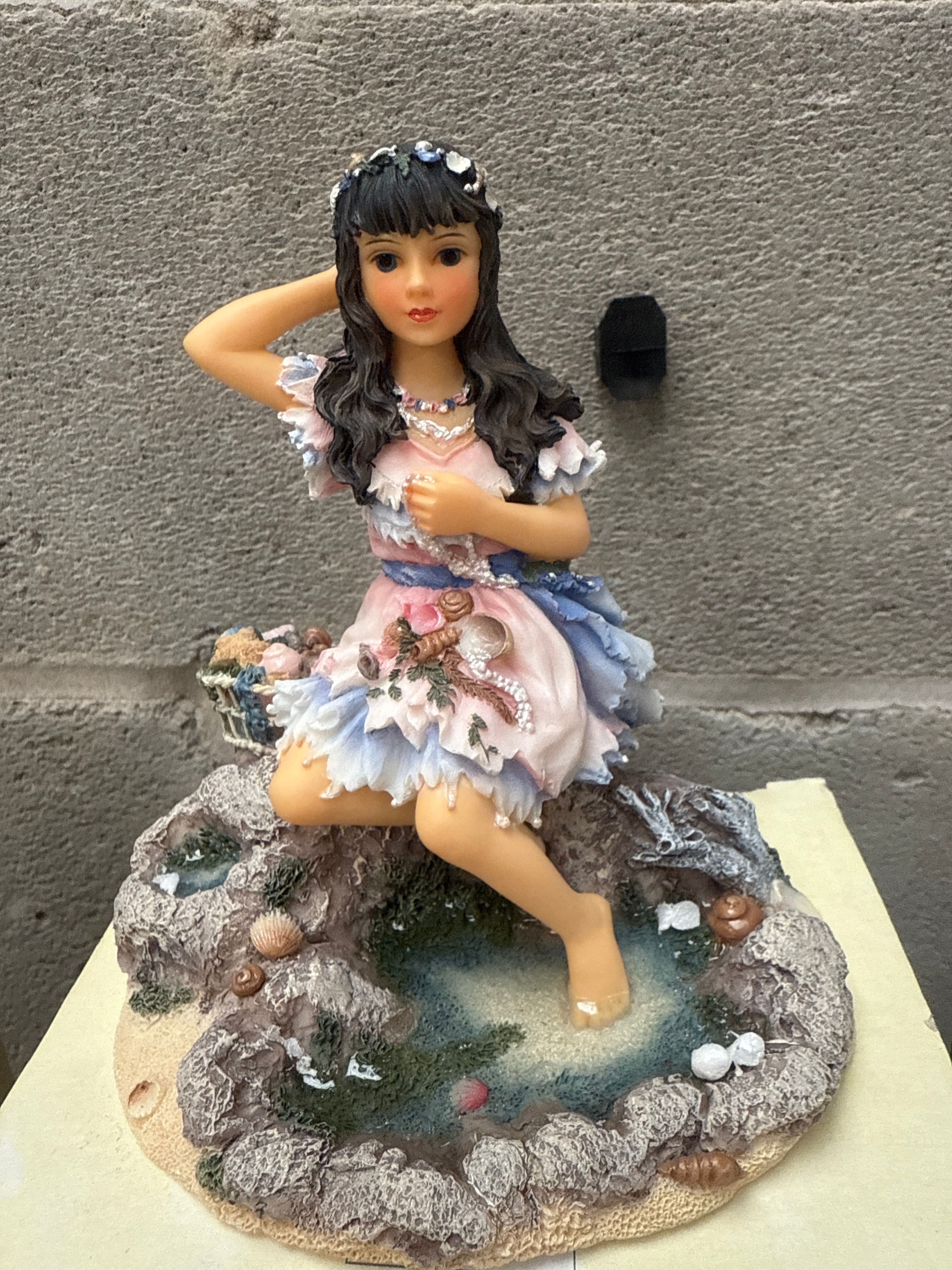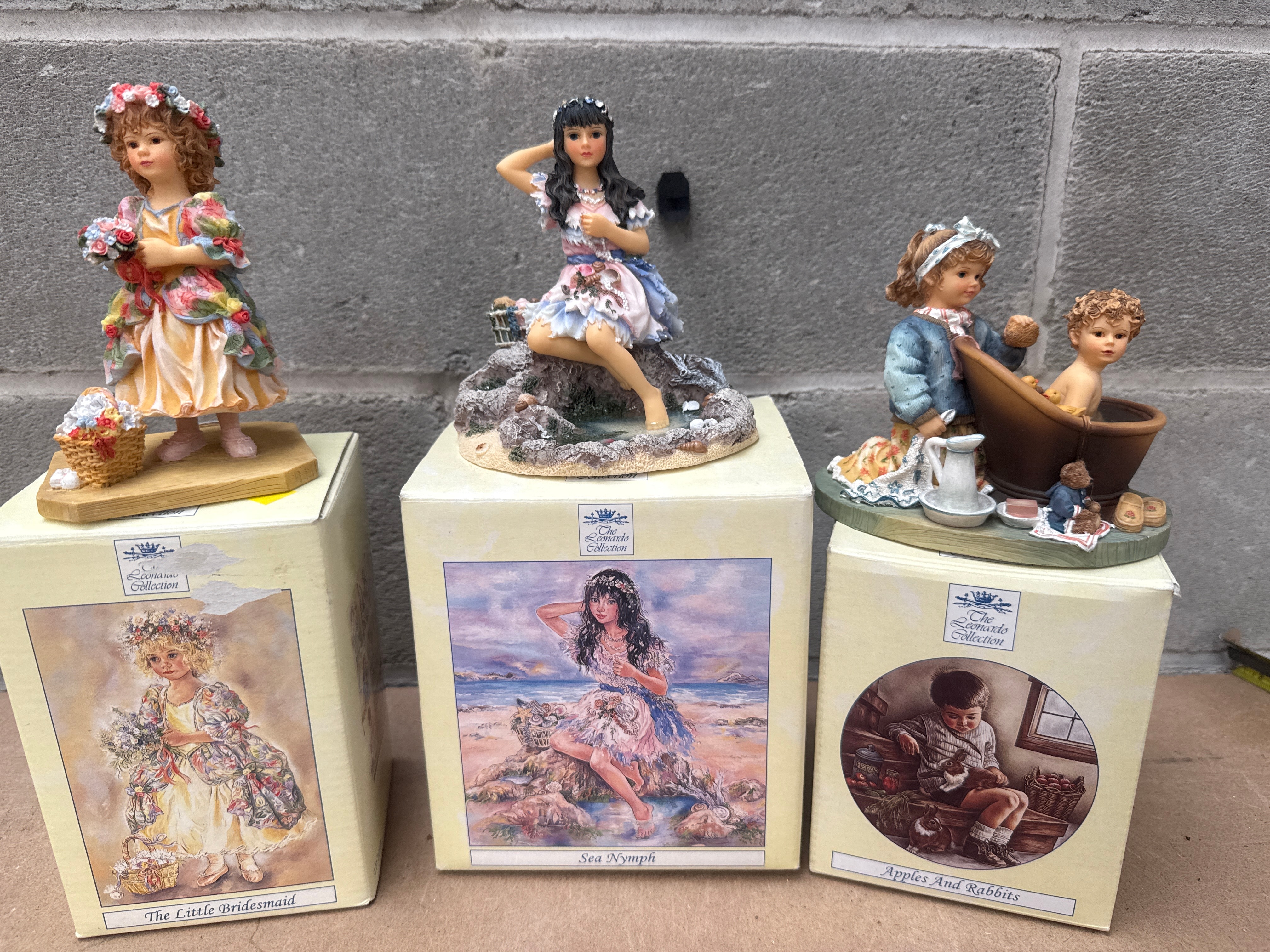 A group of three painted resin figurines by Christine Haworth for The Leonardo Collection. The lot comprises ‘The Little Bridesmaid’, depicting a young girl holding flowers; ‘Sea Nymph’, featuring a young female figure seated on a rocky outcrop; and ‘Apples and Rabbits’, illustrating an older child bathing a younger one. Each figurine is crafted from painted resin in a sentimental and whimsical style, characteristic of modern collectible series. All figurines are presented with their original printed cardboard boxes. Please note: The box accompanying the ‘Apples and Rabbits’ figurine is incorrect for the depicted bathtub scene.