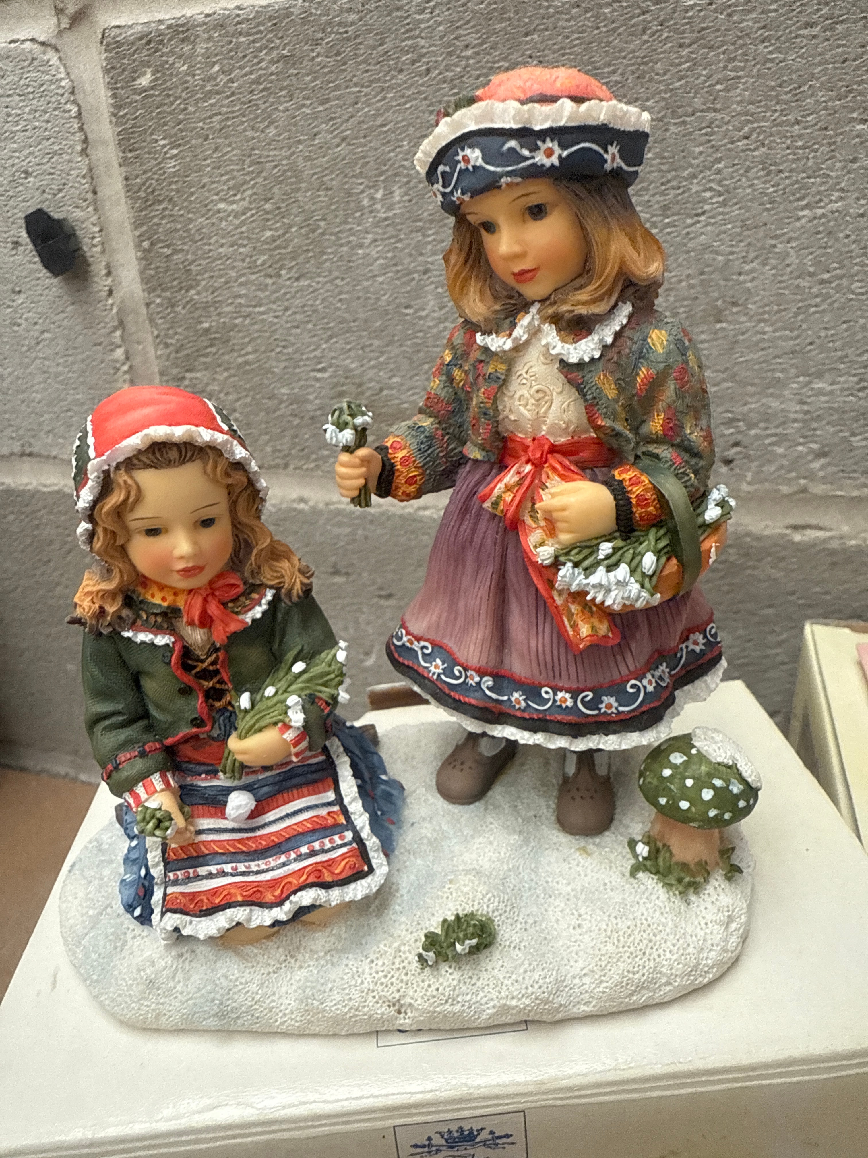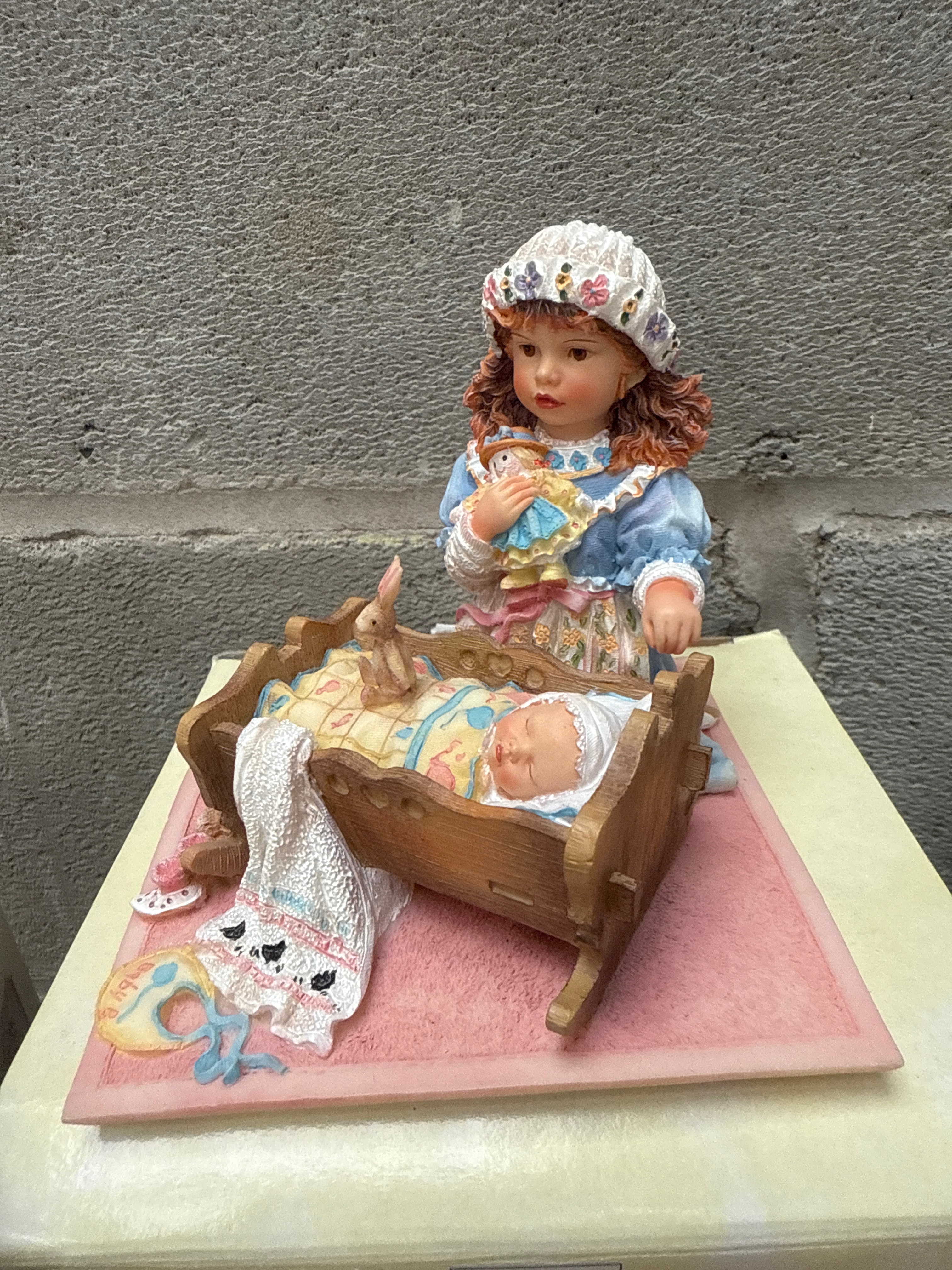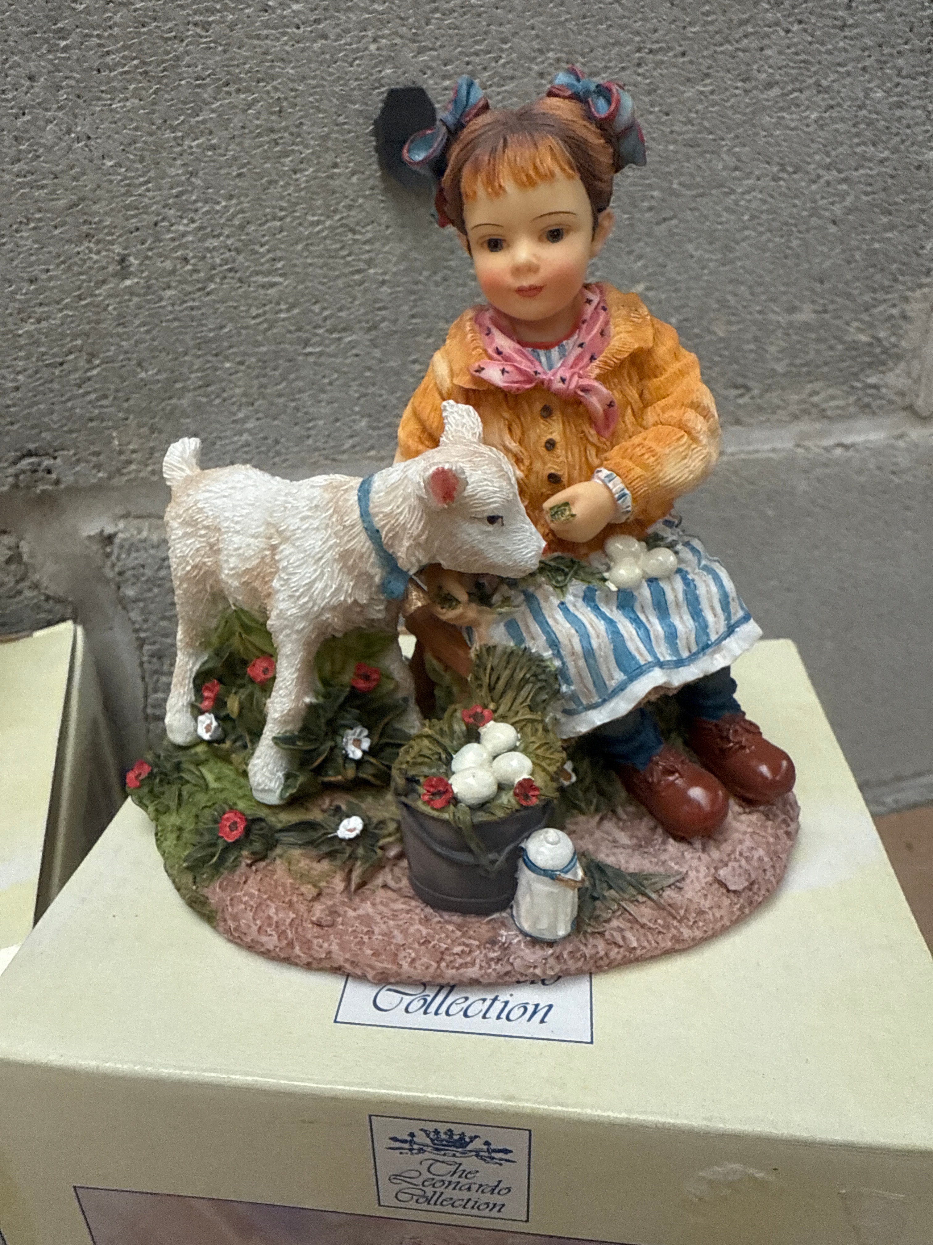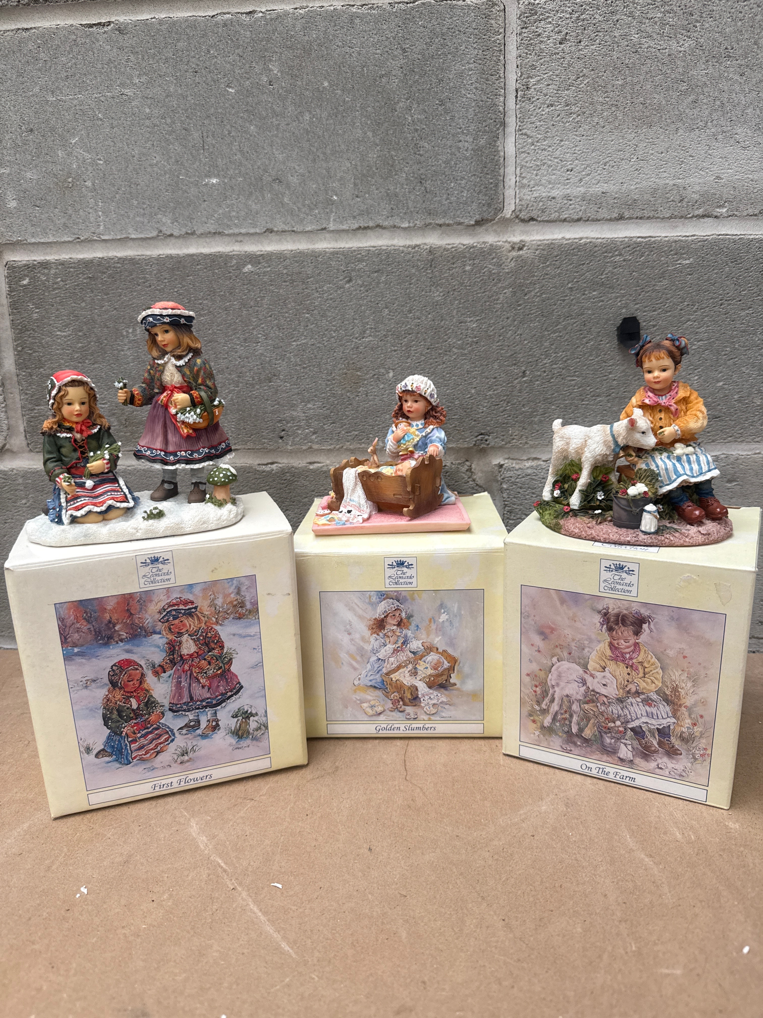A group of three hand-painted resin figurines from The Leonardo Collection, designed by Christine Haworth. Each figurine depicts young girls in sentimental, pastoral scenes. The lot includes ‘First Flowers’, featuring two girls gathering flowers in a winter or early spring setting; ‘Golden Slumbers’, a girl holding a doll while observing a baby in a wooden cradle; and ‘On The Farm’, a girl with a lamb and a basket of eggs. The figures are intricately detailed, showcasing traditional or period attire and natural elements. All are displayed on their original packaging boxes.