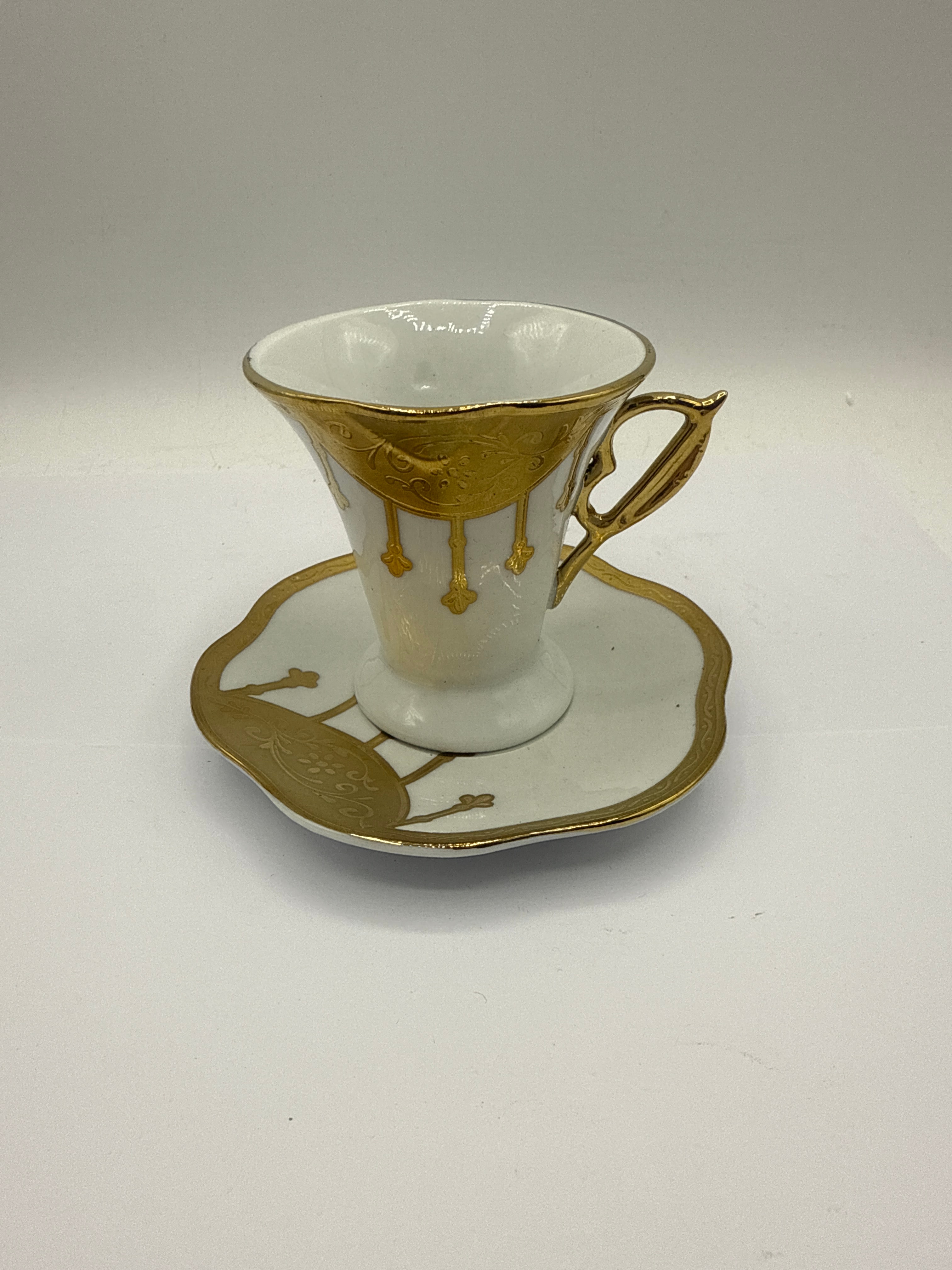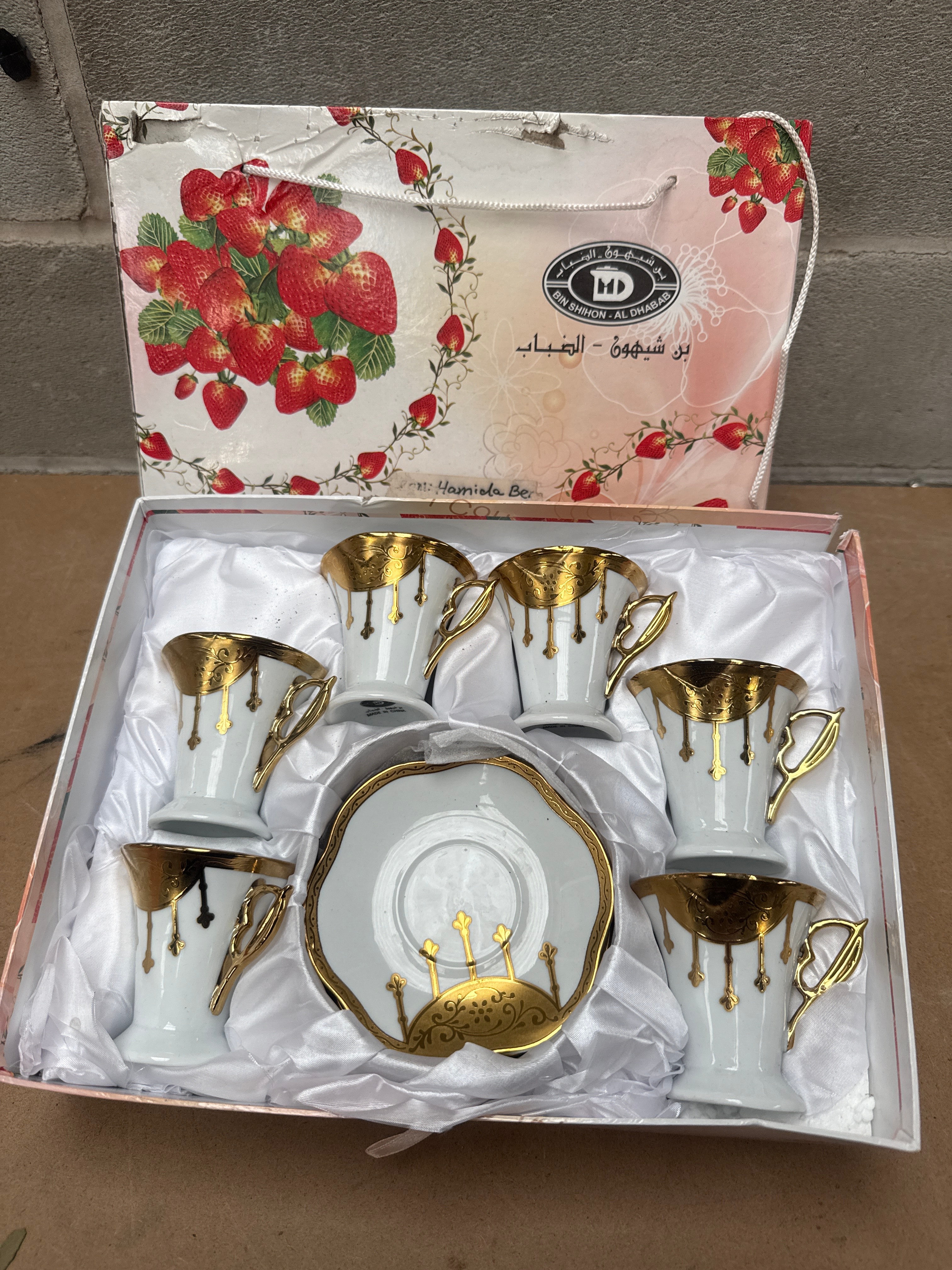 A new, boxed set comprising six demitasse-style cups and one matching saucer, crafted from white ceramic or porcelain. Each piece features ornate gold-tone decoration, including wide bands, scalloped edges, and distinctive drop/garland motifs on the cups, complemented by decorative handles and ruffled saucer edges. The base of a cup is marked with an ‘MD’ logo, the English text ‘BIN SHIHON – AL DHAB’, and the Arabic script ‘بن شيهون – الضباب’, along with ‘MADE IN CHINA’. The set is presented in its original gift packaging, adorned with a strawberry motif and matching branding.