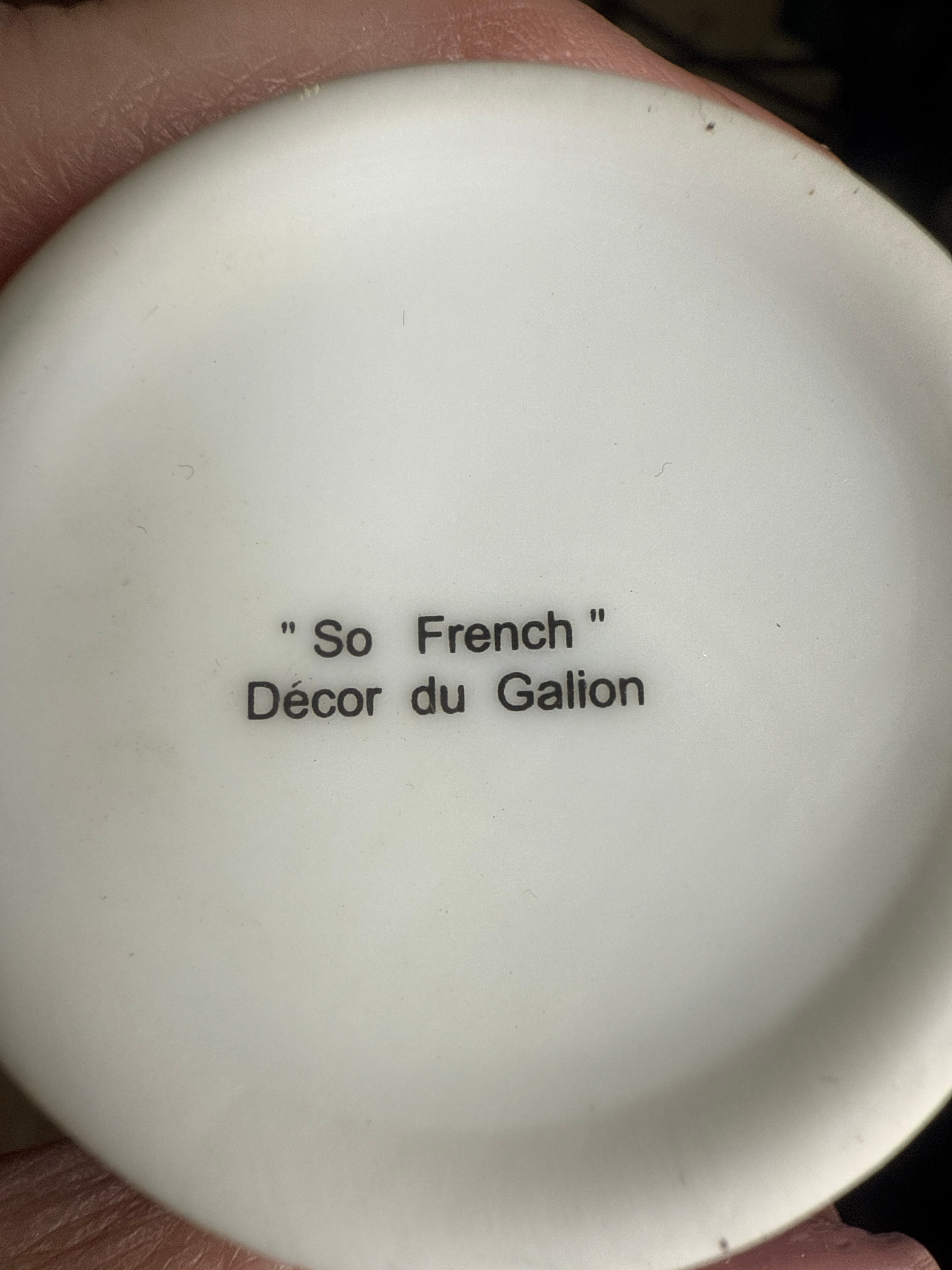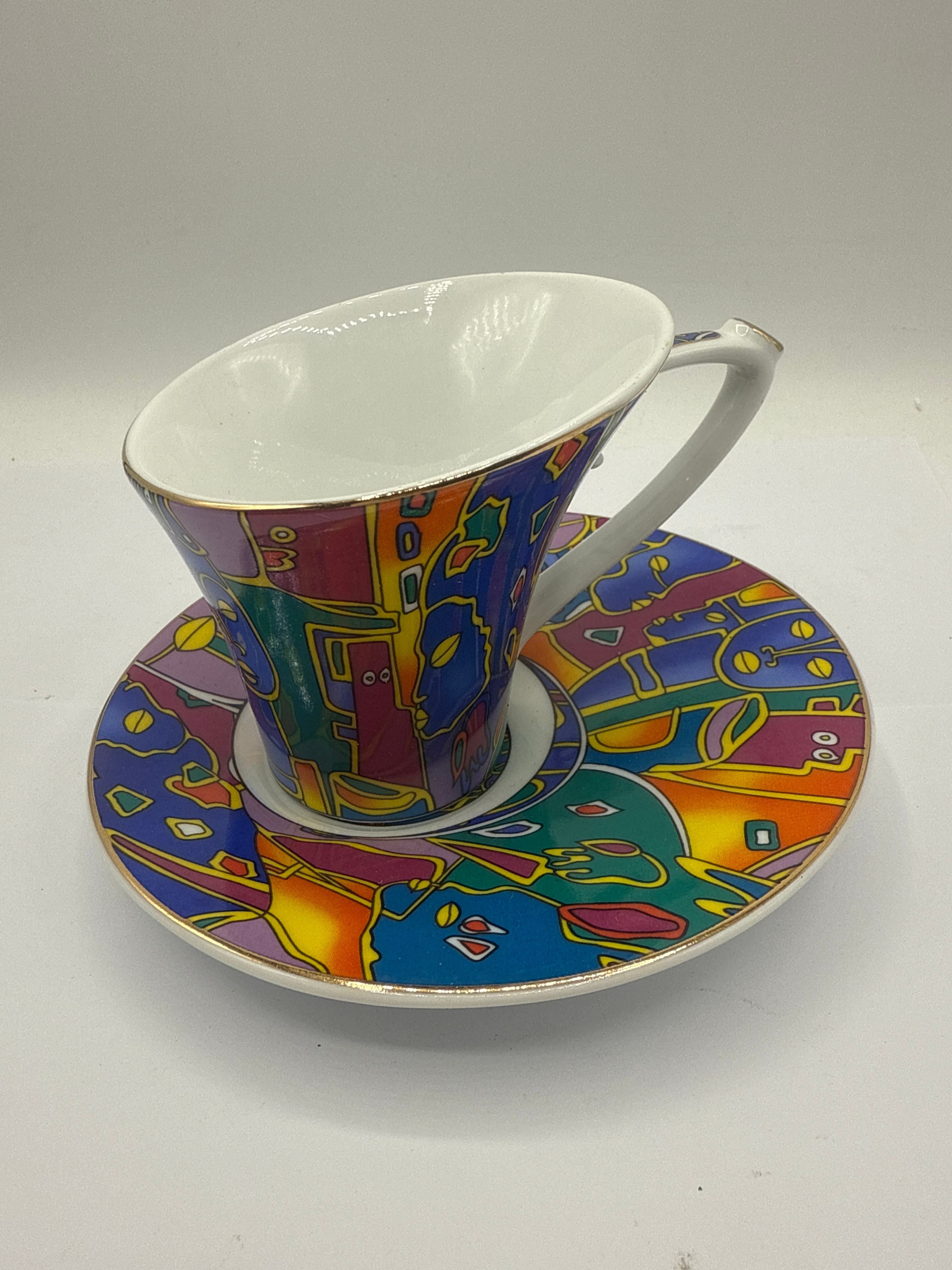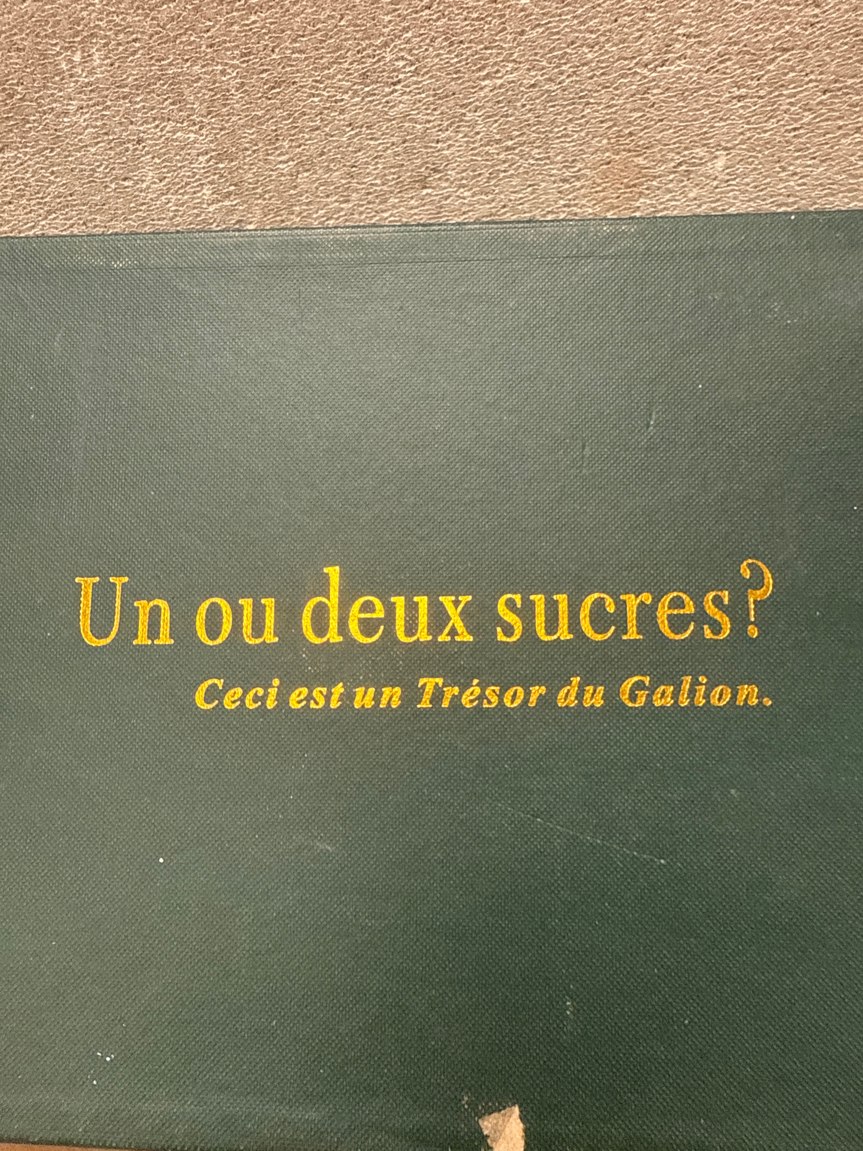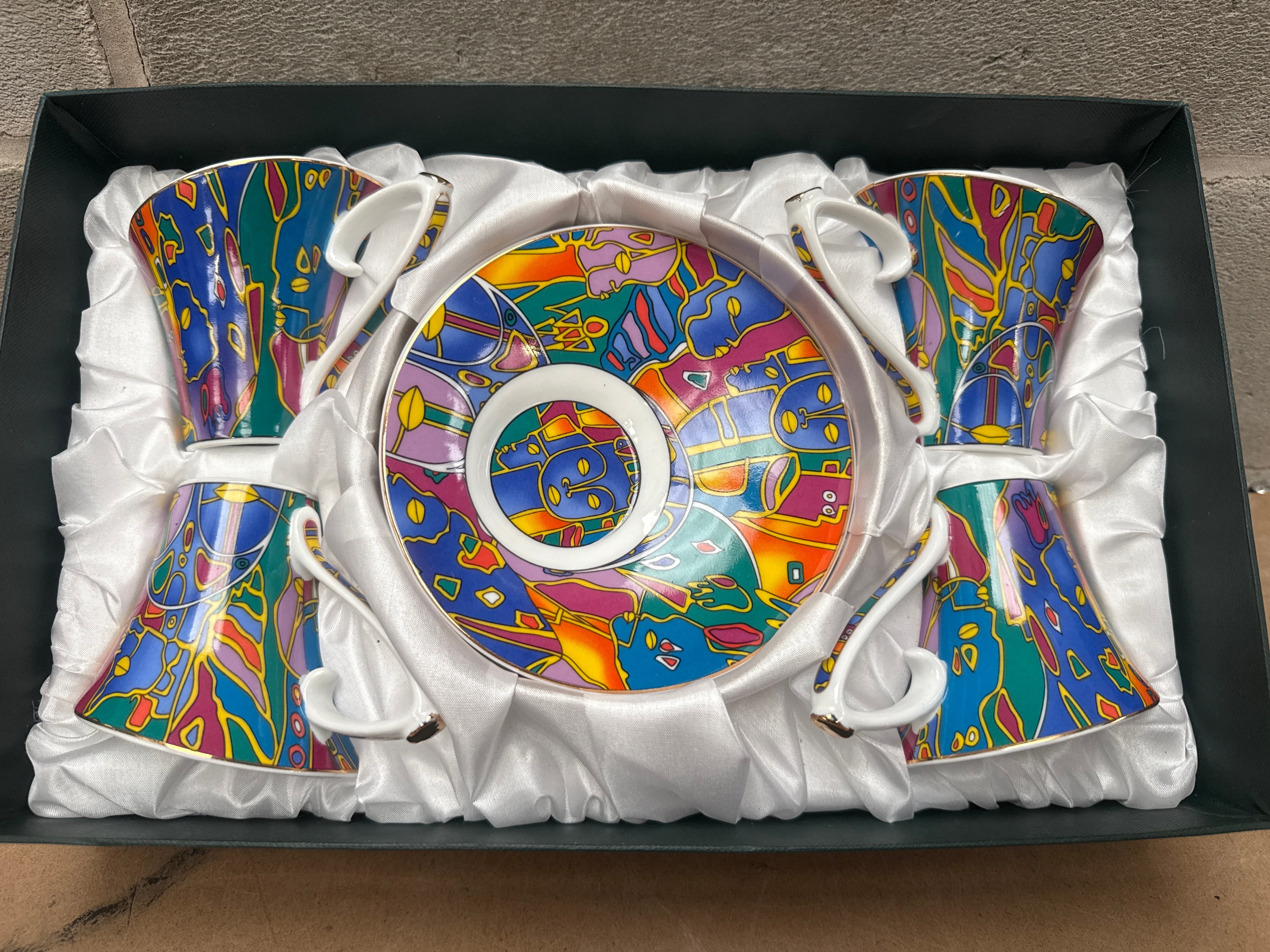 A set of four ‘So French’ Décor du Galion demitasse cups and matching saucers, crafted from French porcelain in the late 20th century. Each cup and saucer features a vibrant, multi-color abstract geometric design, reminiscent of Pop Art, incorporating hues of blue, green, orange, purple, and yellow. Gold-tone accents adorn the cup handles, rims, and saucer edges. The cup bases are marked “‘So French’ Décor du Galion.” The set is presented in its original dark green, fabric-covered fitted box with a white satin-like lining. The box lid is inscribed in gold with “Un ou deux sucres?” (One or two sugars?) and “Ceci est un Trésor du Galion.” (This is a Treasure from Galion.).