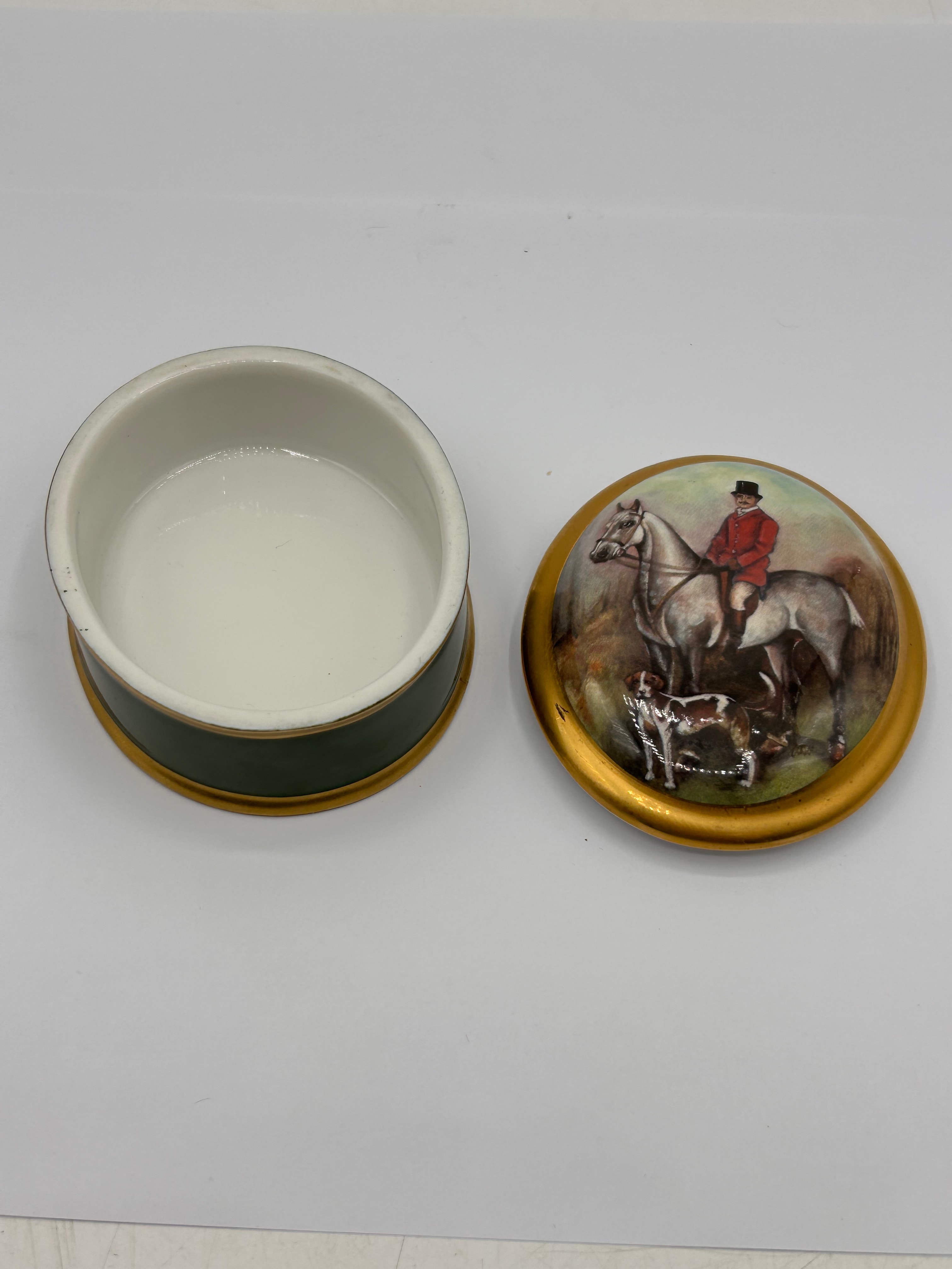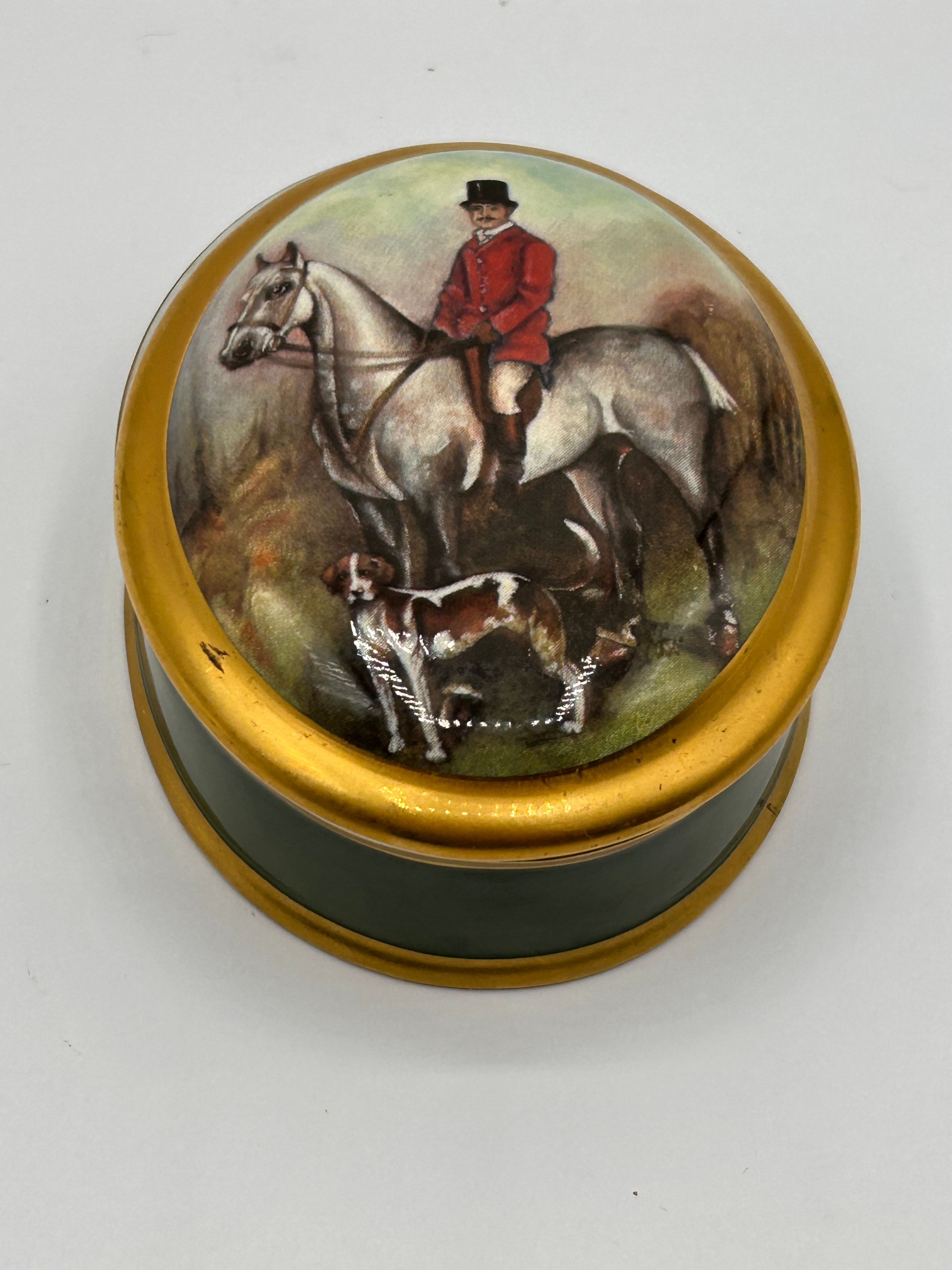 A small, round, lidded decorative box, likely a trinket or pill box. The domed lid features a colorful transfer-printed or painted image of a traditional fox hunting scene, depicting a hunter in a red coat on horseback with a dog, set within a gilded metal frame. The body of the box is a dark forest green ceramic, with a thin gold band around its upper rim. The interior is plain white, likely ceramic or porcelain.
