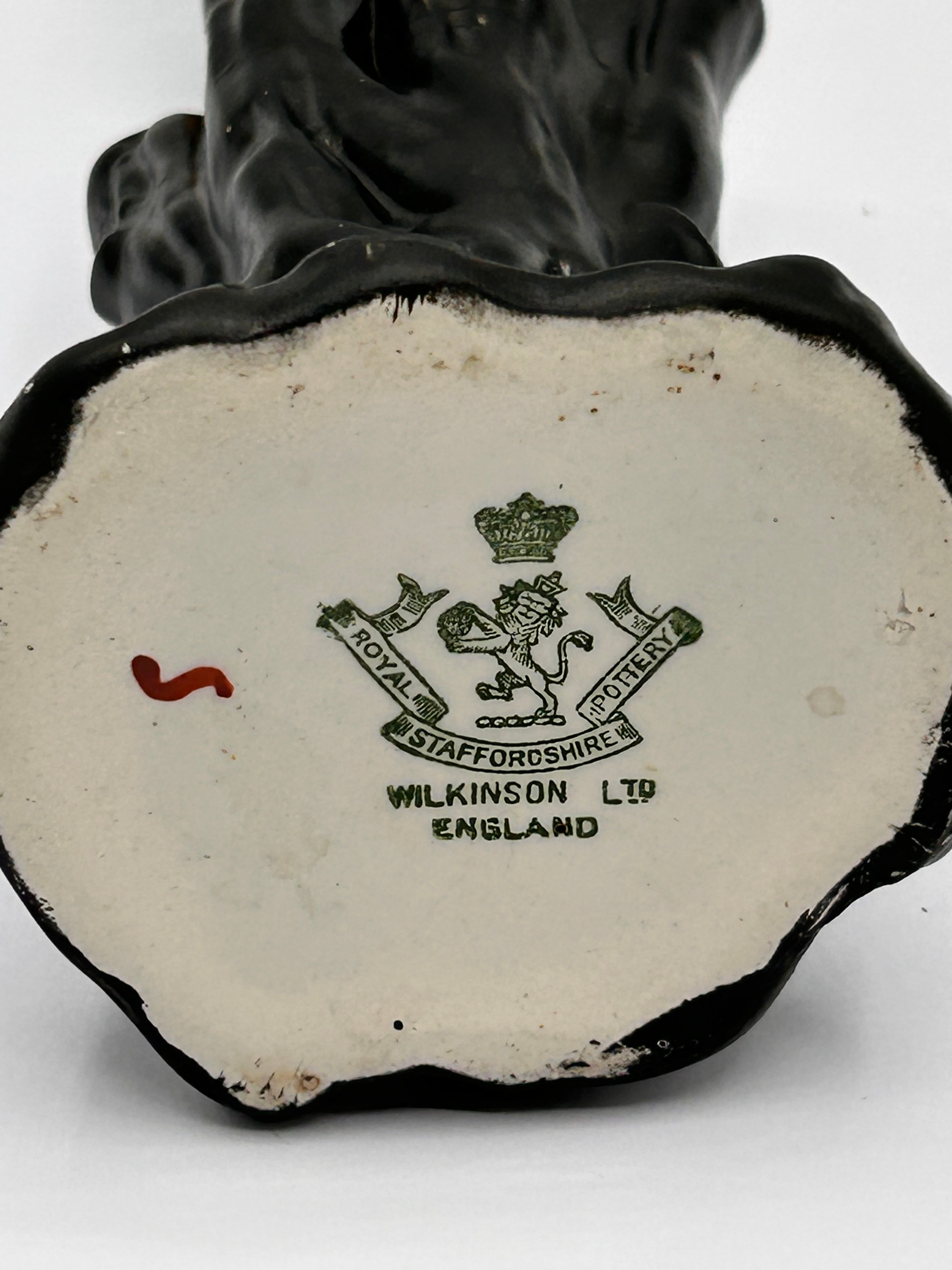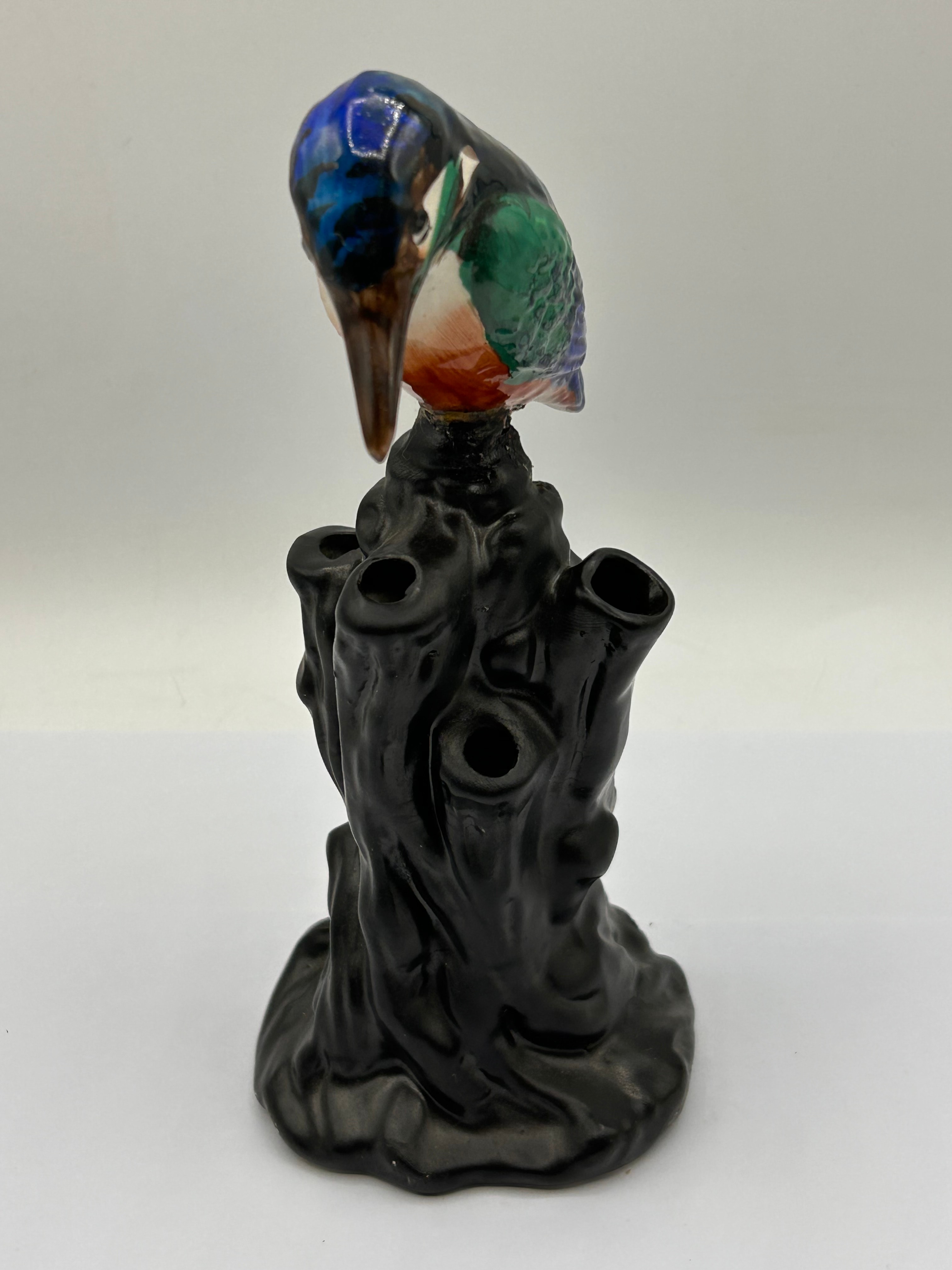 A Royal Staffordshire Pottery ‘WILKINSON LTD’ Kingfisher Vase, circa 1910. This polychrome glazed ceramic figurine depicts a kingfisher bird, rendered in vibrant blue, green, orange, and white enamels, perched atop a dark, tree stump-form base. The base features multiple openings, suggestive of a spill vase or posy holder. The underside of the base bears a green transfer mark of a crowned lion crest, encircled by ‘ROYAL STAFFORDSHIRE POTTERY,’ with ‘WILKINSON LTD’ and ‘ENGLAND’ printed below. A small red, brush-like mark is also present near the main mark.