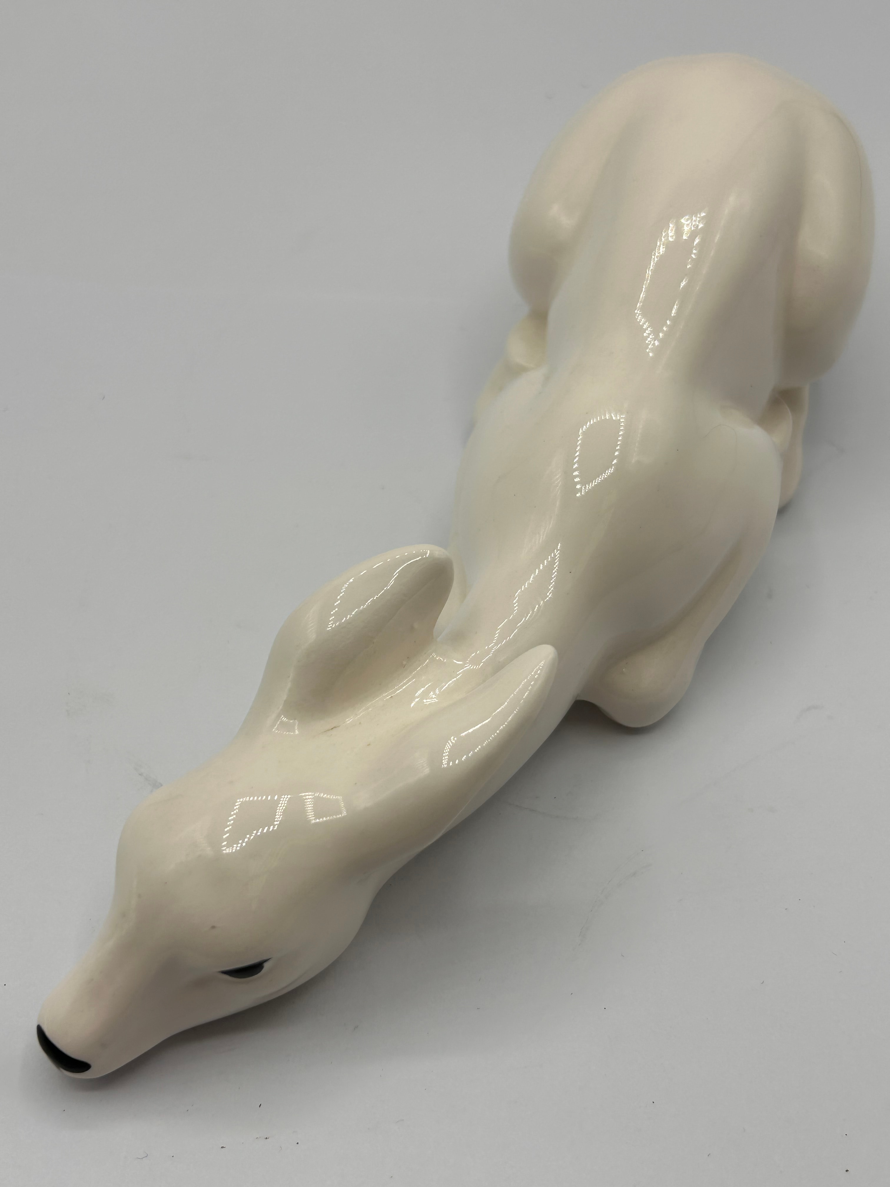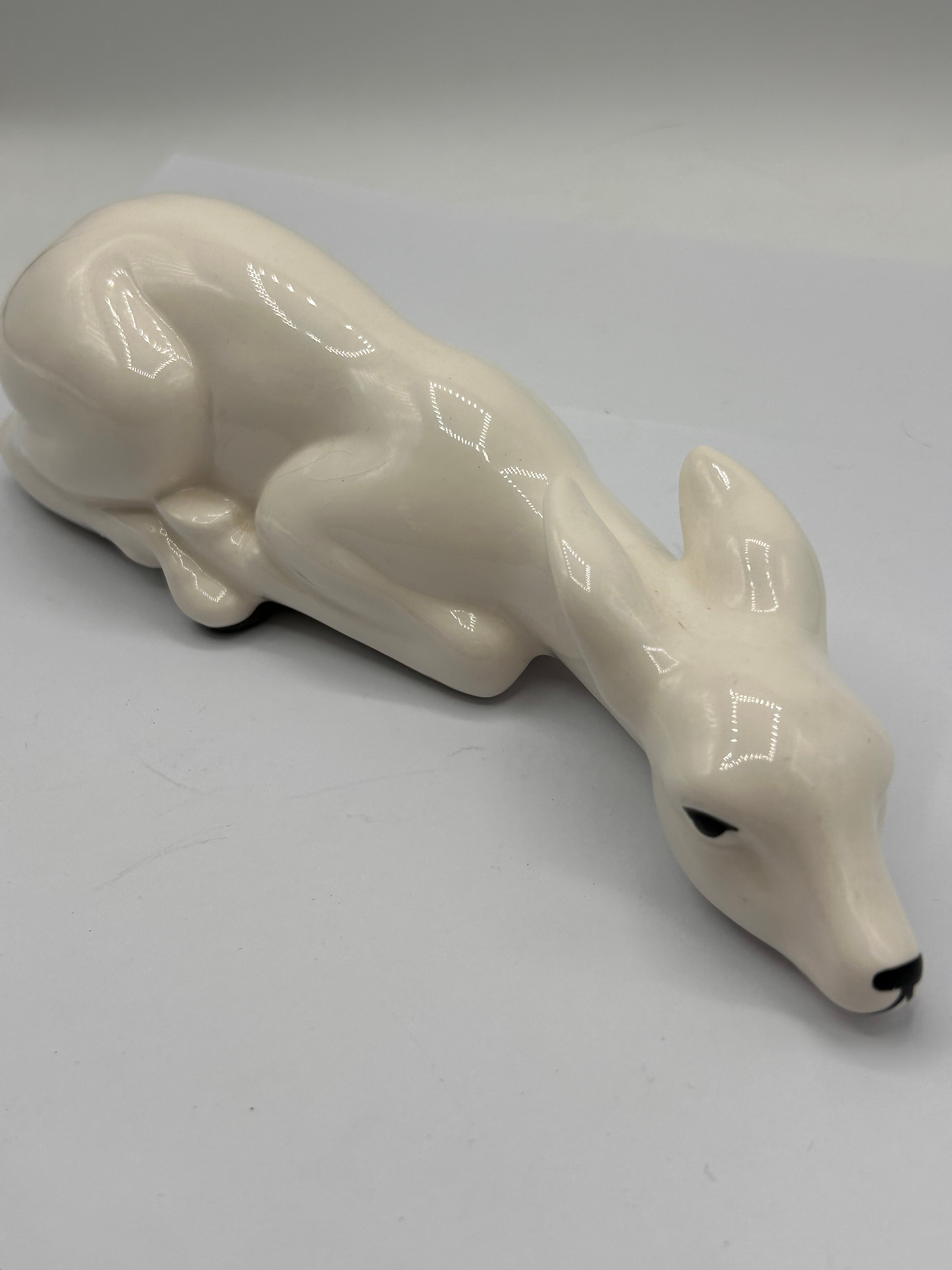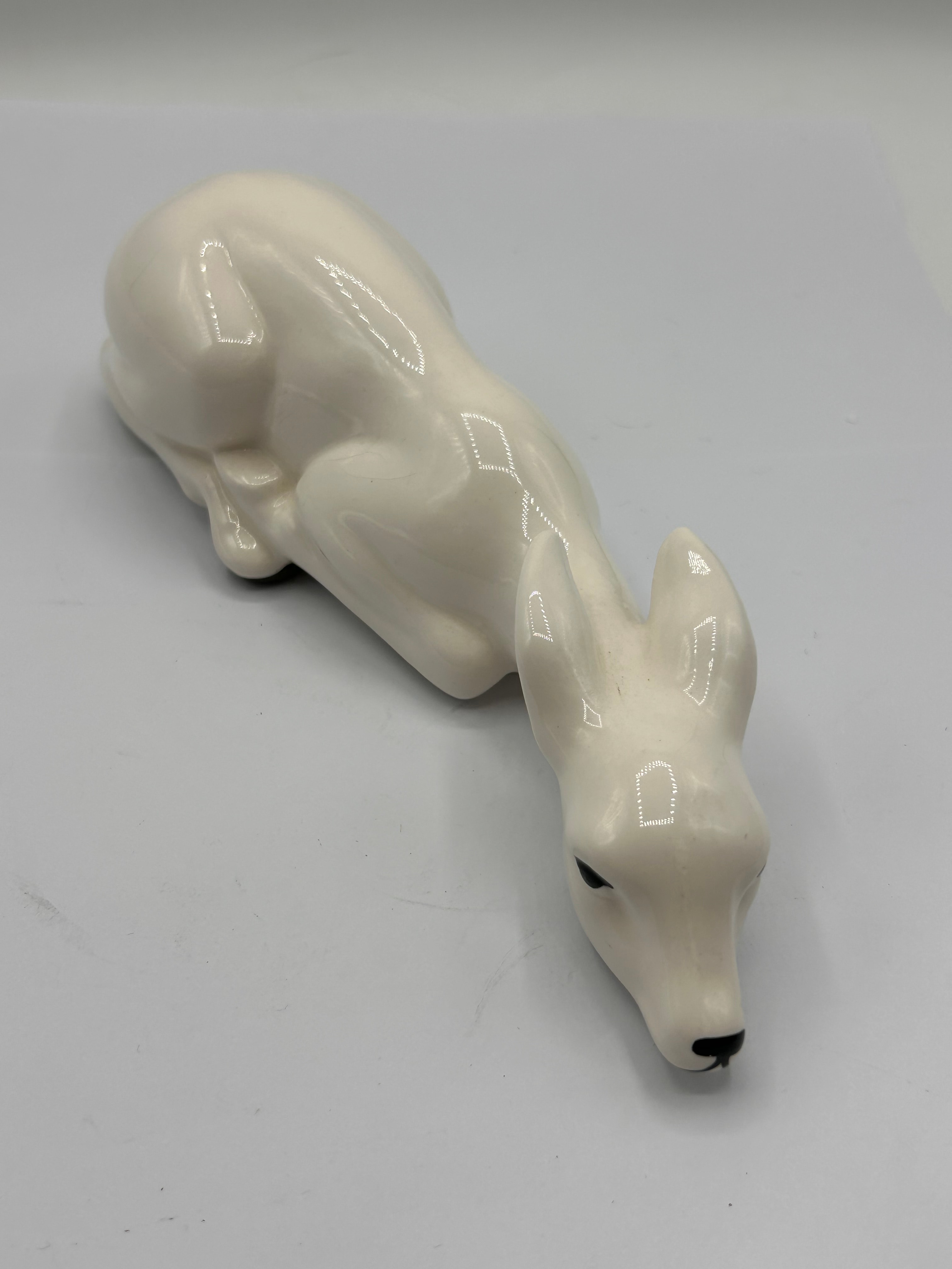 A white glazed ceramic figurine by Gallery Originals, dated 1984, depicting a reclining fawn. The figurine exhibits a high-gloss finish, with the eyes and nose accented in black. Its form is simplified and streamlined, suggesting a modernist or mid-century aesthetic.