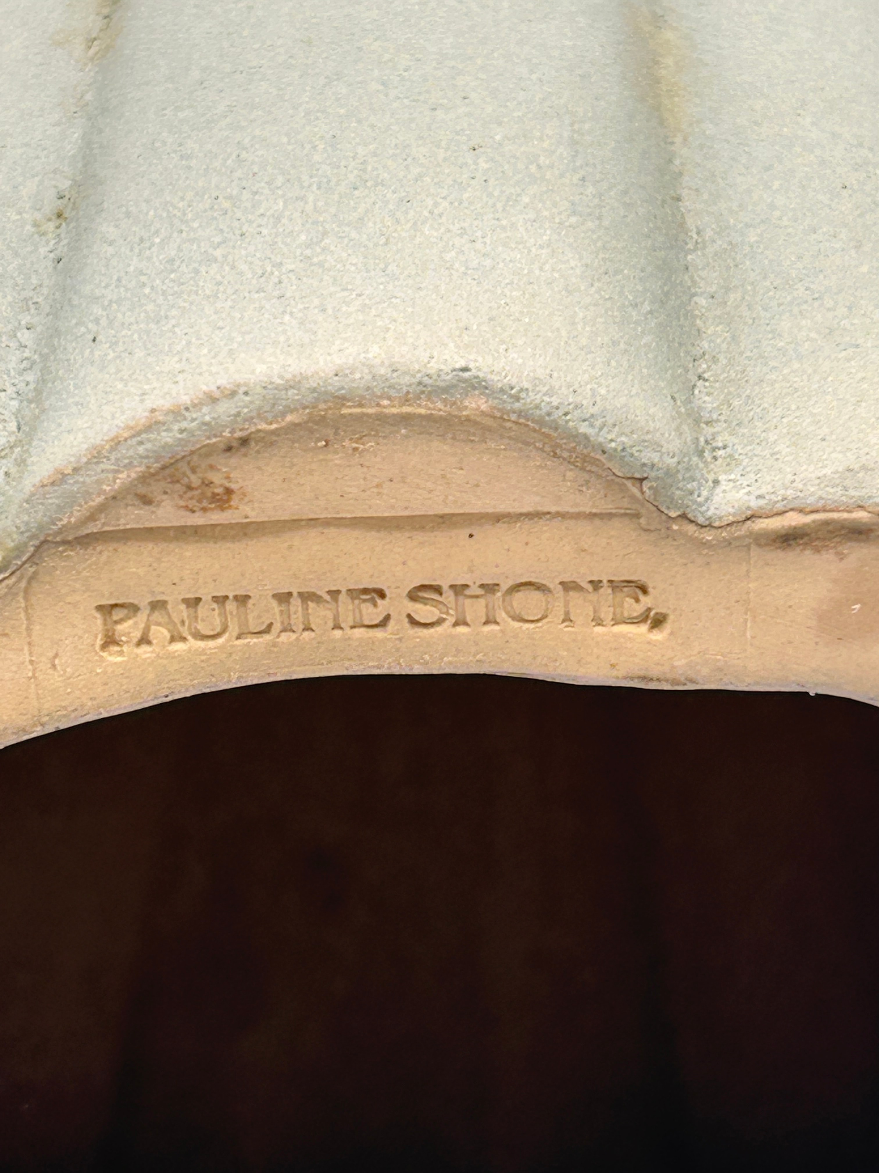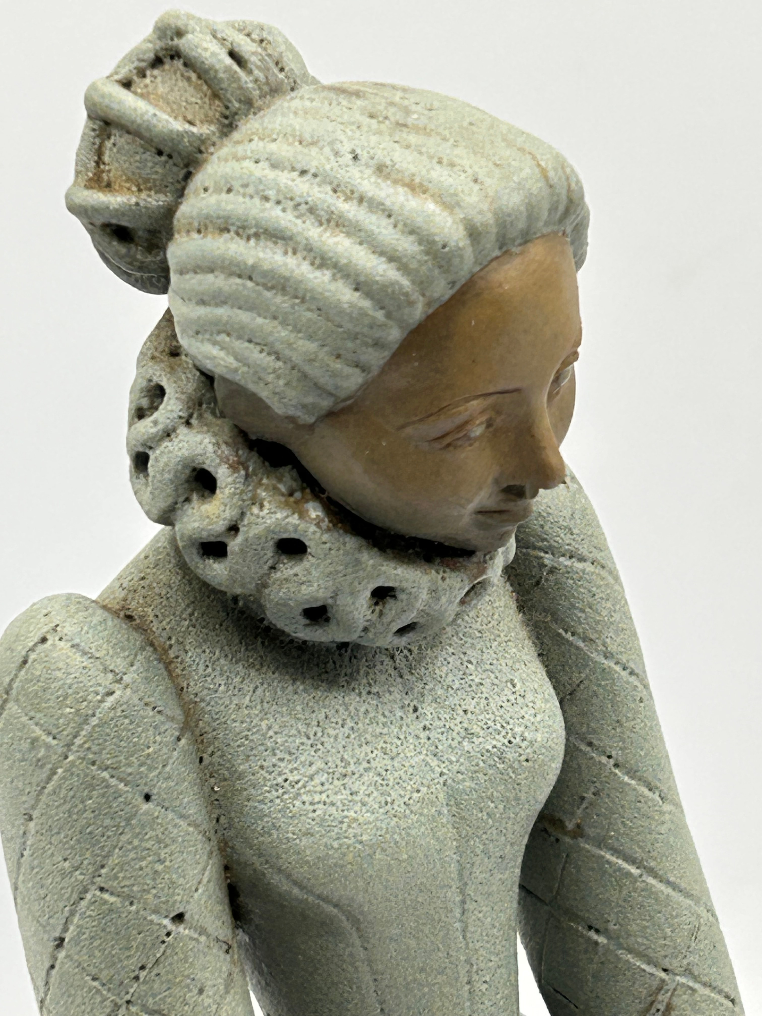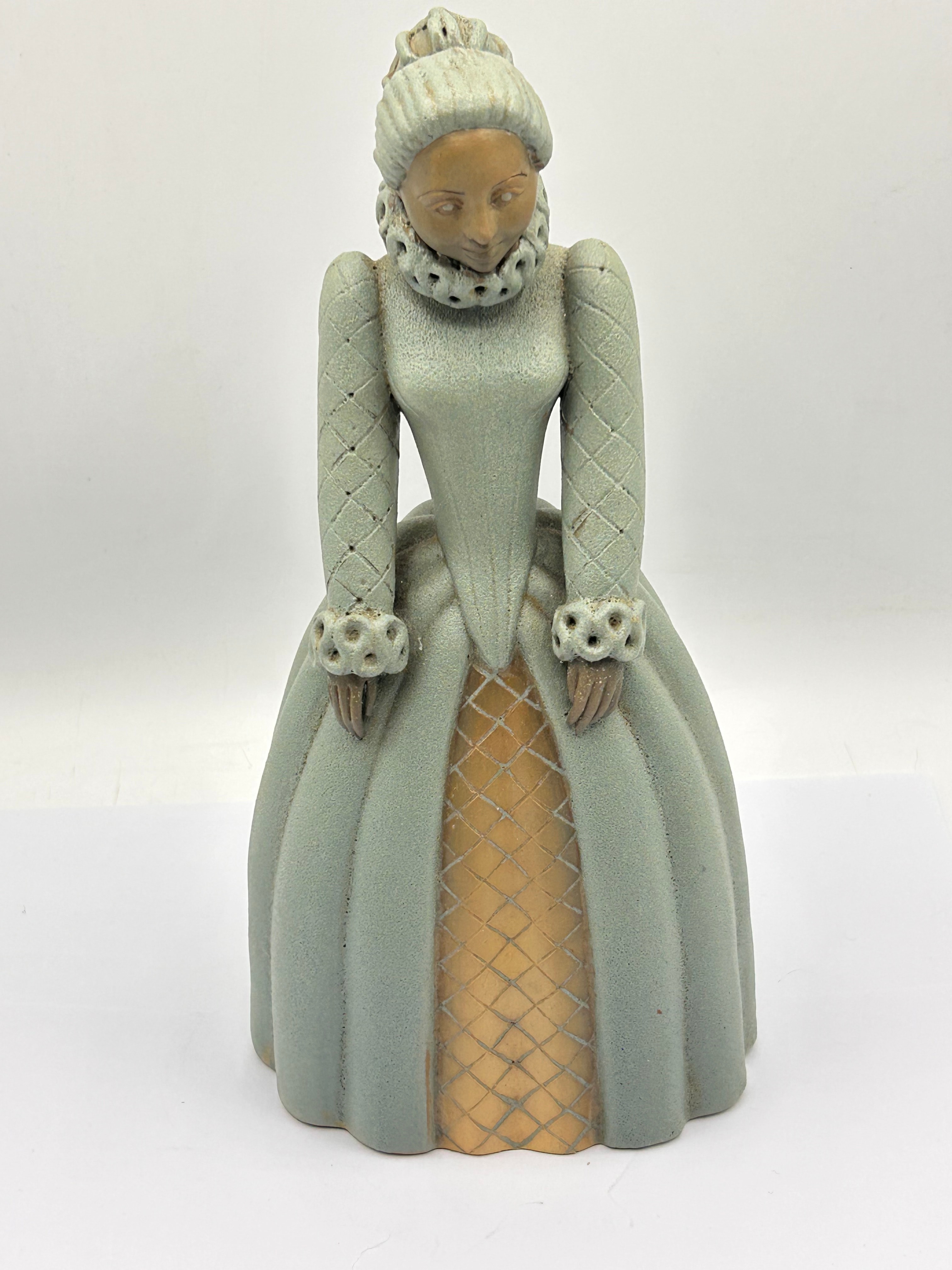 A ceramic figurine by Pauline Shone, depicting a female figure dressed in historical European fashion, potentially Elizabethan-inspired, with a ruffled collar, structured sleeves, and a wide skirt. The piece features a textured, matte pale greenish-grey finish, with the figure’s face rendered in smooth light brown and a gold, diamond-patterned underskirt. The name “PAULINE SHONE” is impressed on the interior base.