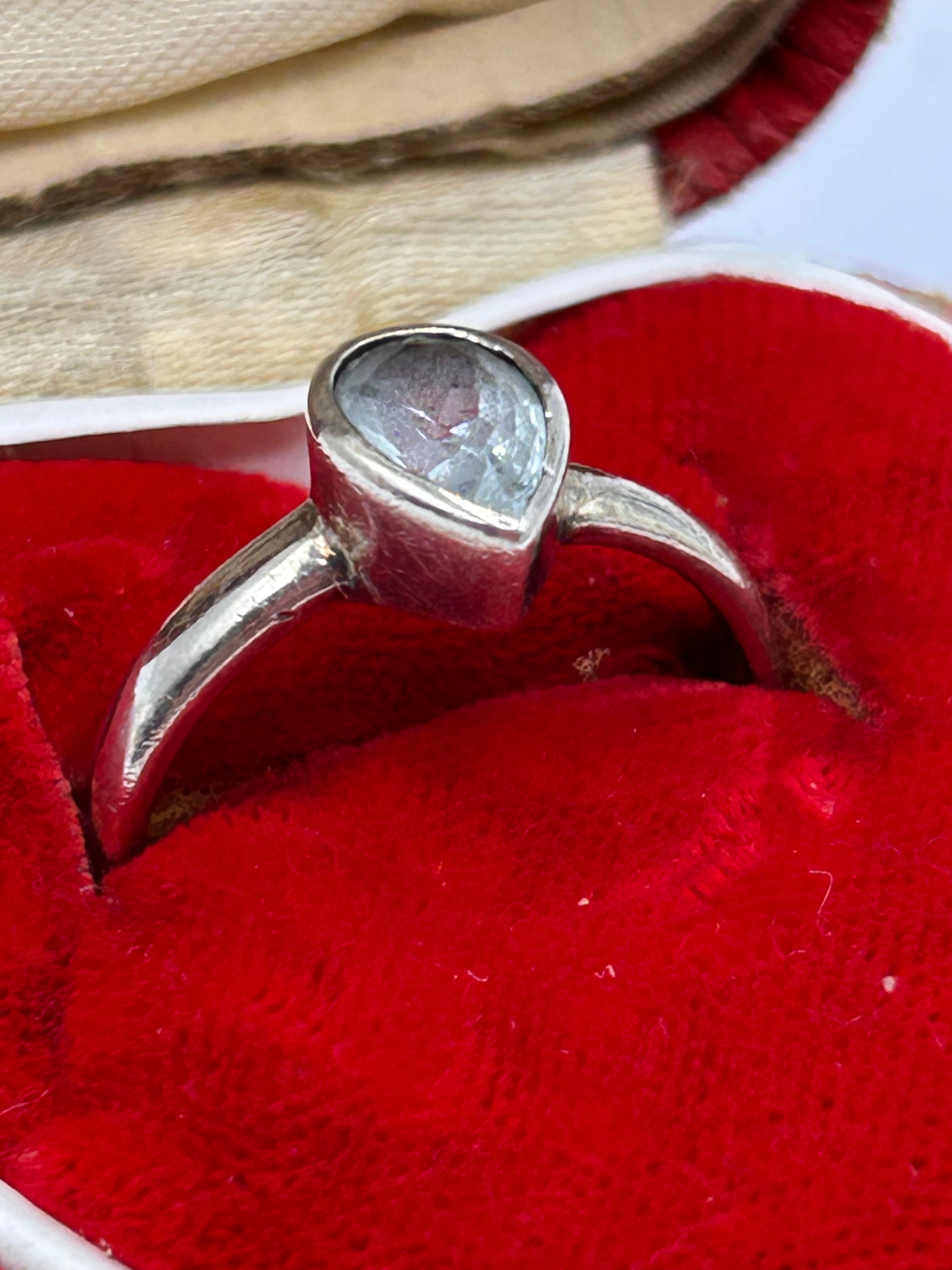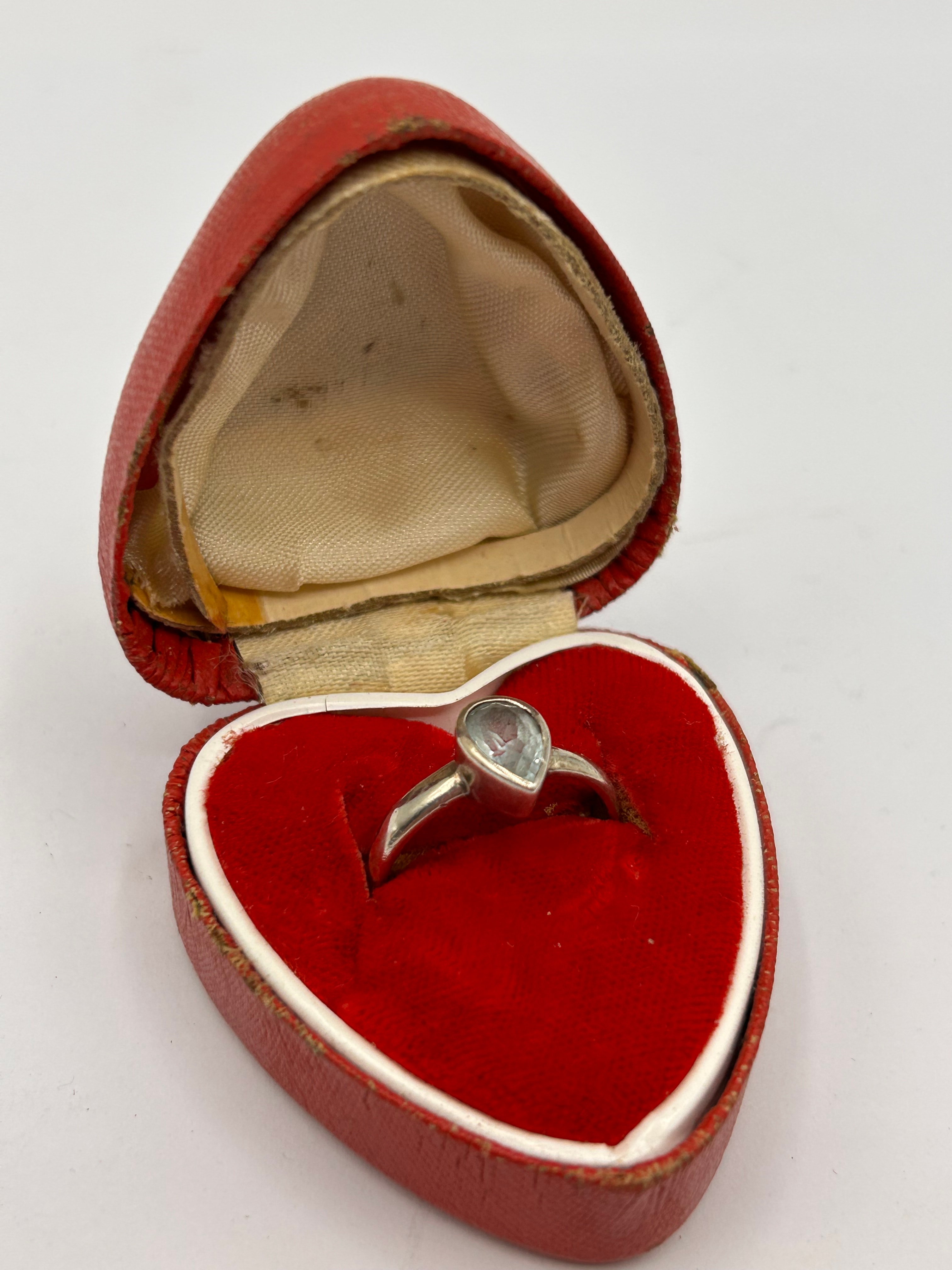 A silver ring featuring a pear-shaped, faceted, light blue/greyish translucent stone set in a bezel on a plain, tapering band. The ring is housed in an open, heart-shaped presentation box. The box exterior is made of a red material, possibly aged leatherette. The interior is lined with red velvet in the base, specifically molded for the ring, and a discolored, cream-colored satin or silk in the lid. No visible text or markings are apparent on the ring or the box.