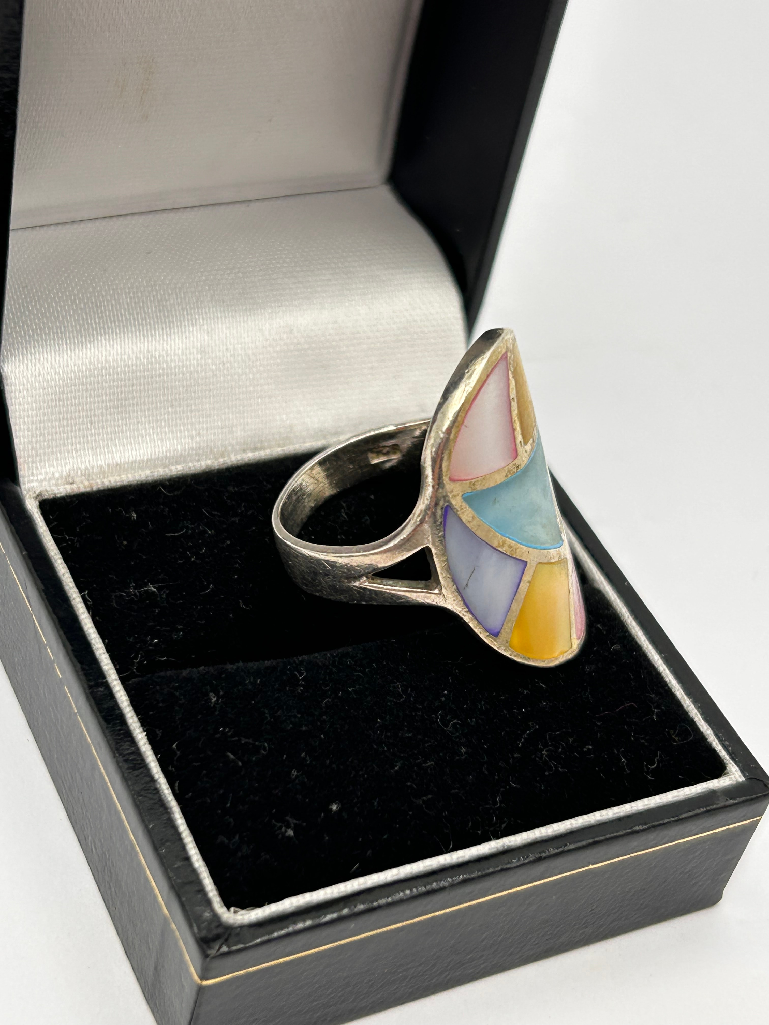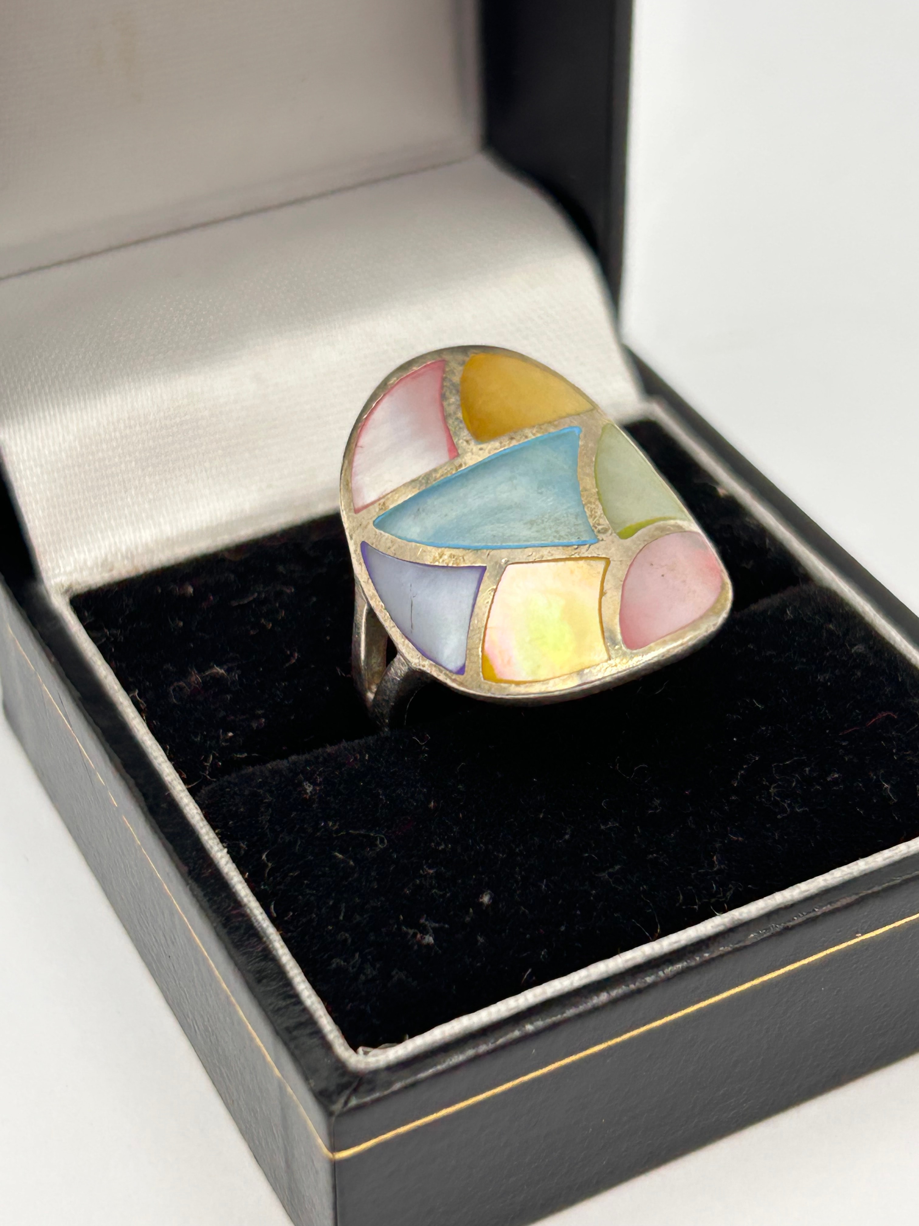 A silver cocktail ring featuring a large, shield-shaped face with an abstract, geometric inlay design. The inlay comprises multiple irregularly cut and polished pieces of iridescent mother-of-pearl and abalone, presenting in varied pastel shades including pink, yellow, light blue, lavender, green, and white. The ring’s band has a split shank leading to the decorative top. No discernible text or hallmarks are visible. The item is presented in a black, velvet-lined ring box.