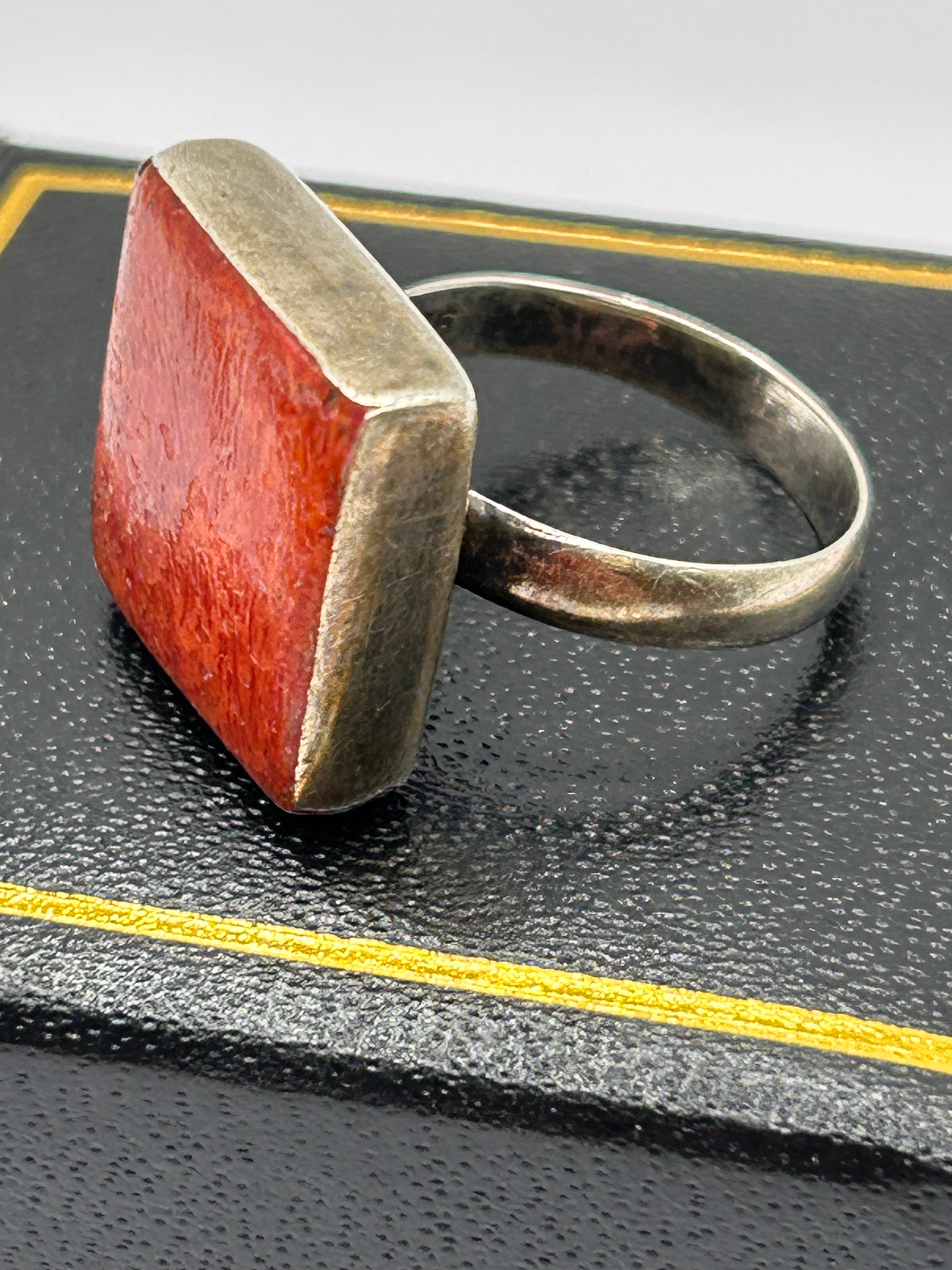 A vintage silver ring featuring a prominent square-cut coral gemstone. The ring has a minimalist or modernist aesthetic with a plain band. The large, flat, reddish-orange opaque coral material displays natural texture with visible striations and is securely set within a rectangular bezel.