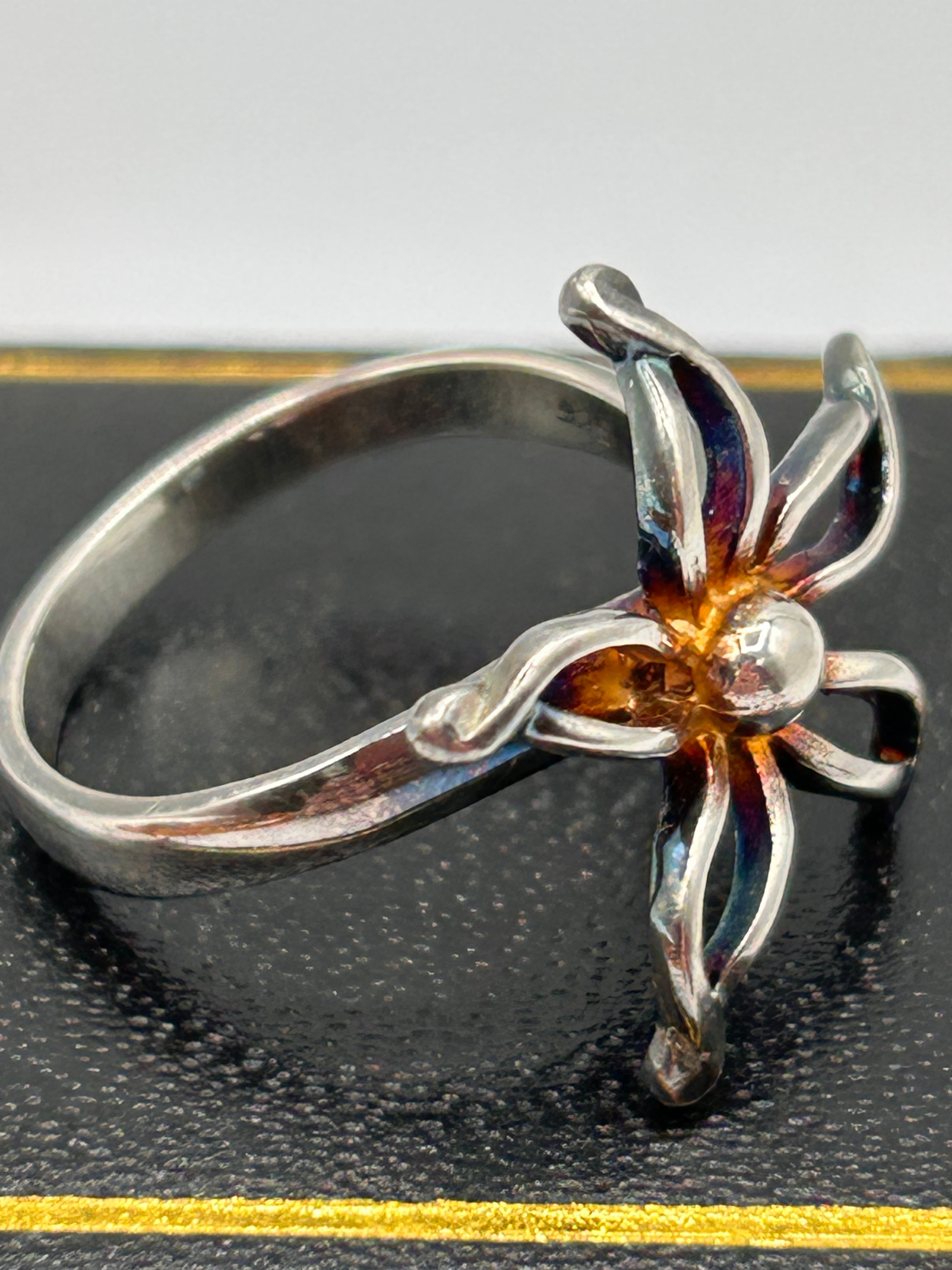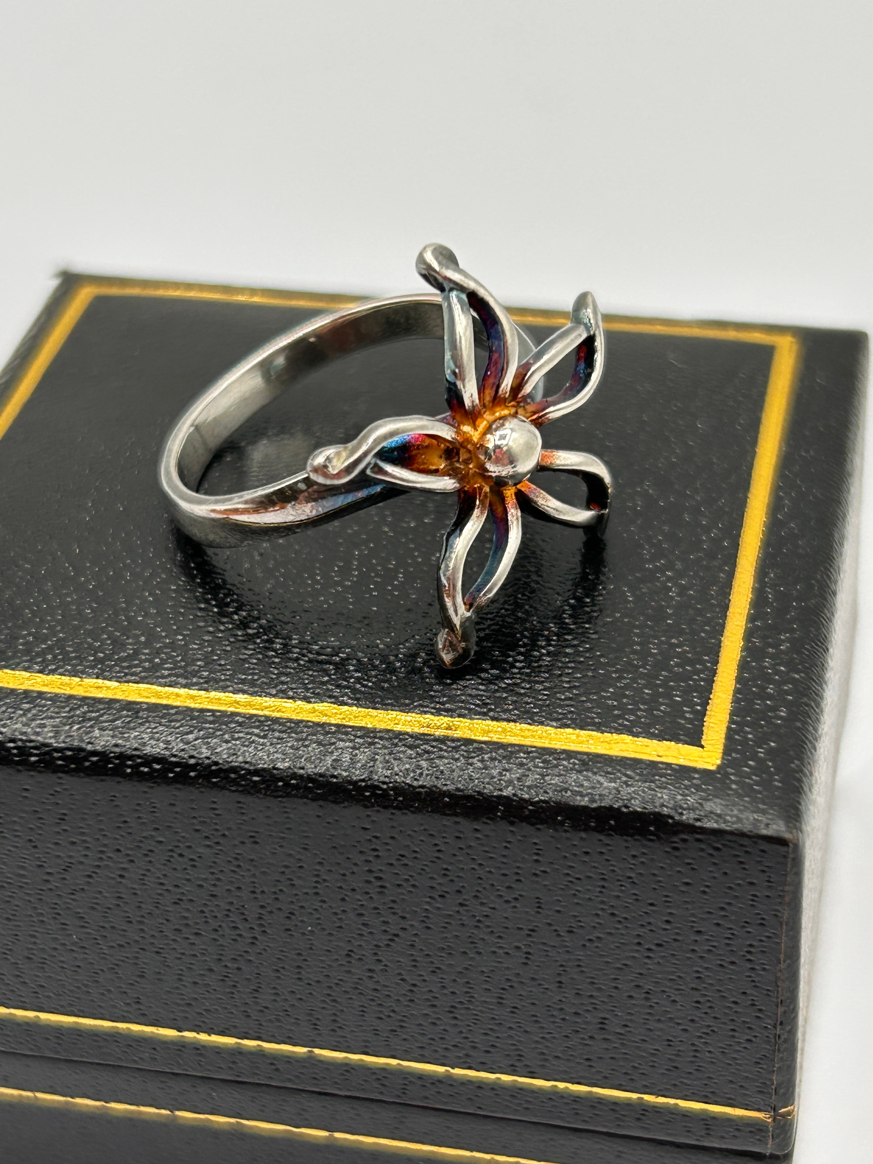 A finger ring crafted from Silver, featuring a prominent, multi-petal floral or starburst-like motif. The open-worked petals display an iridescent finish with visible hues of blue, purple, and orange, potentially from heat treatment, patination, or enamel. The design is centered by a small, spherical element in a contrasting yellow-gold tone. The band is a polished Silver metal, appearing to integrate seamlessly with the floral design. No visible text, hallmarks, or manufacturer’s markings are apparent on the exterior surfaces.