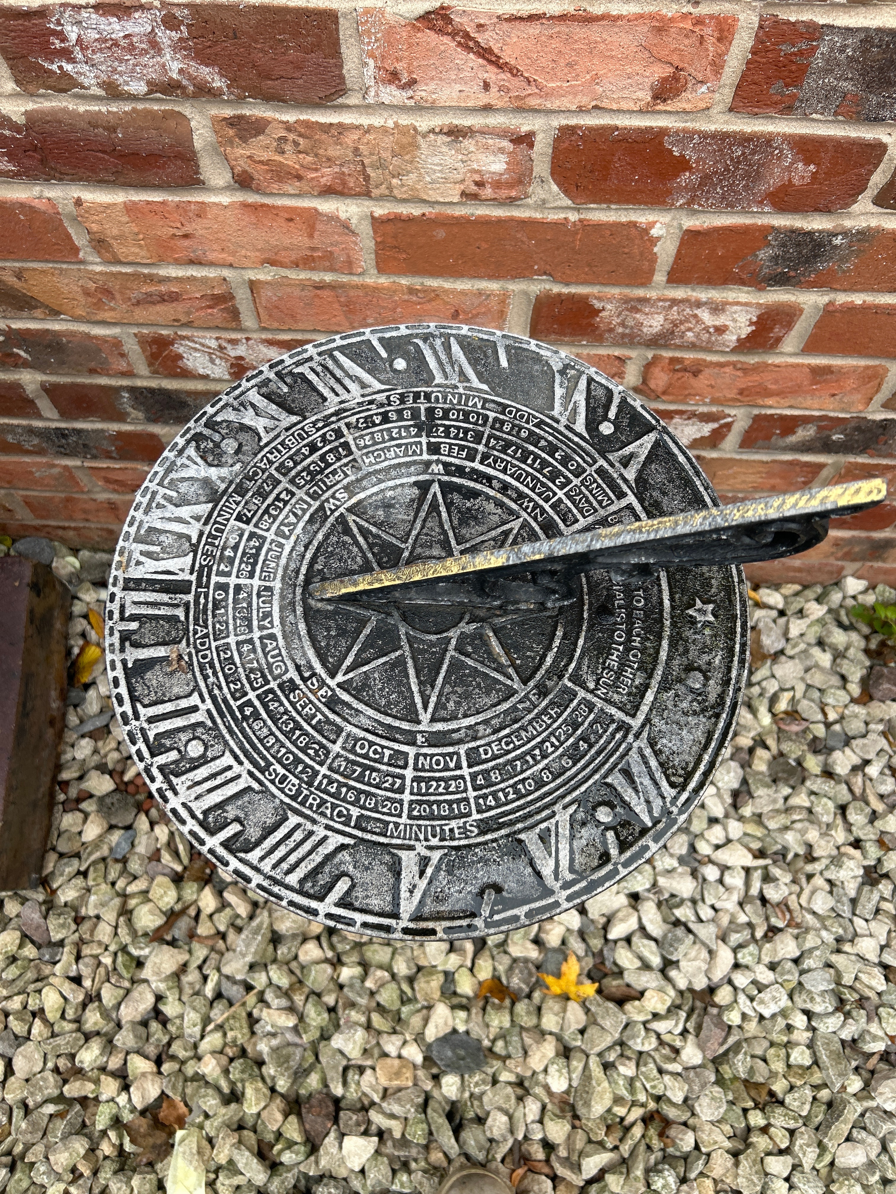 A Verdigris Finished Cast Iron Dragonfly Sundial by Whitehall Products. This garden sundial is constructed from cast metal, likely iron. It features a circular dial plate supported by a columnar pedestal and a scrolled, openwork round base. The dial plate is marked with Roman numerals for hours, along with the months of the year (JAN, FEB, MAR, etc.), associated numerical values, and the words “ADD”, “SUBTRACT”, and “MINUTES”, indicating an equation of time scale. A decorative cast metal gnomon, with a distinct brass-toned tip, projects from the center. The piece exhibits a dark, possibly painted or patinated finish with contrasting lighter highlights on the dial’s raised details.