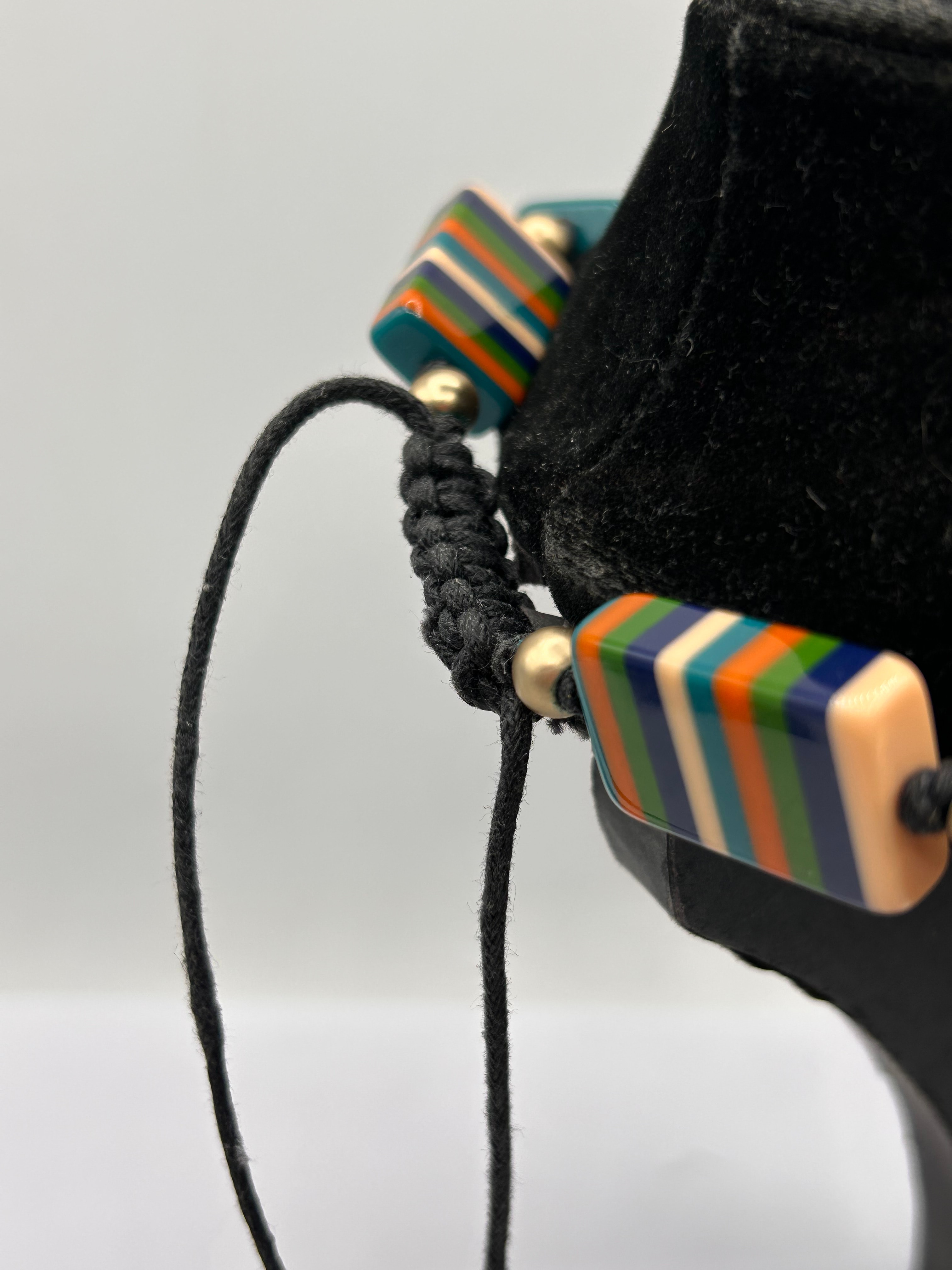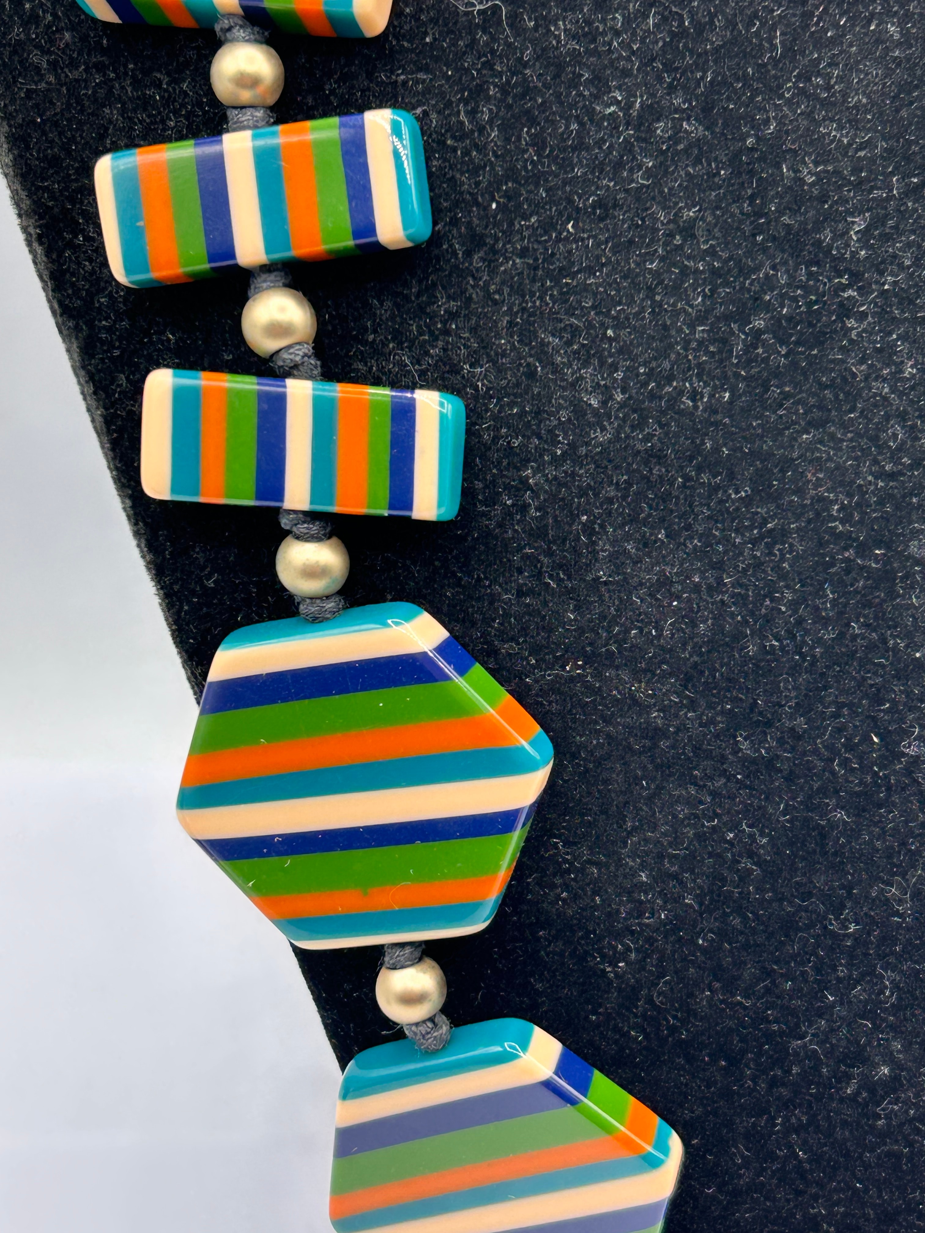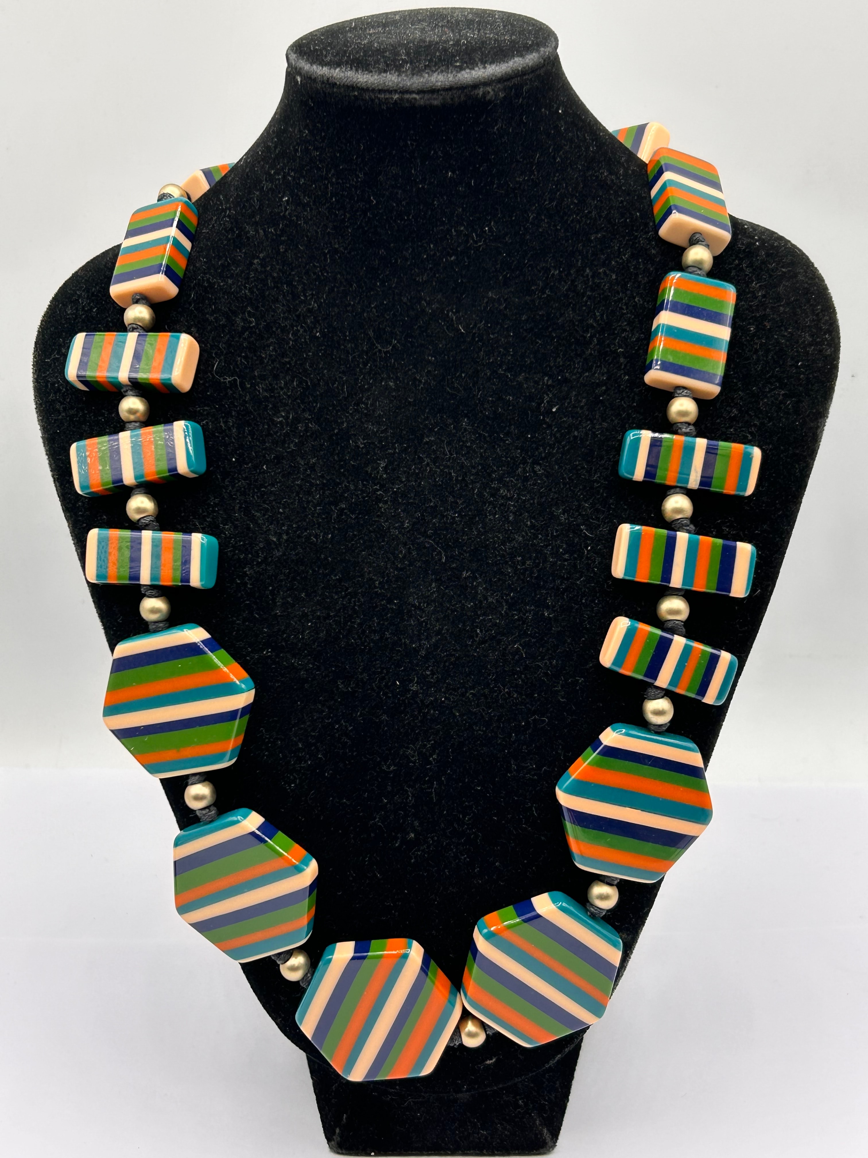 A Jackie Brazil Sobral necklace featuring a series of large, polished beads crafted from resin. The beads are alternately rectangular and hexagonal in shape, each adorned with vibrant horizontal stripes in dark blue, light blue, teal, orange, and a pale peach tone. Smaller, spherical gold-toned metal beads are interspersed throughout, with the entire assembly strung on a dark, braided textile cord that fastens with a knot. No visible text or markings are discernible.