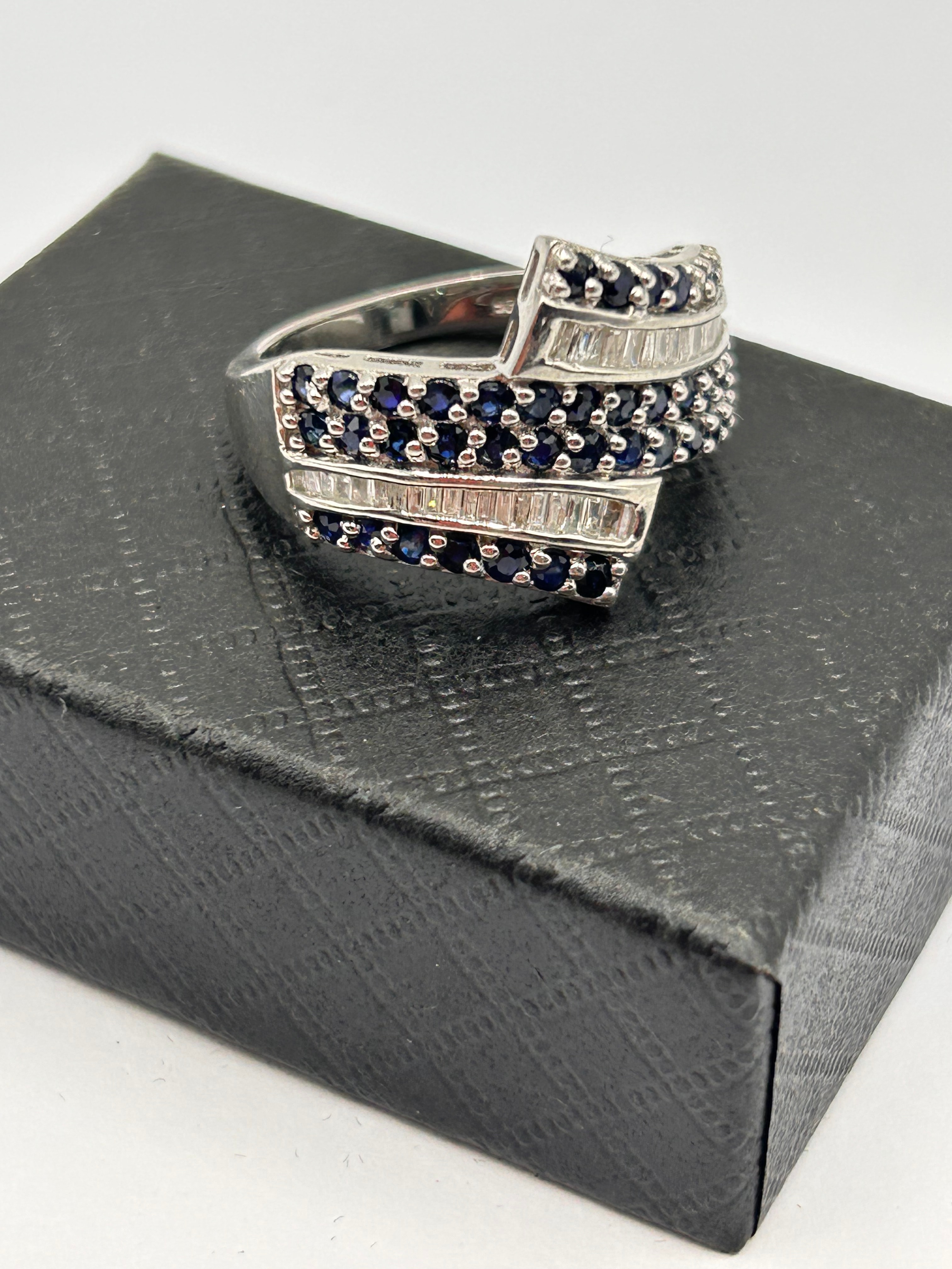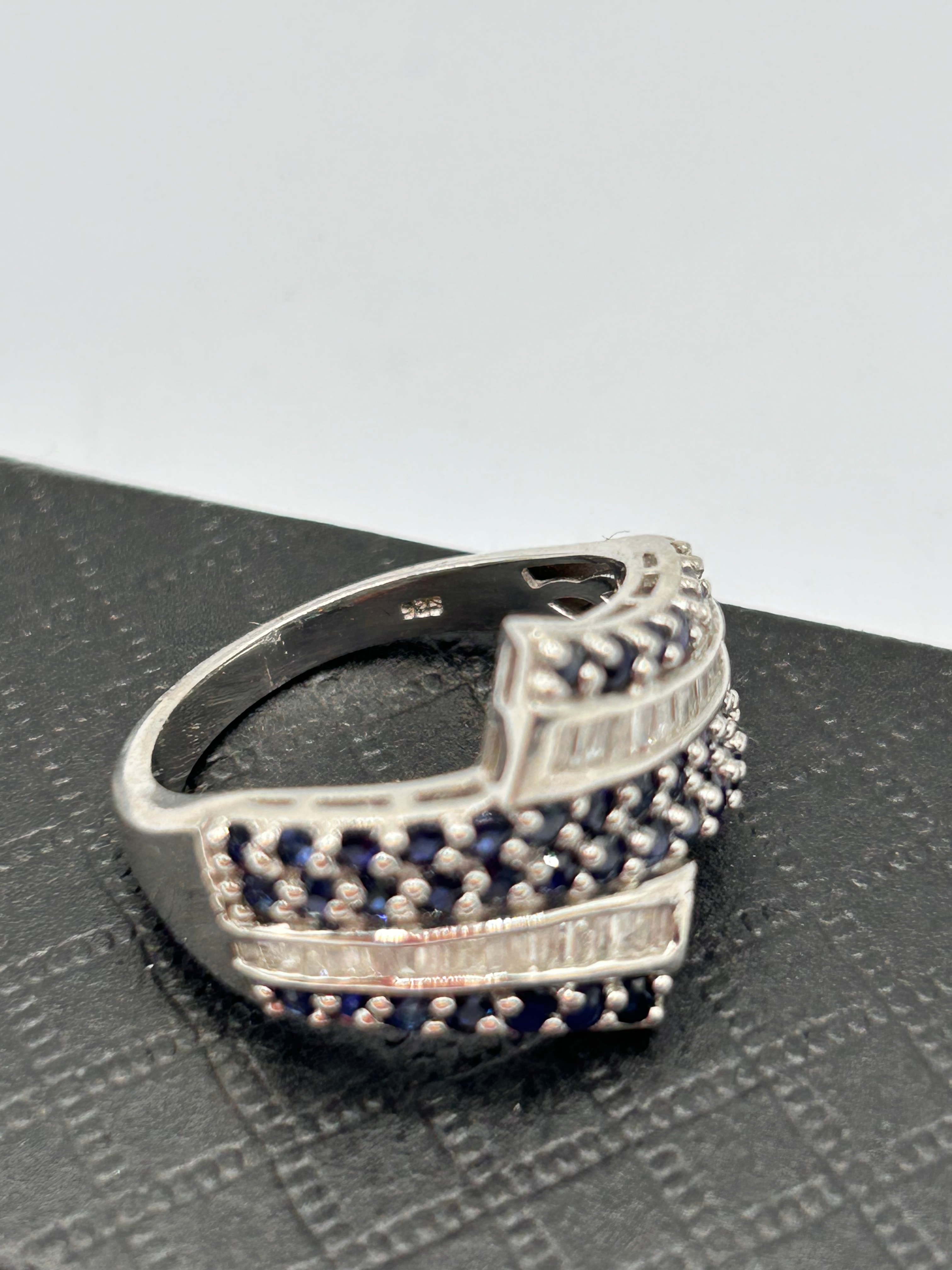 A contemporary sterling silver ring featuring a wide, contoured band design, extensively set with numerous small, dark blue, round brilliant-cut stones and clear, rectangular baguette-cut clear stones arranged in multiple rows. The inner band bears a clear ‘925’ hallmark.