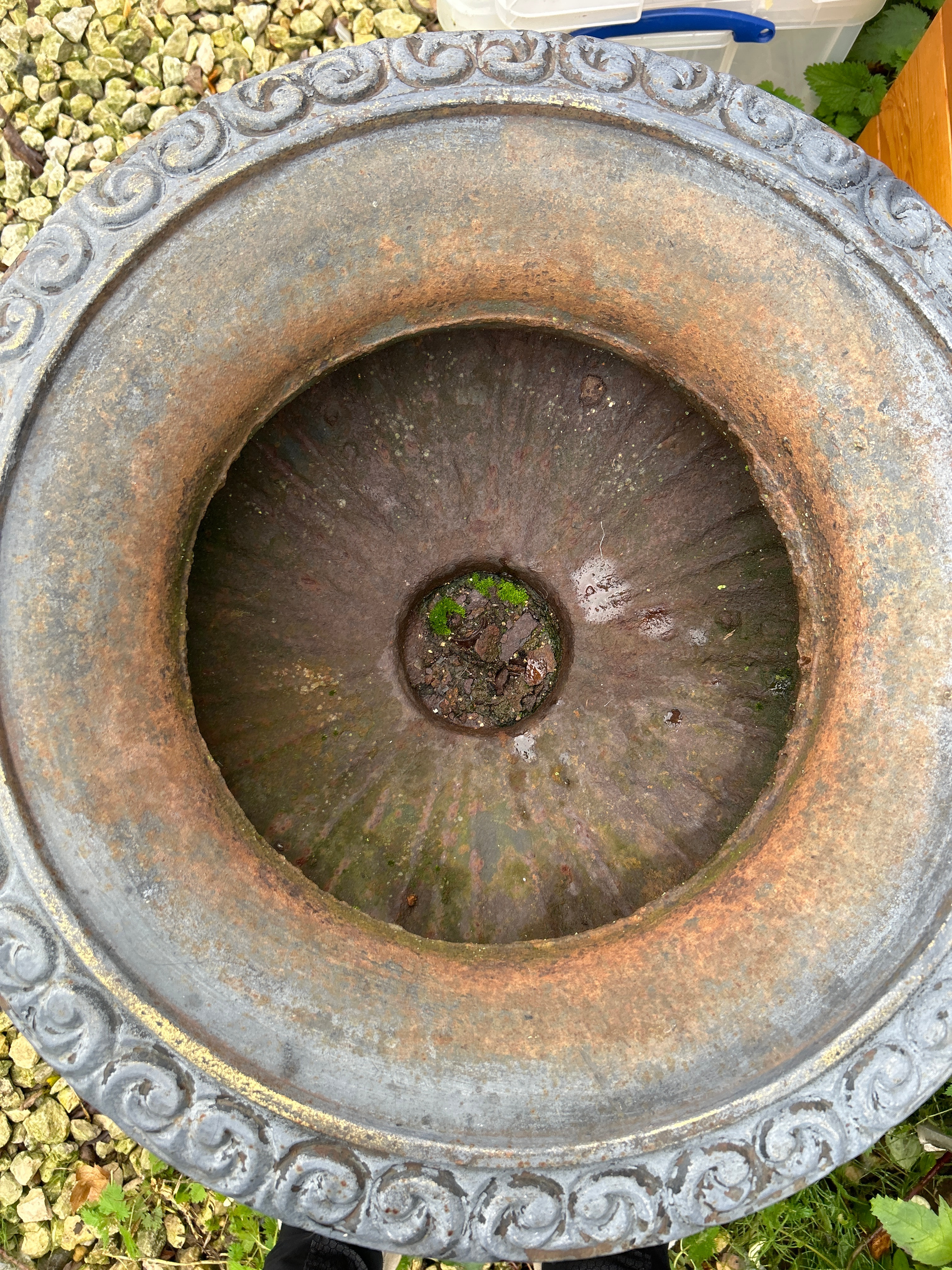 A large, classical-style outdoor urn or planter, constructed from cast iron. It features a wide, shallow bowl with an everted, scrolling relief-decorated rim and two prominent scroll-form handles. The bowl is supported by a fluted stem atop a square pedestal base, which also displays classical motifs and four distinct feet.