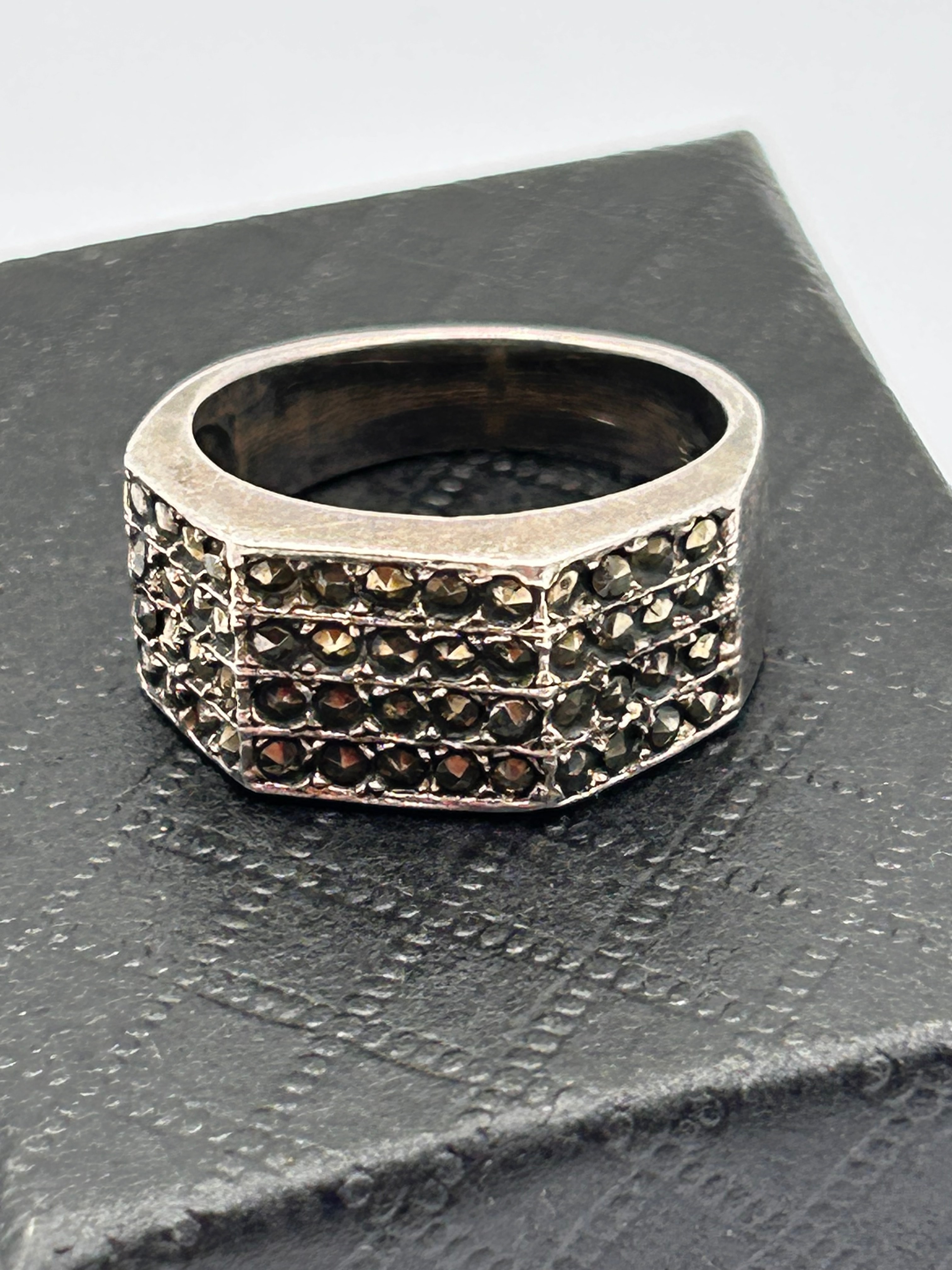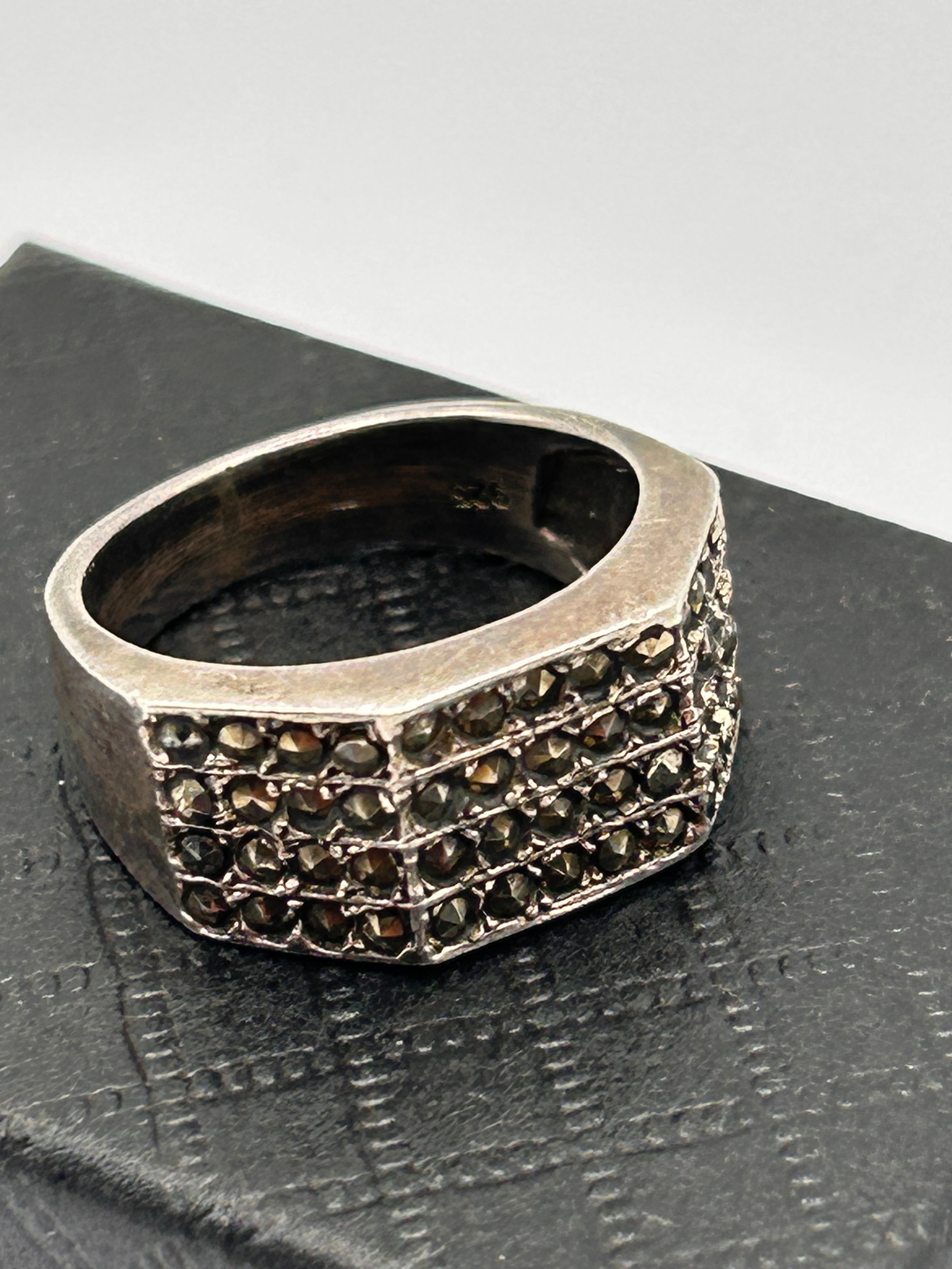 A sterling silver ring featuring a broad, octagonal face. The interior of the band is clearly marked “925”. The face is entirely pave-set with multiple rows of small, dark, faceted stones, characteristic of marcasite, arranged in a geometric pattern suggestive of Art Deco or vintage design.