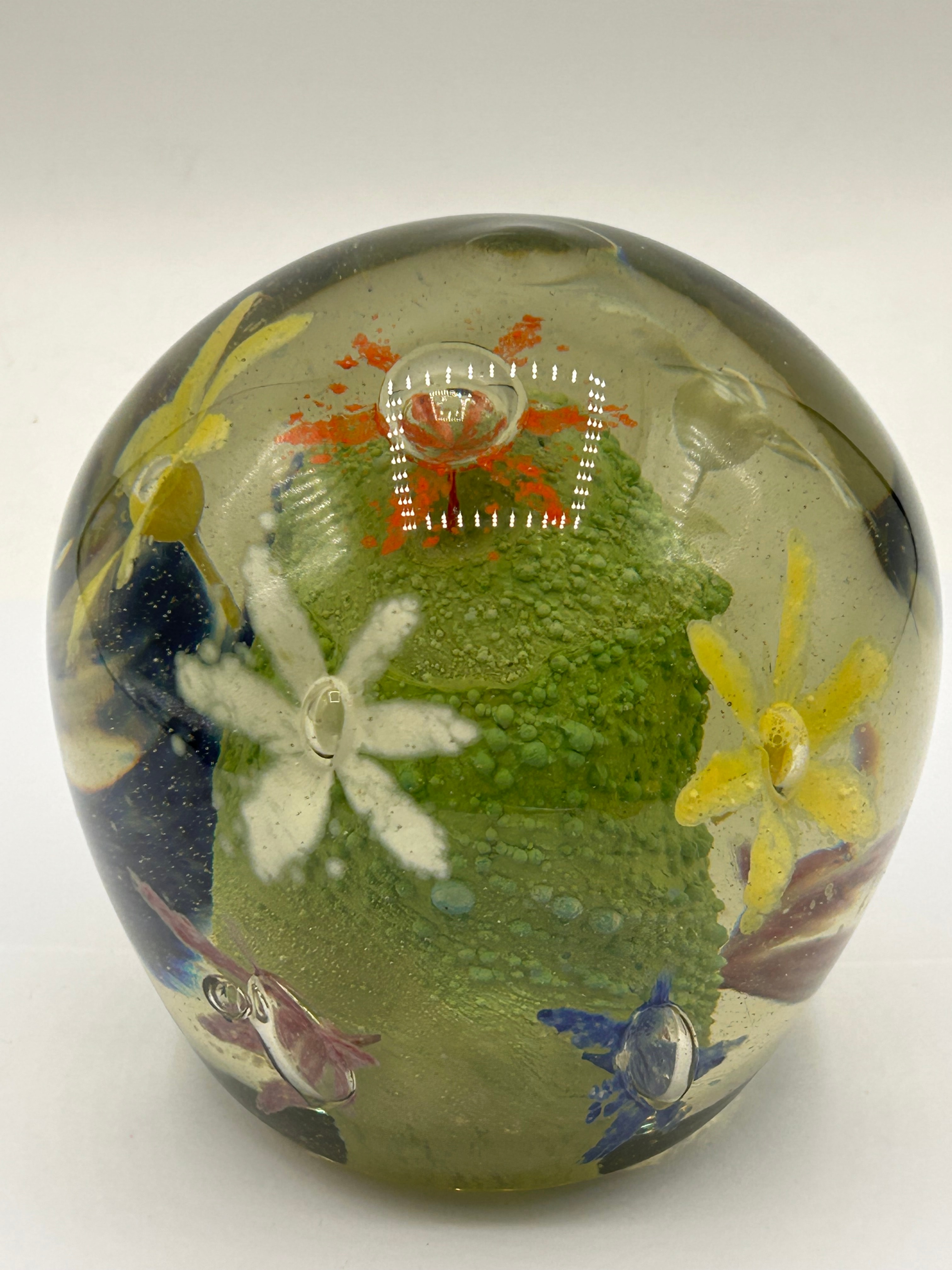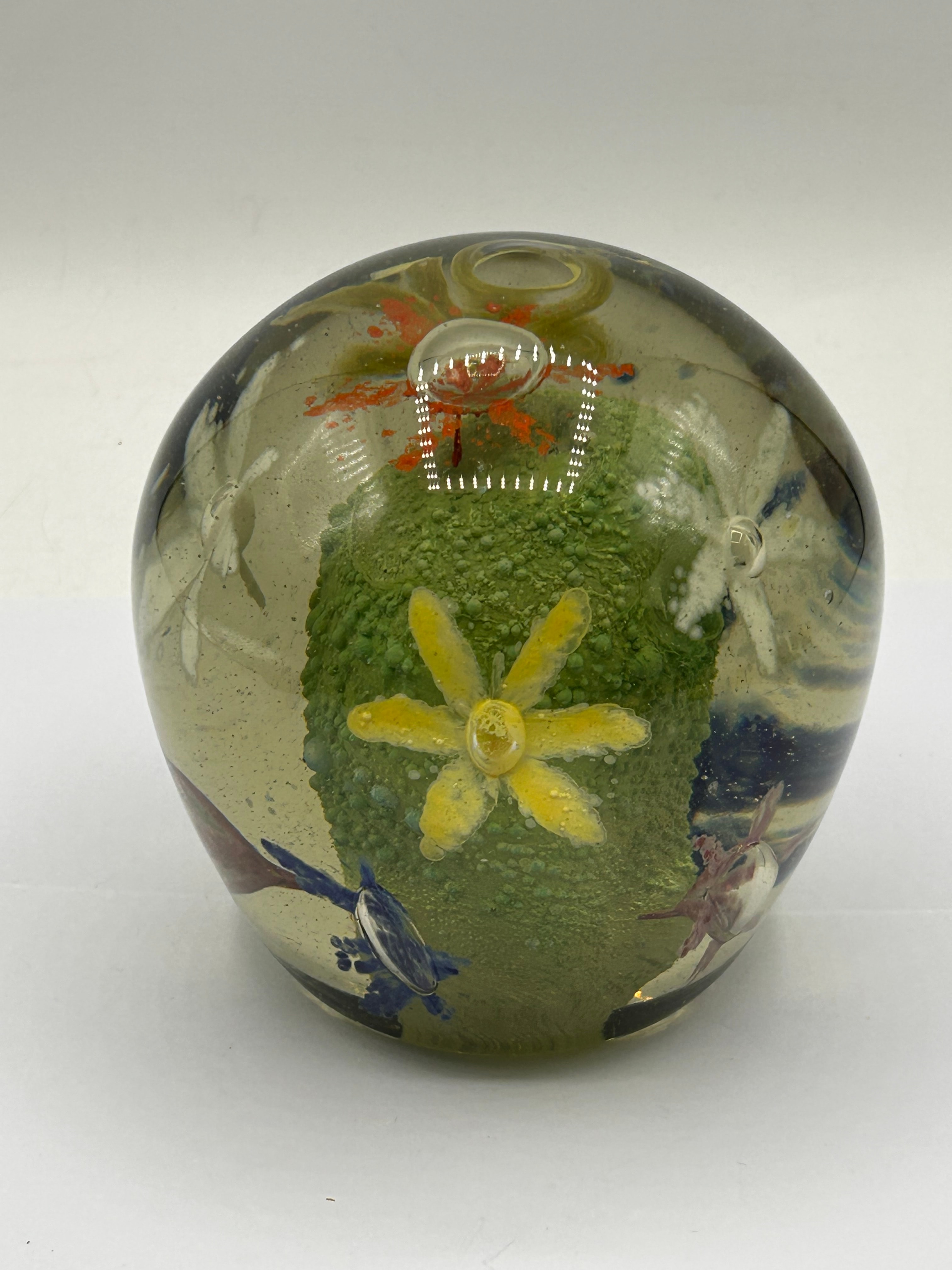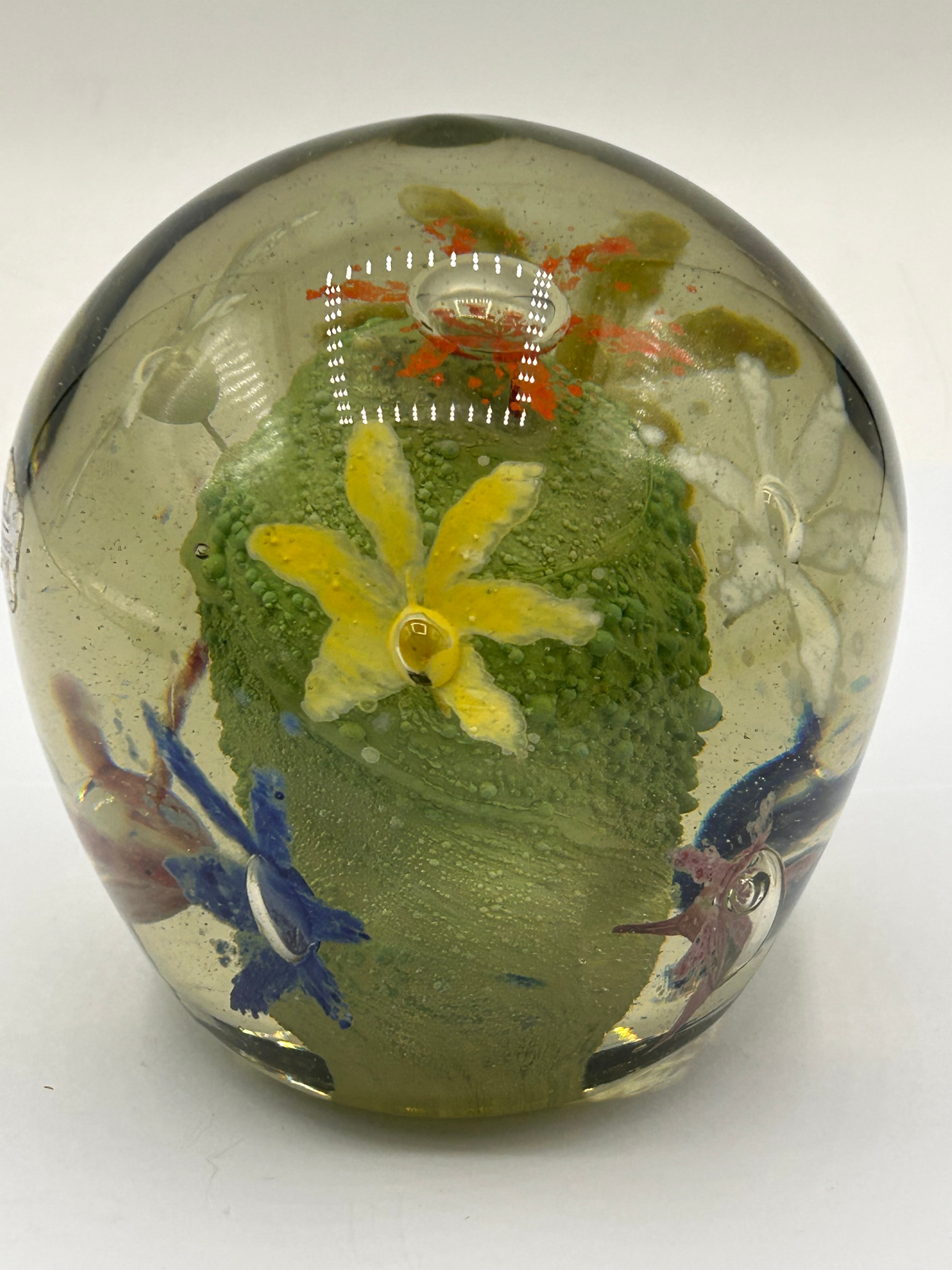 A spherical to ovoid glass paperweight featuring an intricate encased lampwork design. The interior prominently displays a central textured green form, resembling a cactus or succulent, from which emerge multiple stylized flowers in yellow and white, all incorporating intentional air bubbles. Smaller, stylized creatures, possibly turtles or fish, in blue and reddish-brown, are positioned around the base of the central green element. The surrounding clear glass has a slightly smoky appearance with some internal sparkle. There are no visible text, signatures, or maker’s marks.