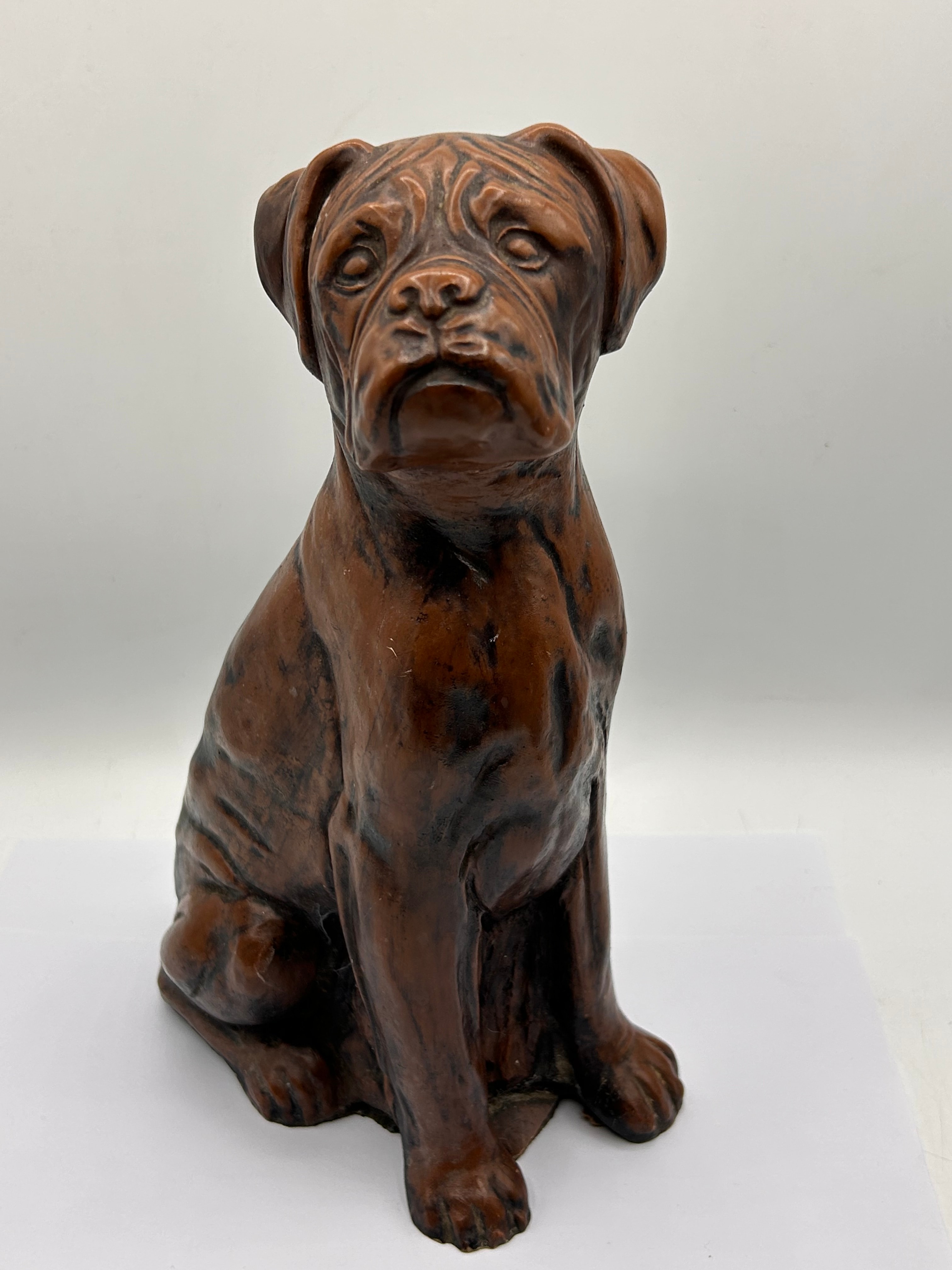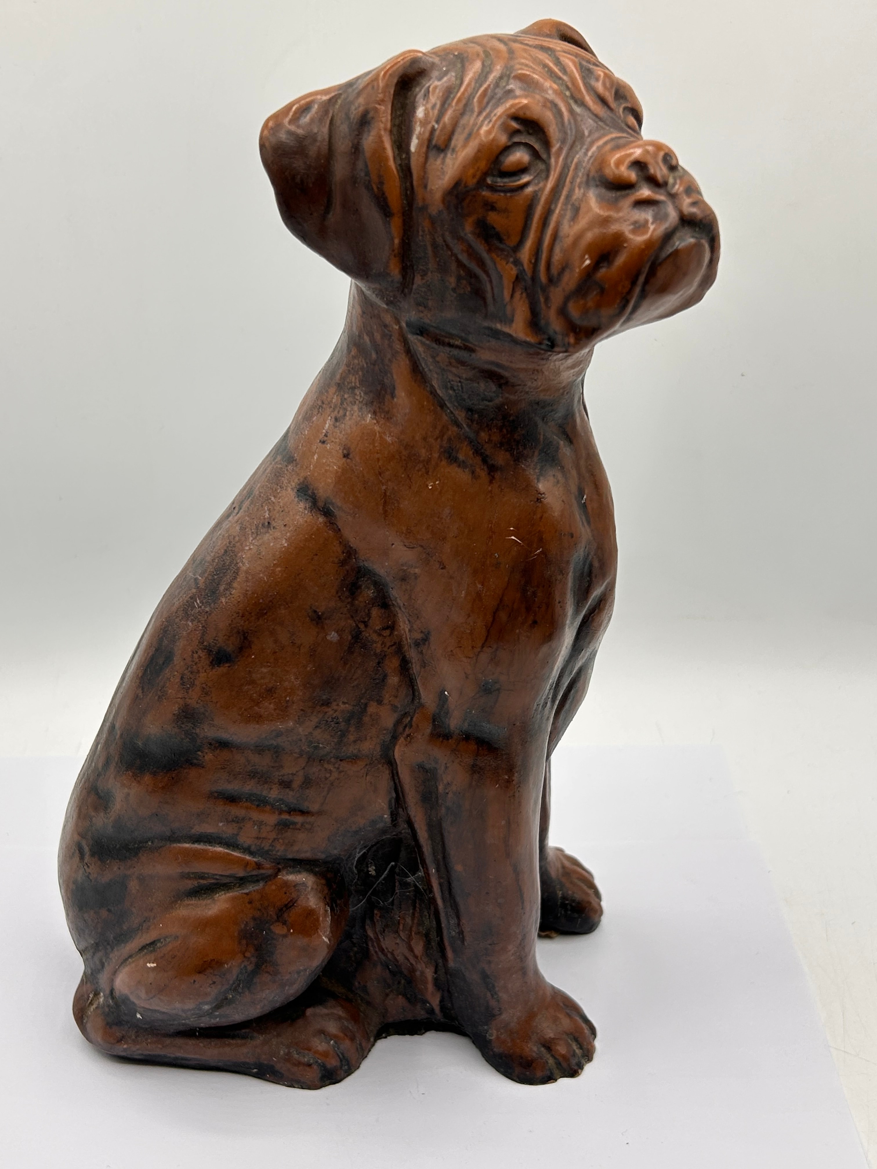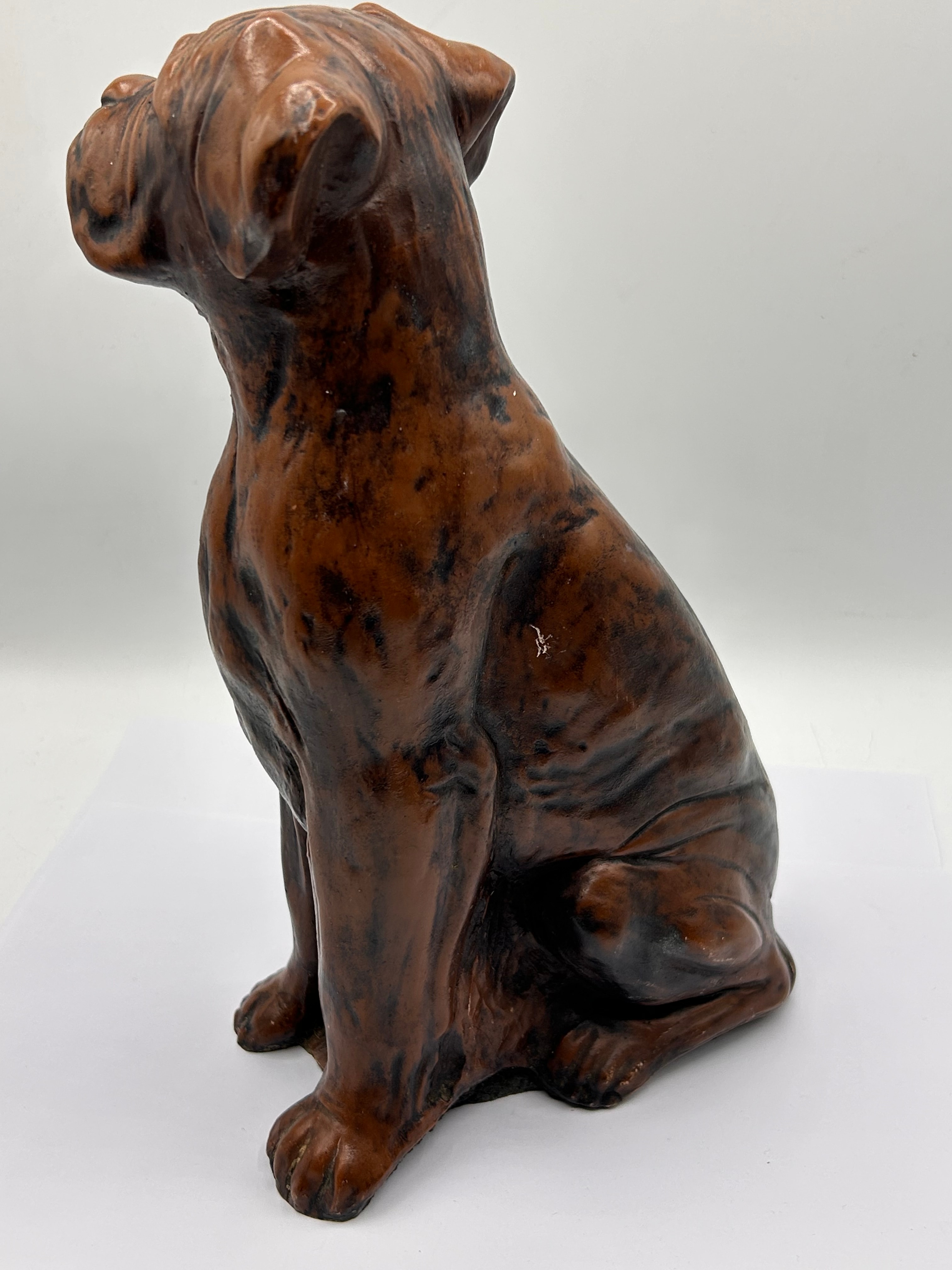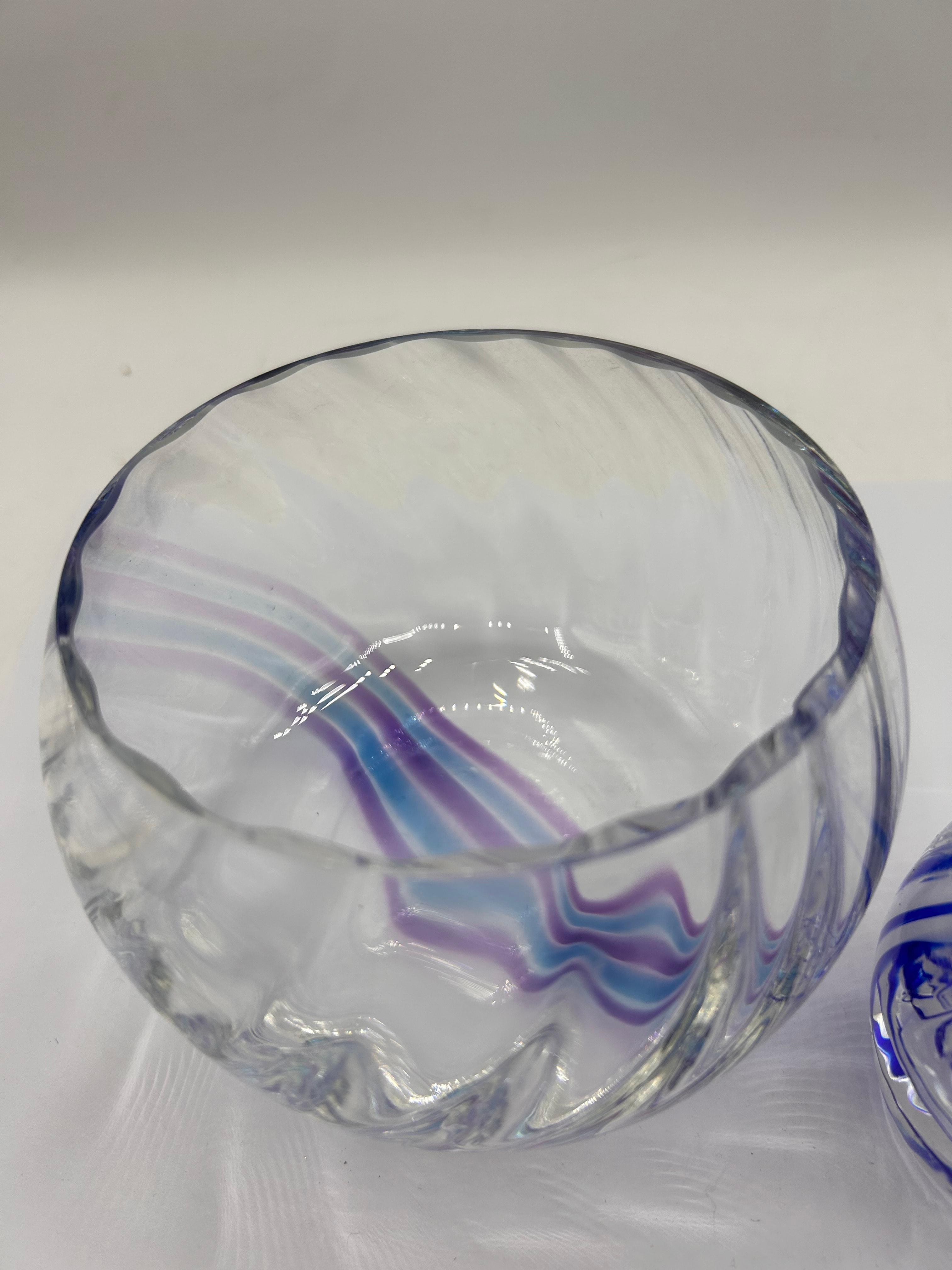 A pair of decorative glass vessels, comprising a wide, low bowl with a clear glass body featuring internal undulating stripes in light blue and purple, and a smaller, bulbous vase with a flared rim exhibiting swirling blue and white stripes against clear glass. Both glass items appear to be hand-blown. Accompanied by a seated dog sculpture, depicting a Mastiff-type breed, crafted from what appears to be ceramic or resin and finished with a mottled dark brown and black surface resembling an antique patination. The sculpture is rendered in a naturalistic style with detailed features.