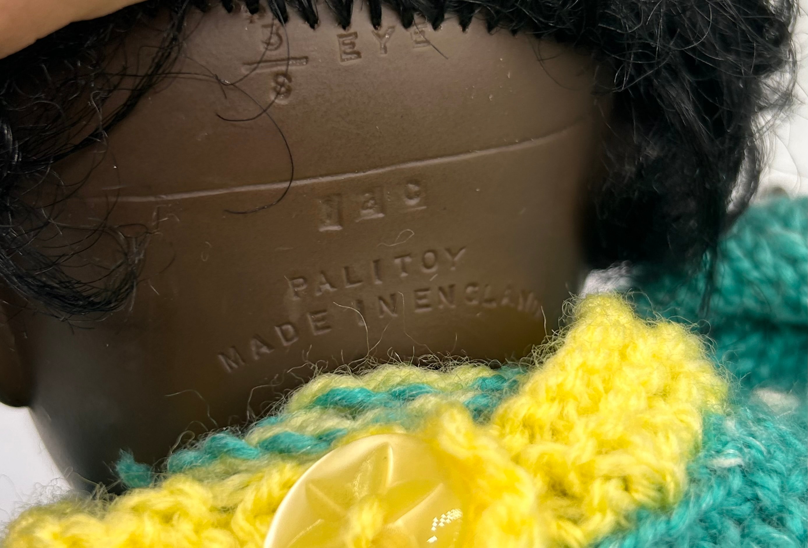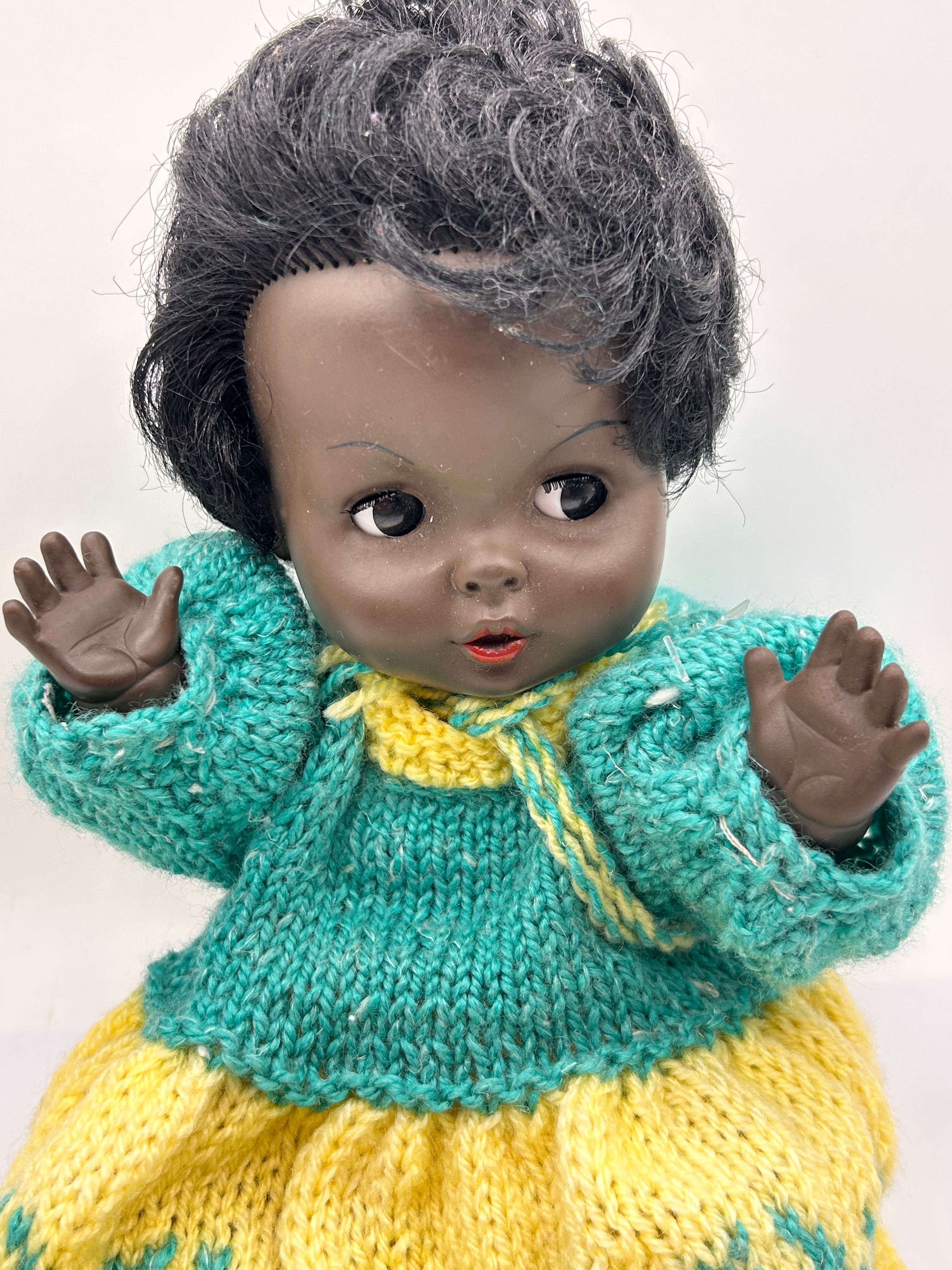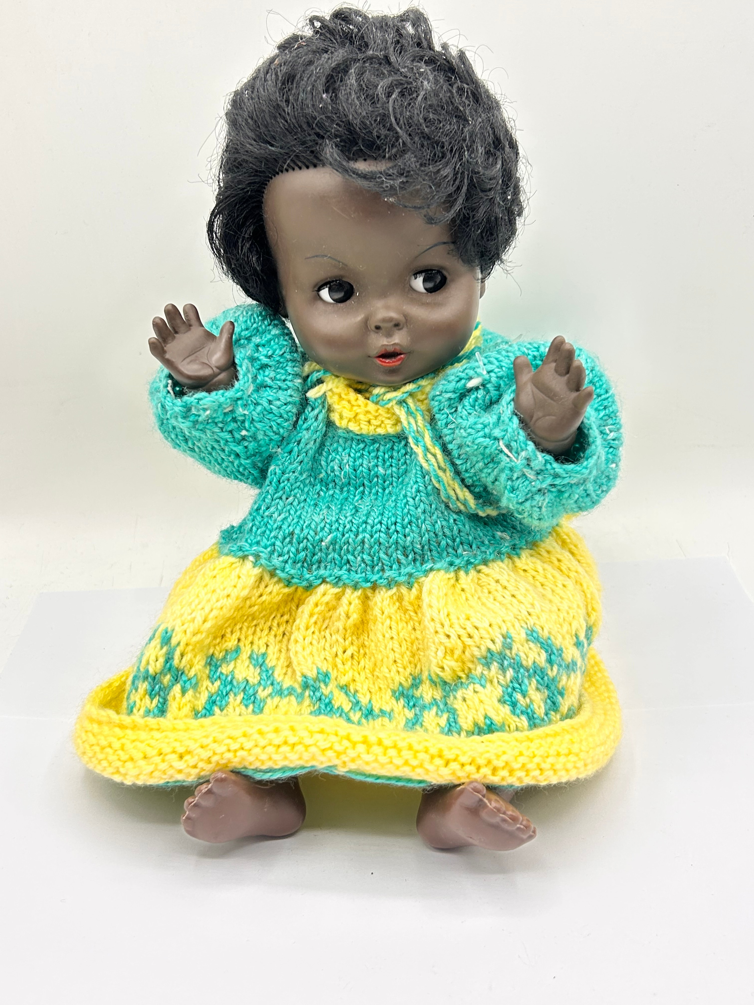 A Vintage Palitoy England Black Baby Doll, circa 1960. The doll is likely constructed from hard plastic or composition, featuring a dark skin tone, rooted black synthetic hair, and painted eyes. The doll is dressed in a handmade knitted outfit comprising a turquoise long-sleeved top with a yellow collar and ties, and a matching yellow skirt with a turquoise patterned hem. Impressed markings on the back of the neck include “PALITOY”, “MADE IN ENGLAND”, “14C”, and partially legible text appearing to be “S. B. EYE”.