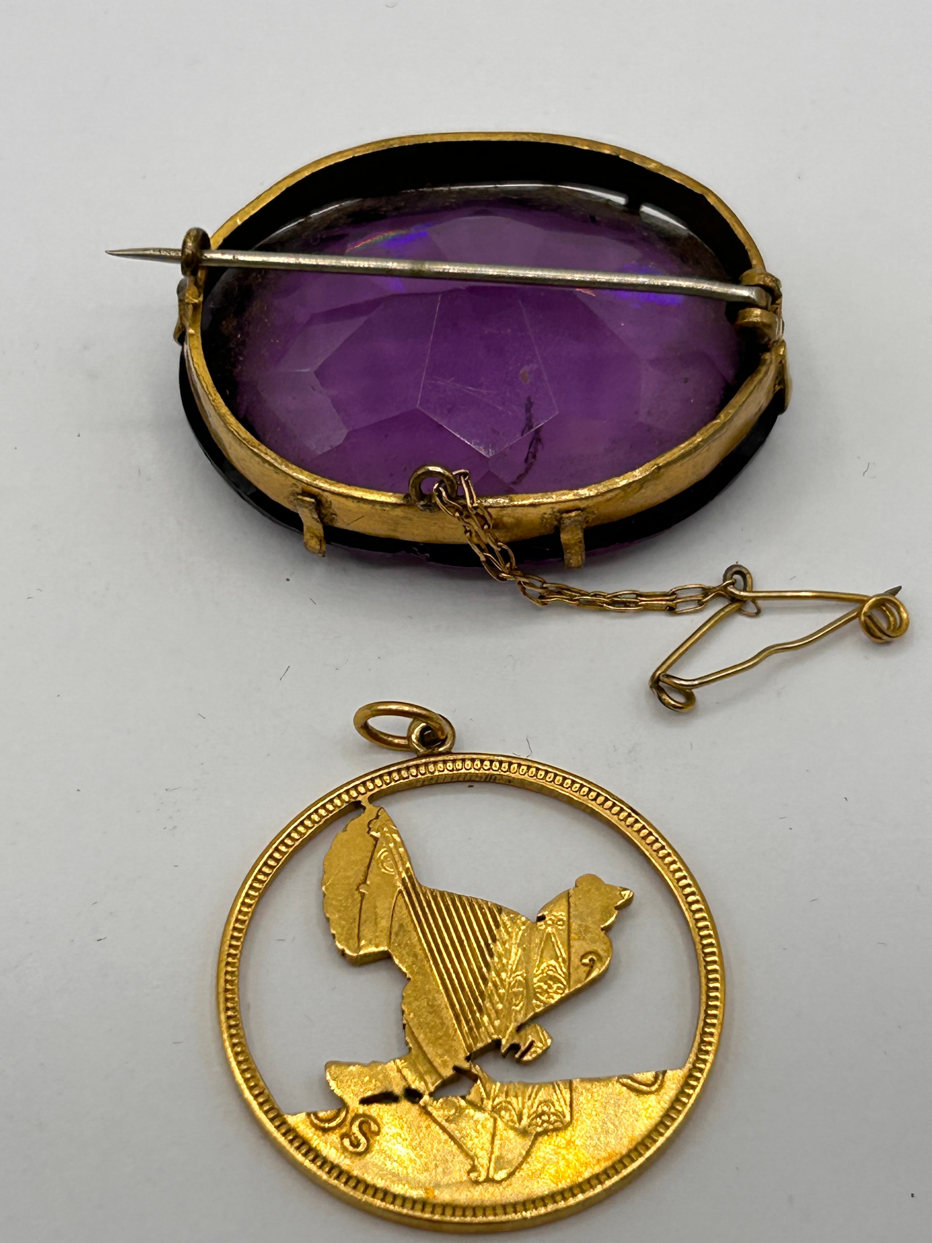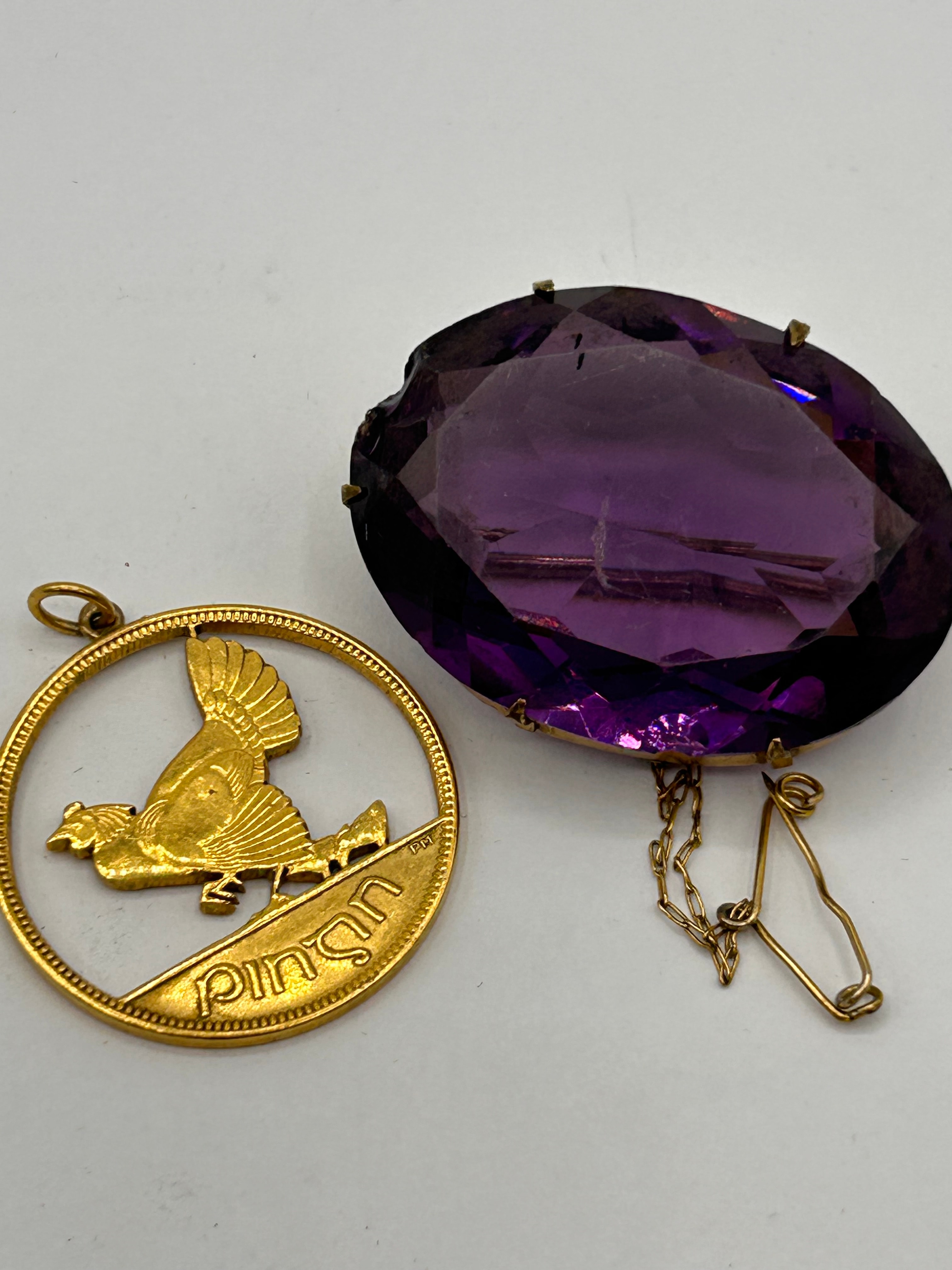 This lot comprises two pieces of jewelry. The first is an oval-shaped brooch featuring a large, deeply faceted purple stone, likely amethyst or glass, set within a gold-toned metal bezel. The reverse reveals a simple pin mechanism, a small safety chain, and a safety clasp, with the back of the setting appearing dark. The second item is a gold-toned metal openwork pendant, depicting a stylized bird, possibly a rooster or chicken, perched within a circular frame. Along the lower edge of the pendant, the word “Pinang” is visible, along with what appears to be an “S” and small initials “J.G.J.”.