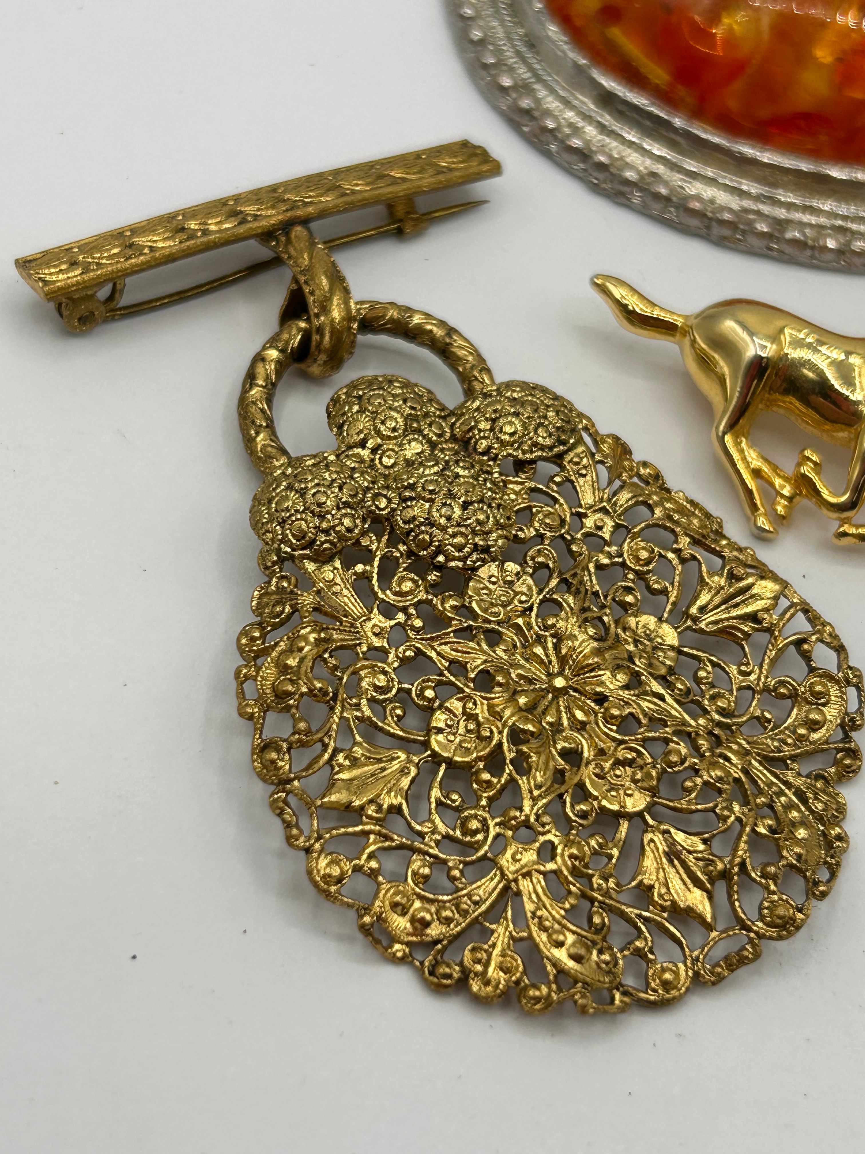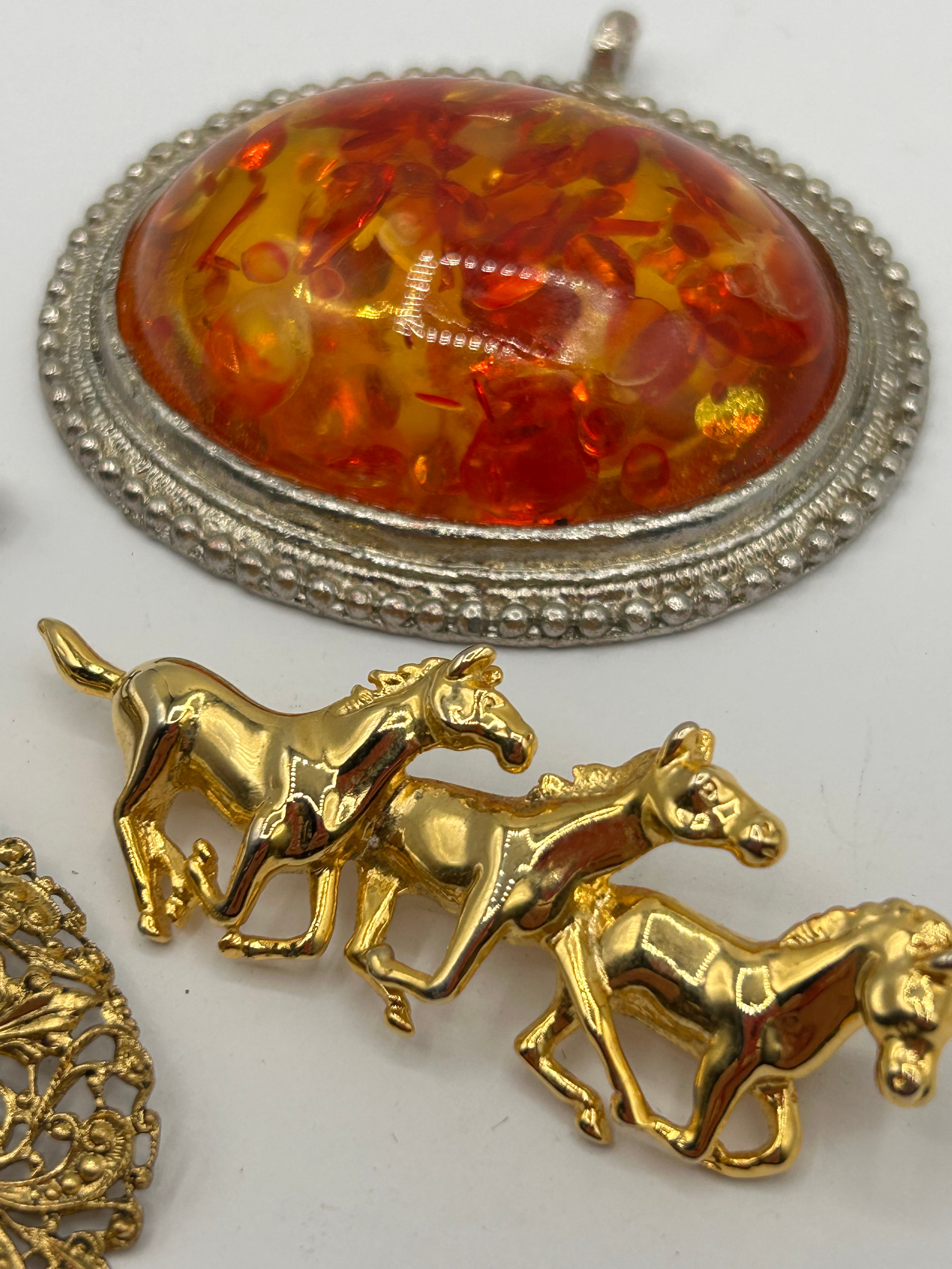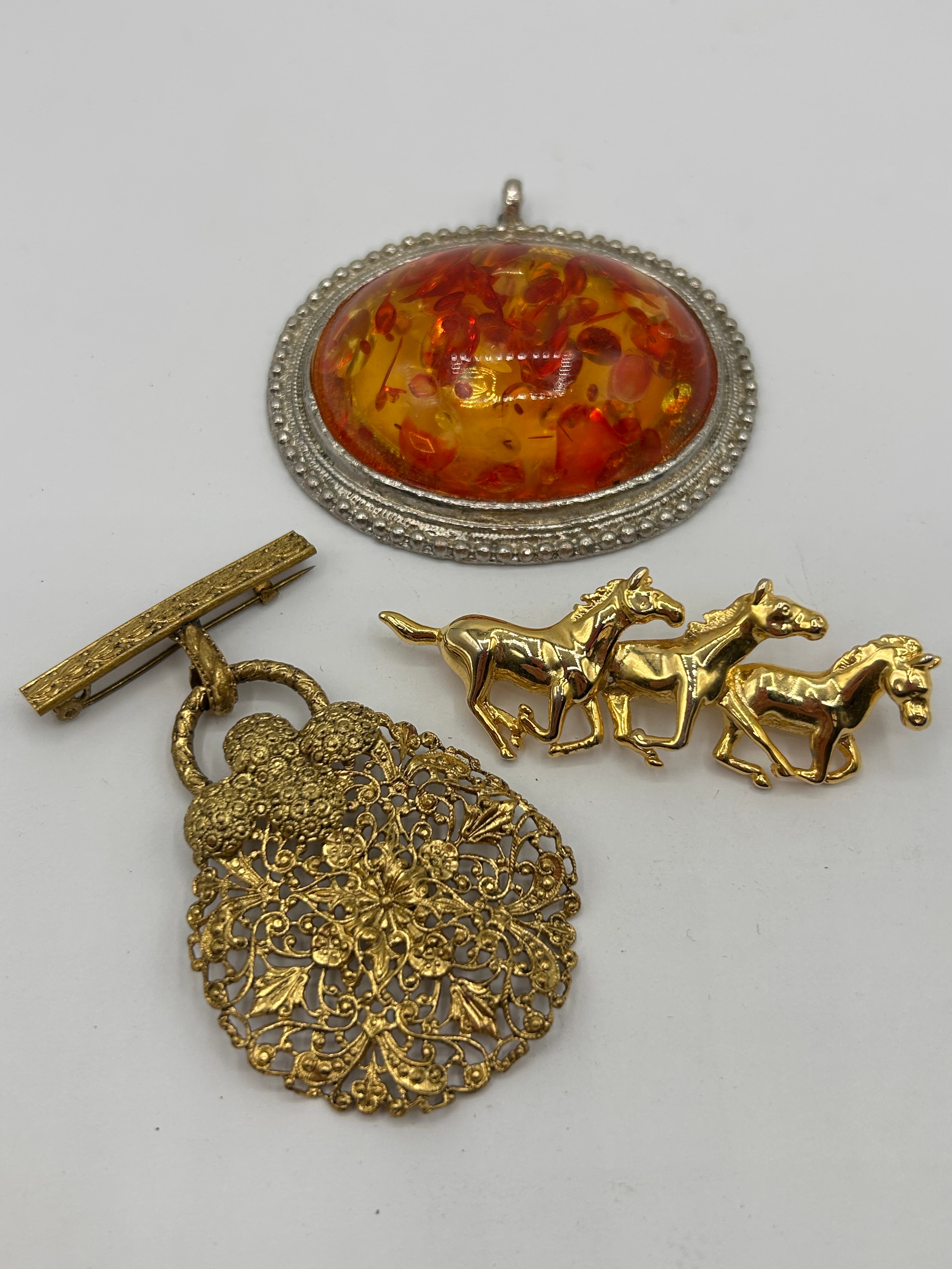 This collection comprises three pieces of costume jewelry. The largest item is an oval pendant featuring a substantial, domed cabochon of orange and red speckled material, likely resin or art glass, set within an ornate, textured silver-tone bezel. Adjacent is an elaborate gold-tone brooch, potentially a fob, characterized by a highly detailed filigree-style openwork body with floral and scroll motifs, suspended from a textured bar pin. Completing the lot is a gold-tone figural brooch depicting three stylized running horses in a linear arrangement.