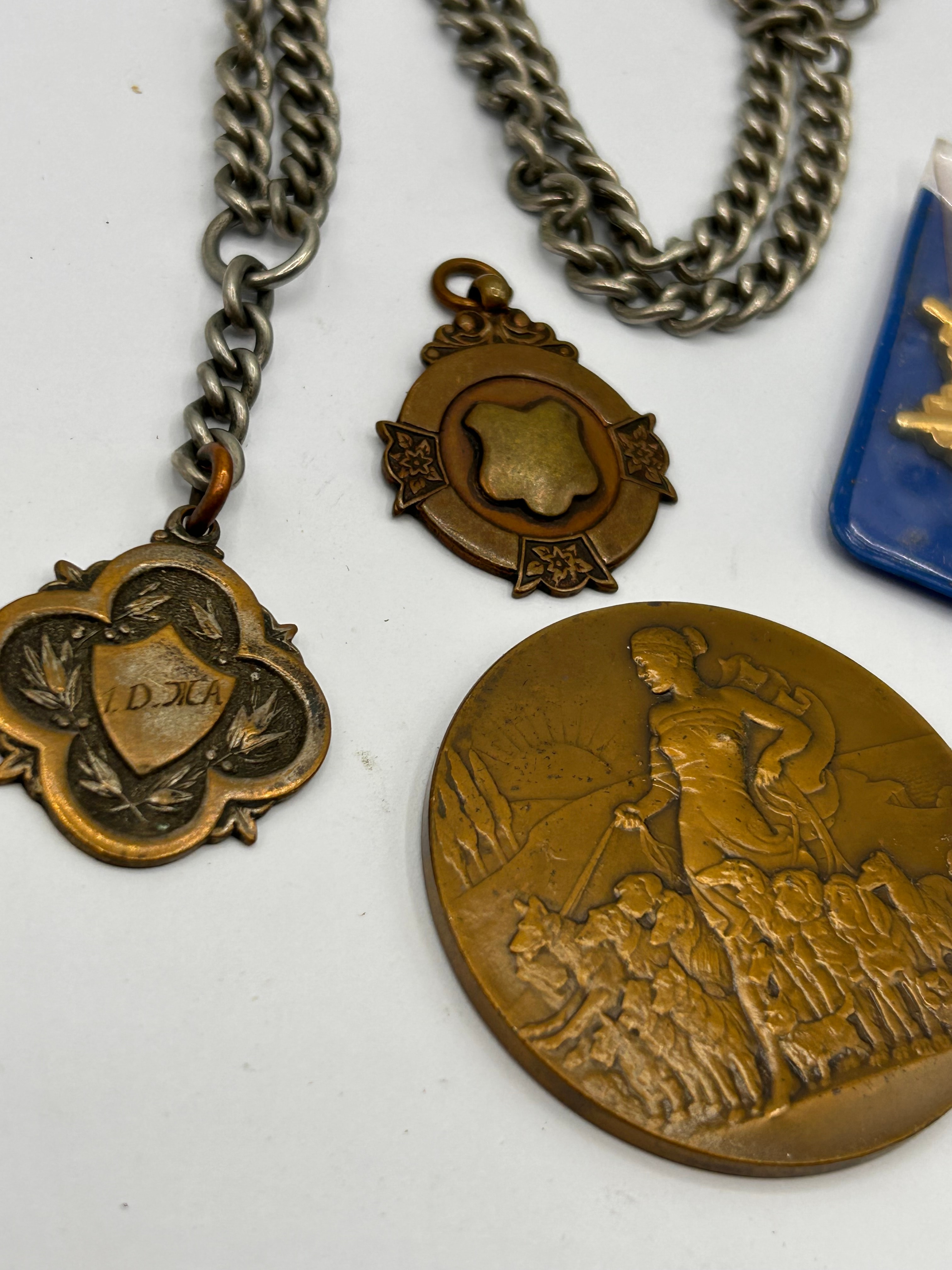 A collection of four medals and awards. Comprising a silver-tone metal chain, possibly a watch chain, with a clasp at one end and a bronze-toned quatrefoil-shaped fob at the other, engraved “I.D.D.A.”. A smaller bronze-toned medallion features a central blank shield within an ornate cruciform design. A large circular bronze-toned medal depicts an allegorical scene of a classical female figure leading a procession of people. The collection also includes a gold-toned, star-shaped medal presented in a clear plastic sleeve with a blue backing, marked “LEICESTERSHIRE CONSTABULARY 1982” around a central crest.