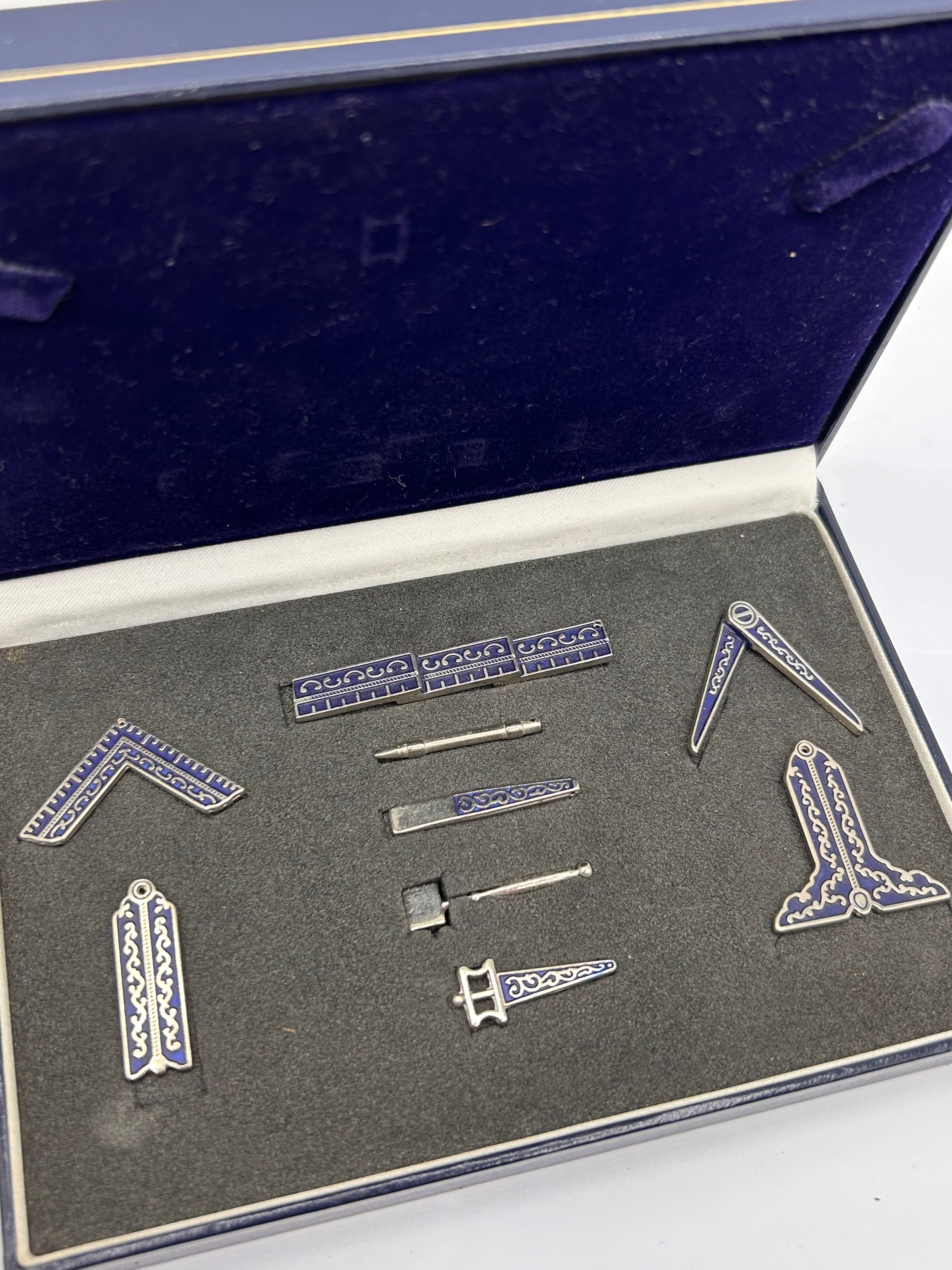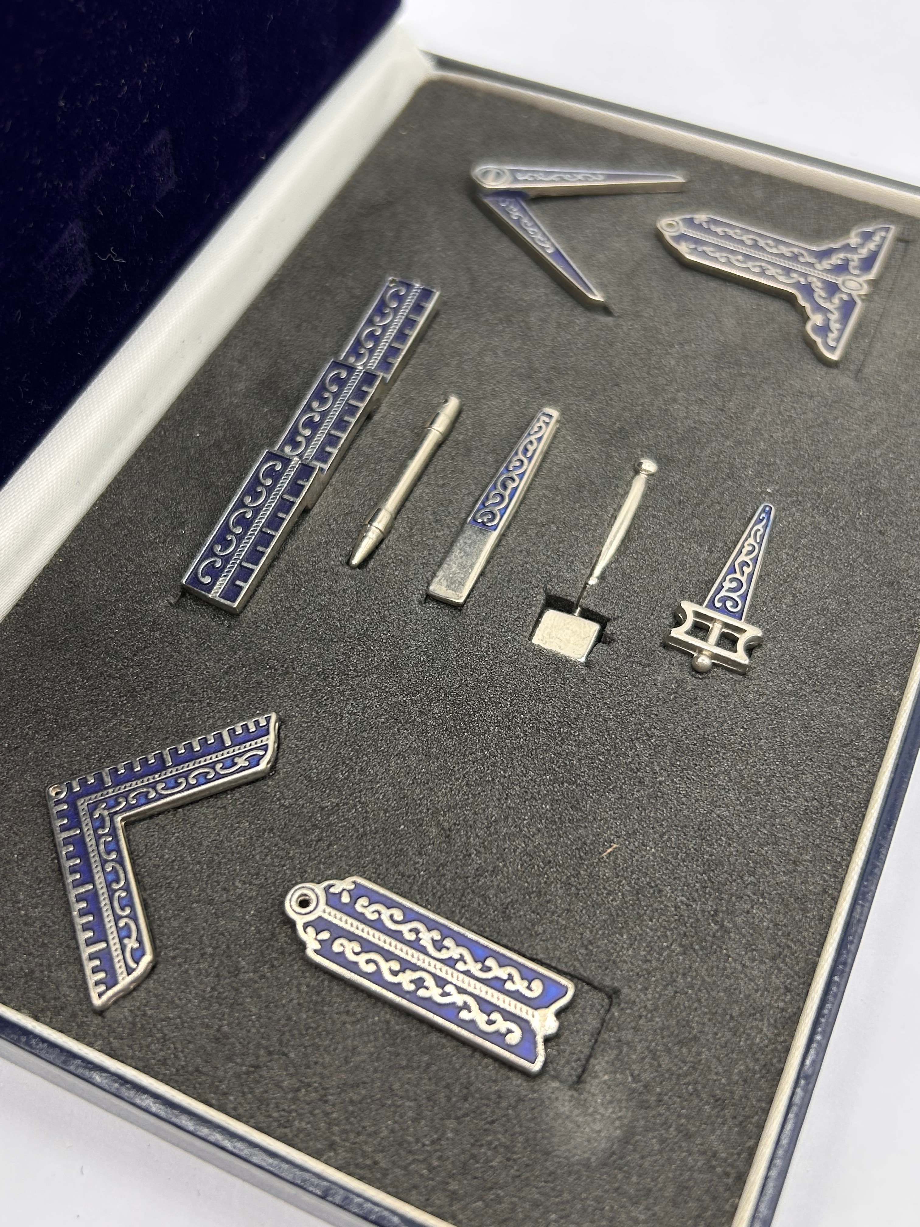 A Masonic Miniature Working Tools Set, comprising eight silver-toned metal objects featuring blue enamel or resin inlay decorated with scrollwork and geometric patterns. The individual items include a right-angle square, a pair of compasses, a straightedge, a plumb rule, a gavel, a pointed tool, a rectangular tool, and a trowel. The set is housed within a hinged dark blue presentation box, which features a velvet-lined interior lid and a custom-fitted black foam insert. No discernible text, hallmarks, or manufacturer markings are visible on any of the objects or the box.
