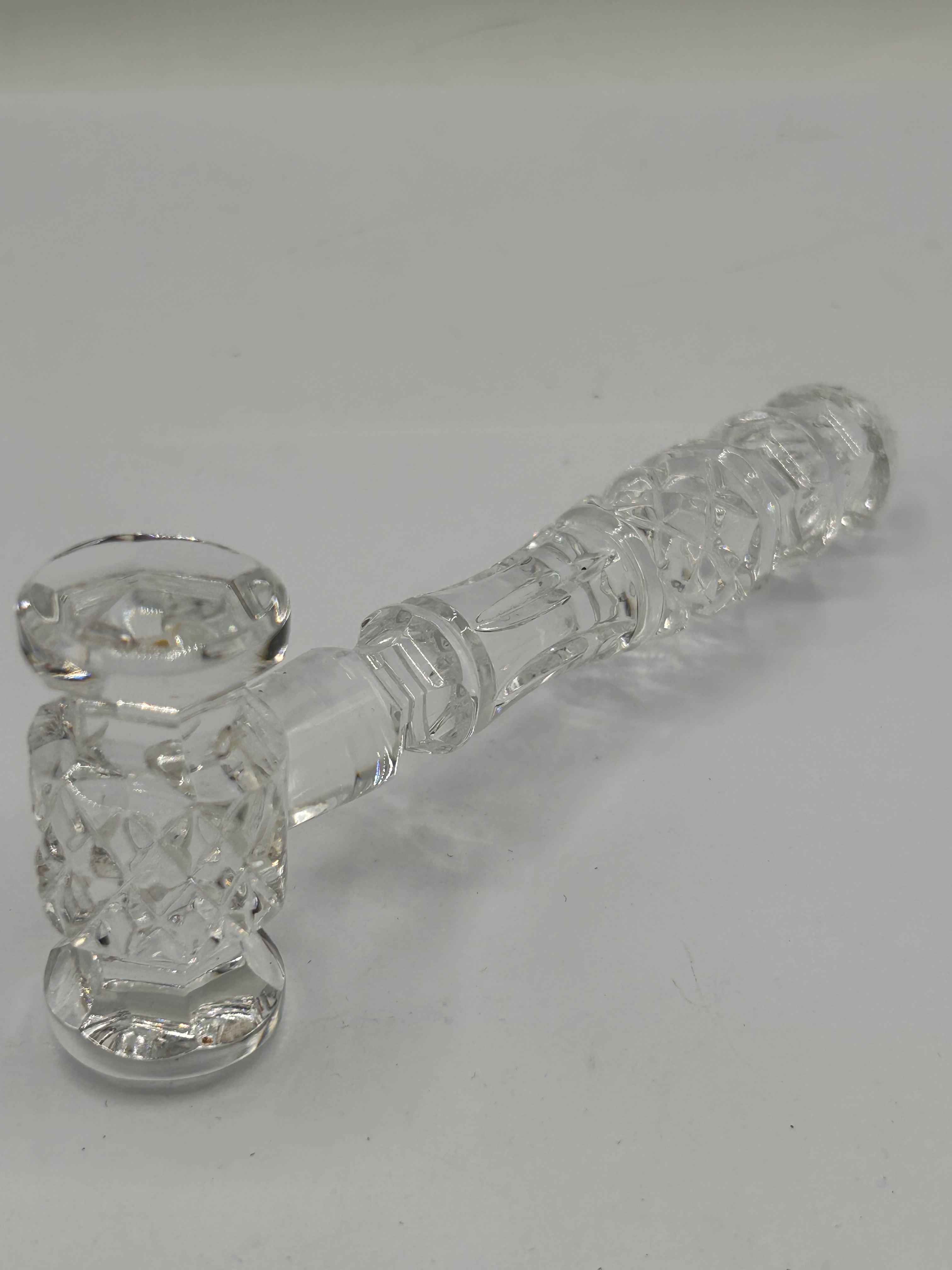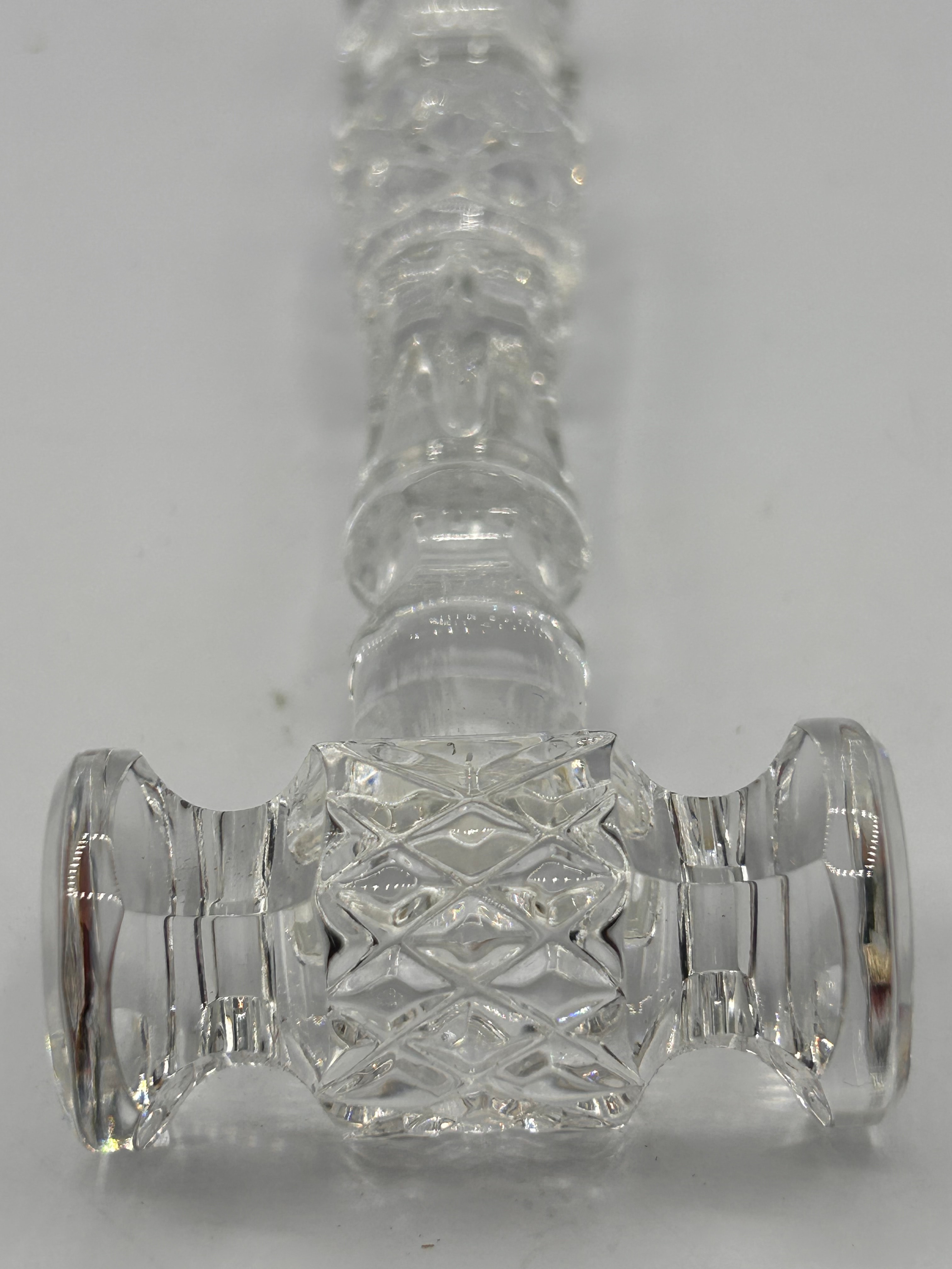A Waterford Crystal Gavel, crafted from clear, faceted crystal. The handle features a series of alternating round and octagonal segments, intricately decorated with diamond-cut patterns. The head exhibits similar faceting on its sides and smooth striking faces. No visible text or maker’s marks are present.