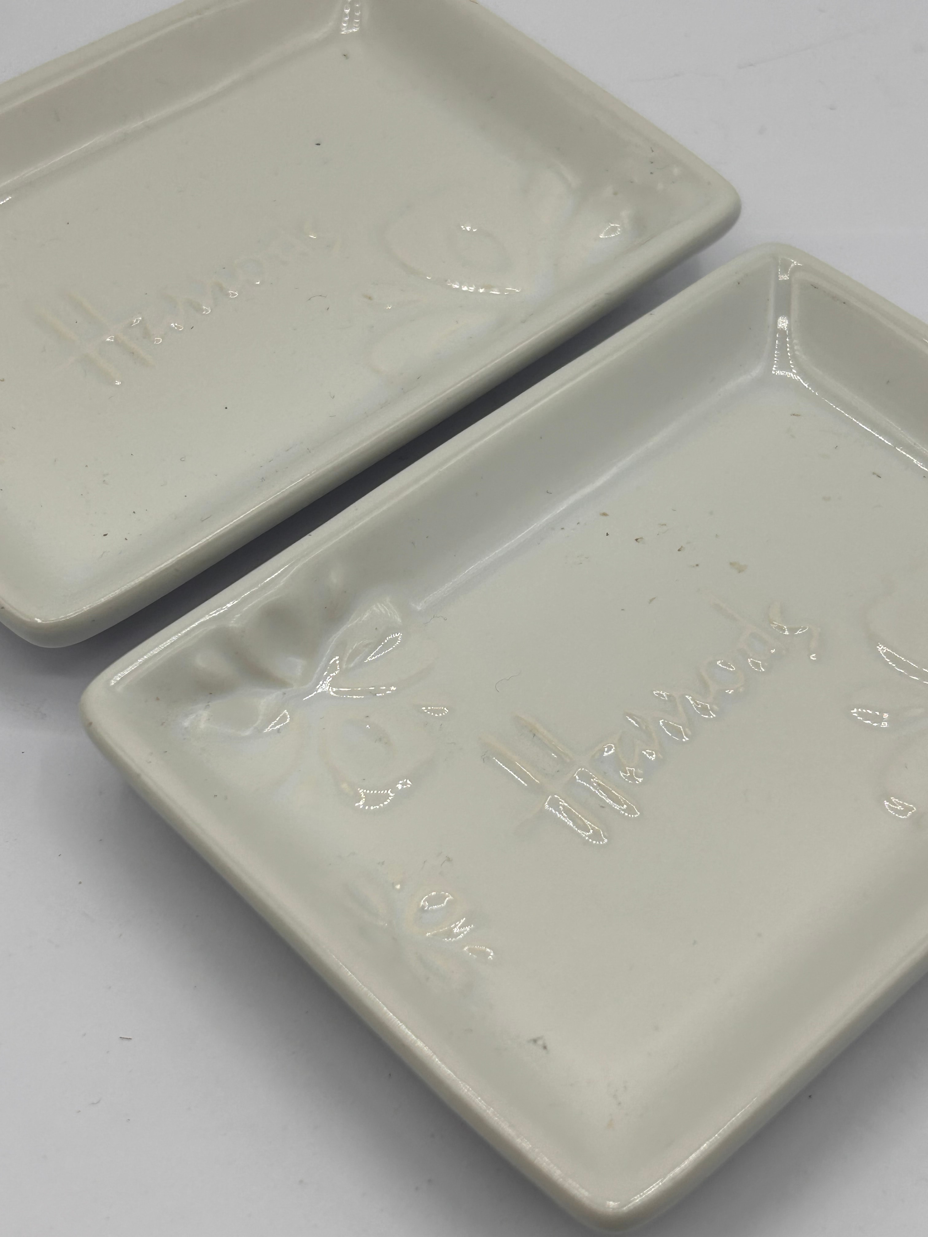 A pair of rectangular, shallow ceramic trays, each finished in an off-white glaze. The interior surface of each tray features an embossed ‘Harrods’ script logo, accompanied by decorative motifs resembling bows or floral elements. The underside of one tray also displays a printed ‘Harrods’ mark in black script. These items appear to be of a modern style.