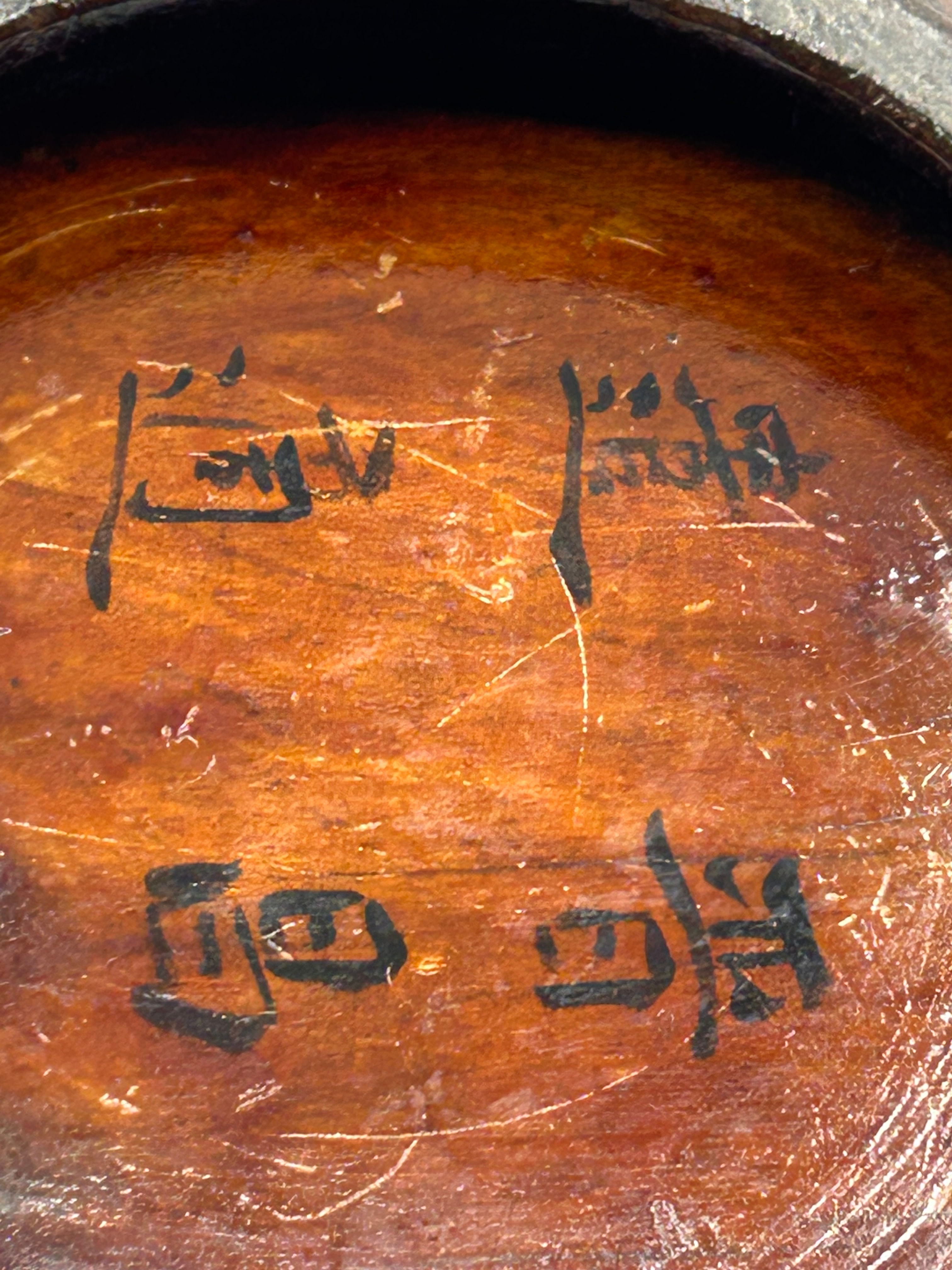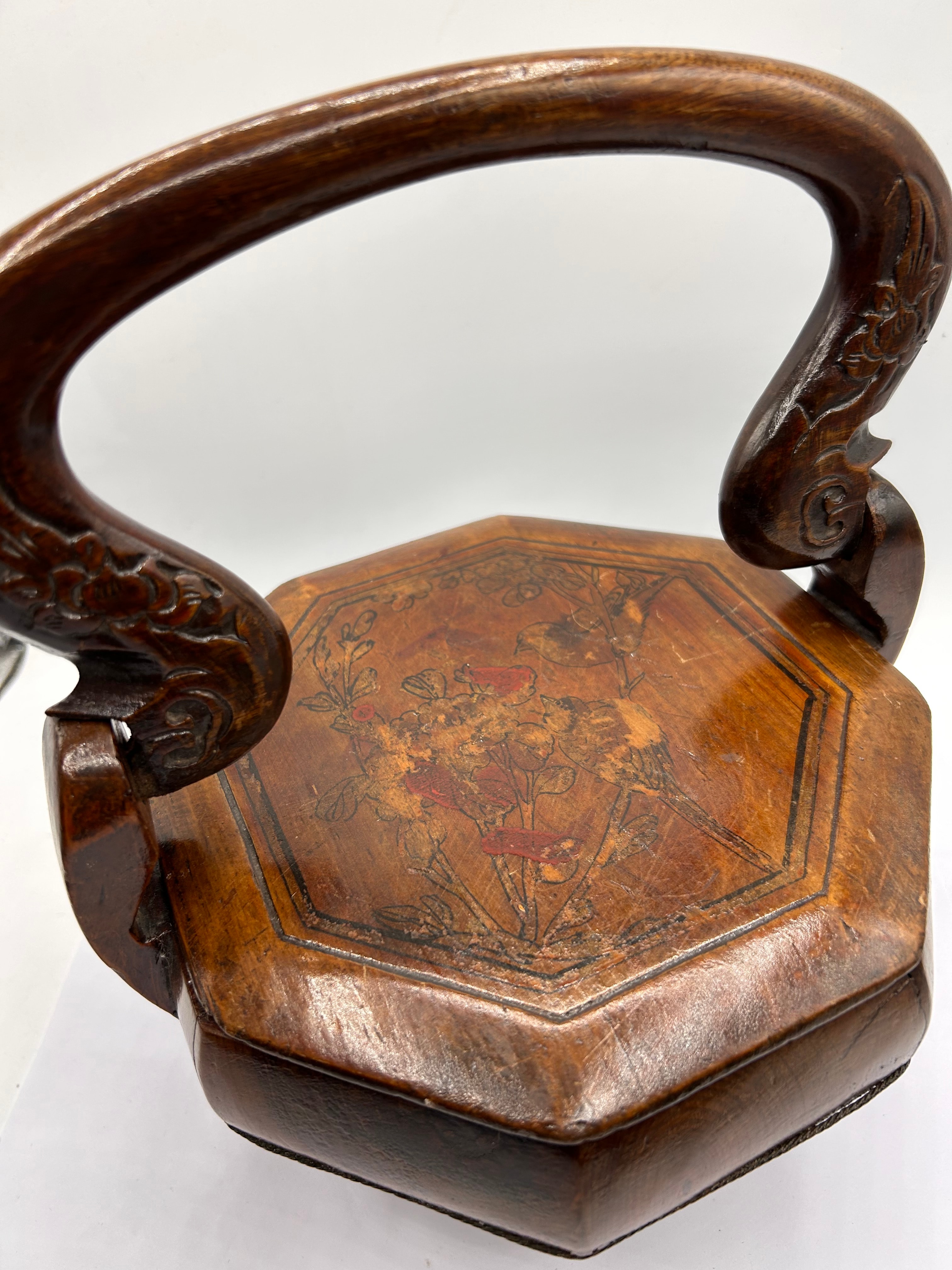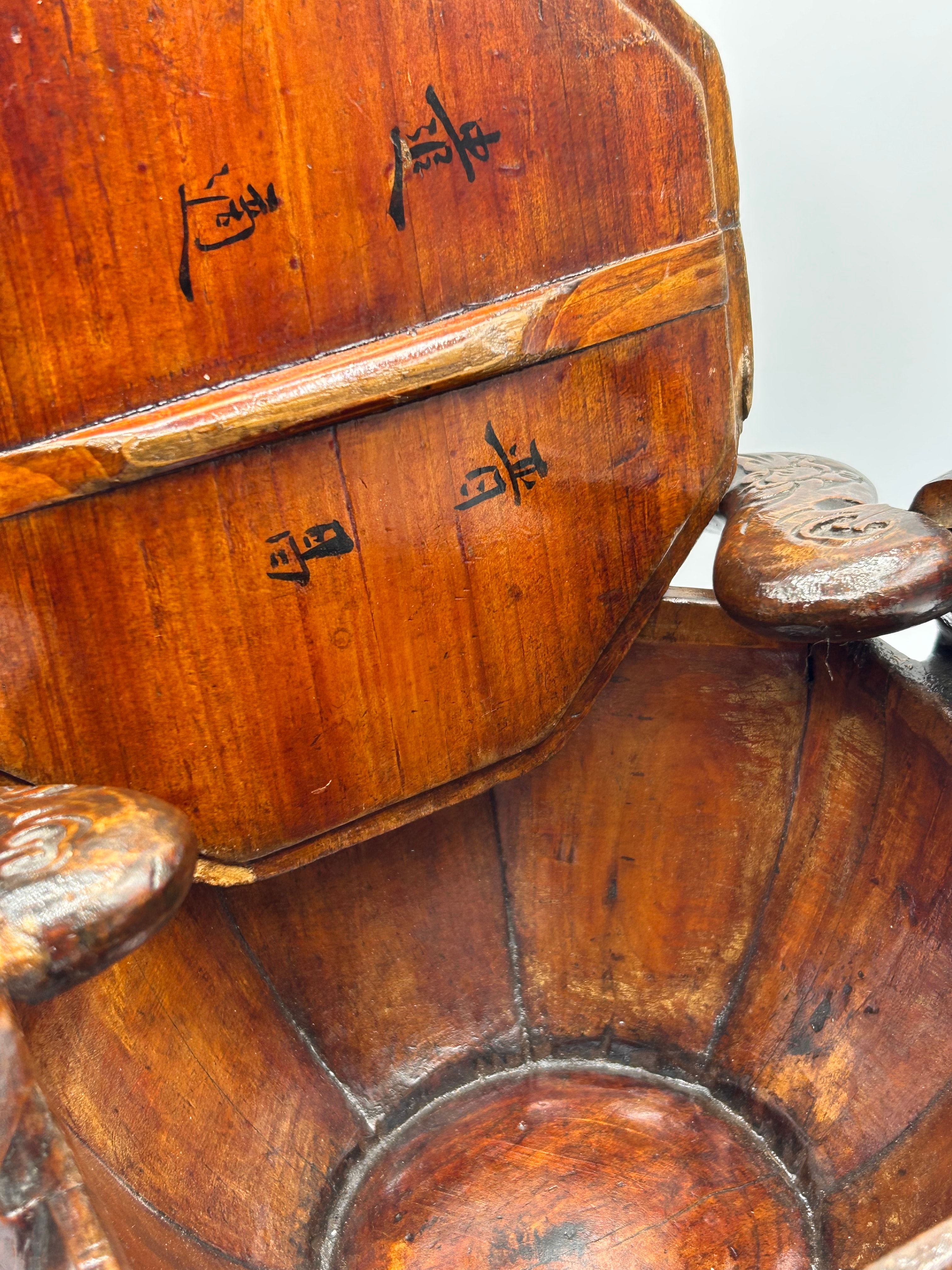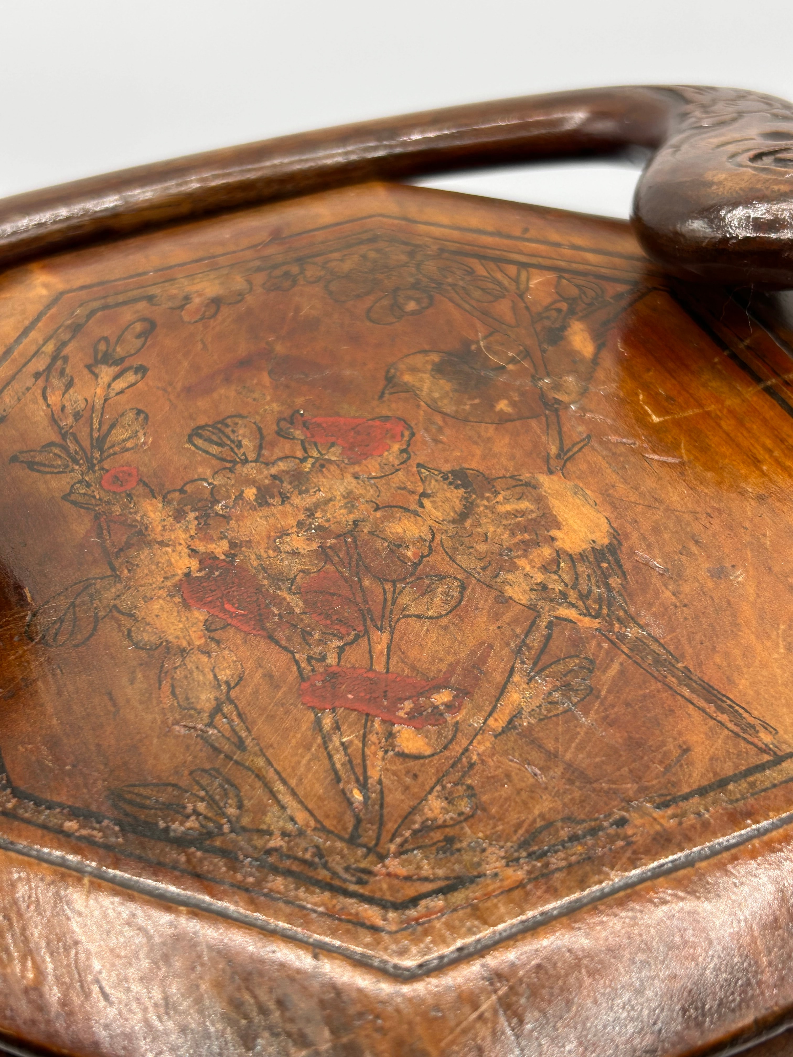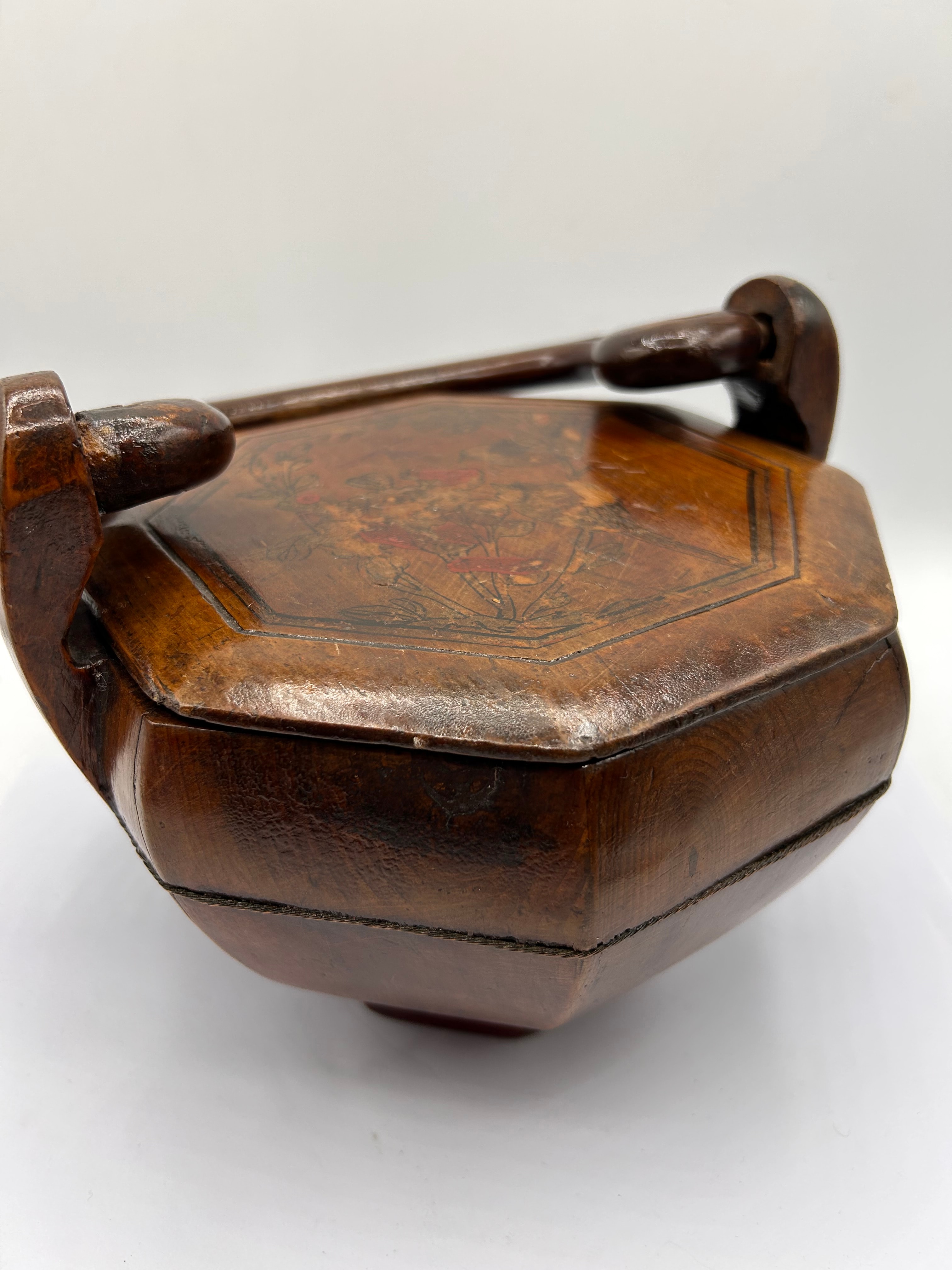 A Chinese Wedding Basket, crafted as an octagonal wooden lidded container with a pivoting arched handle, carved with stylized details at its ends. The item is made from dark-stained wood. The lid features a central hand-painted or pyrography decoration depicting birds among flowering branches, enclosed by a simple border. Inside the lid, black Chinese characters read “福” (fú, good fortune) and “壽” (shòu, longevity). Further black Chinese characters are present on the bottom interior of the container, reading “福德” (fú dé, good fortune and virtue), “四明” (Sìmíng, a place name), and “公司” (gōng sī, company), indicating a potential manufacturer or regional origin. The overall aesthetic is consistent with East Asian craftsmanship.