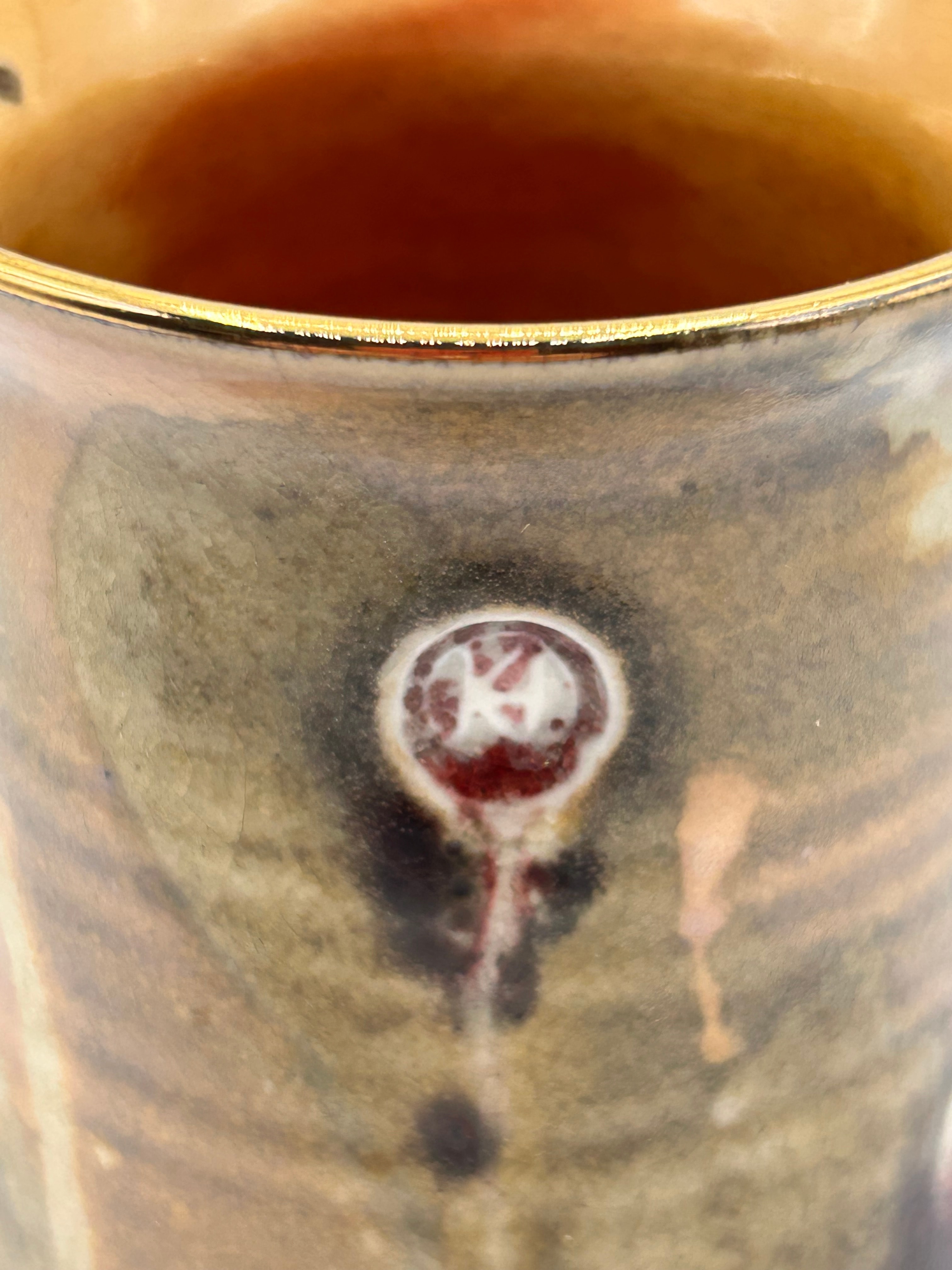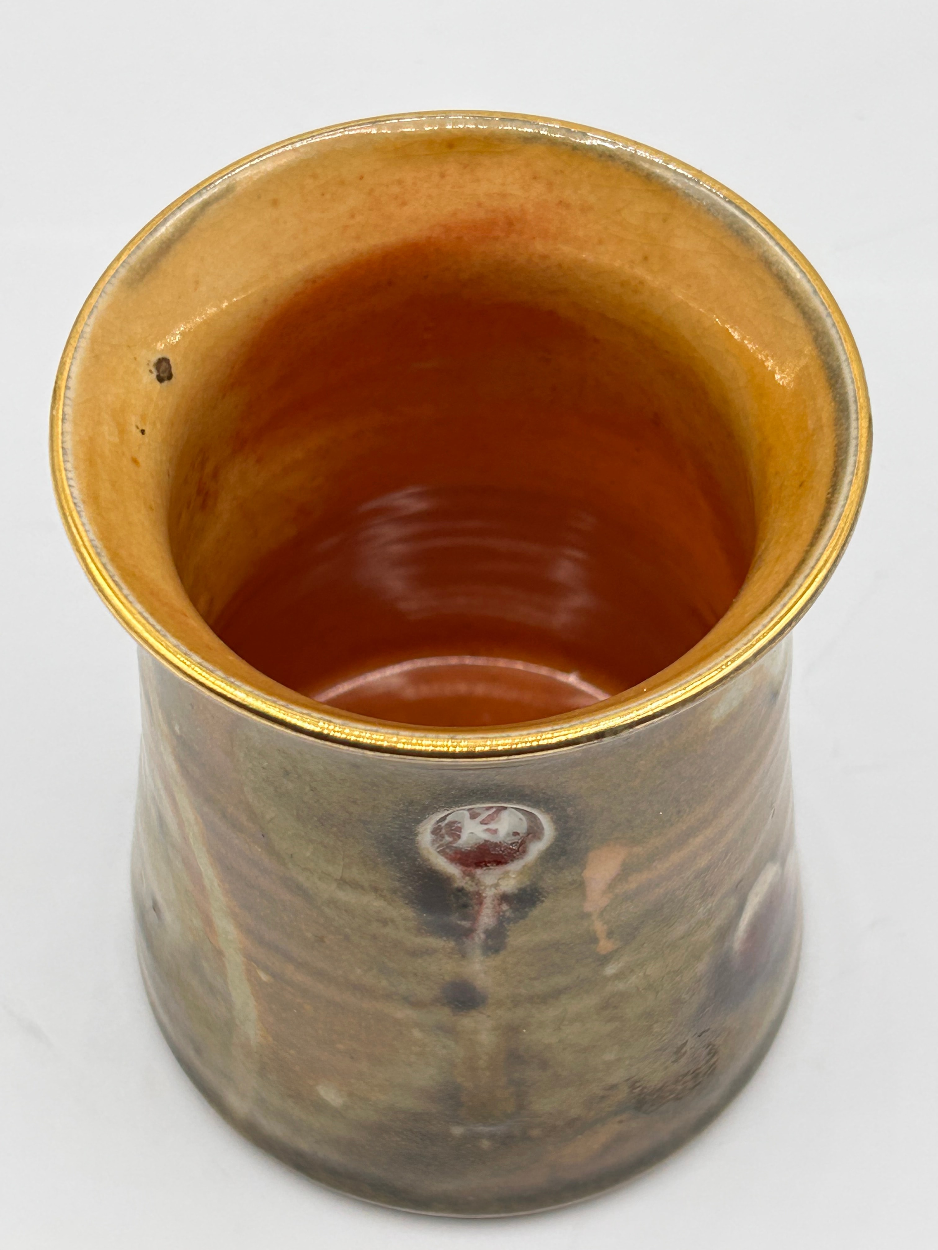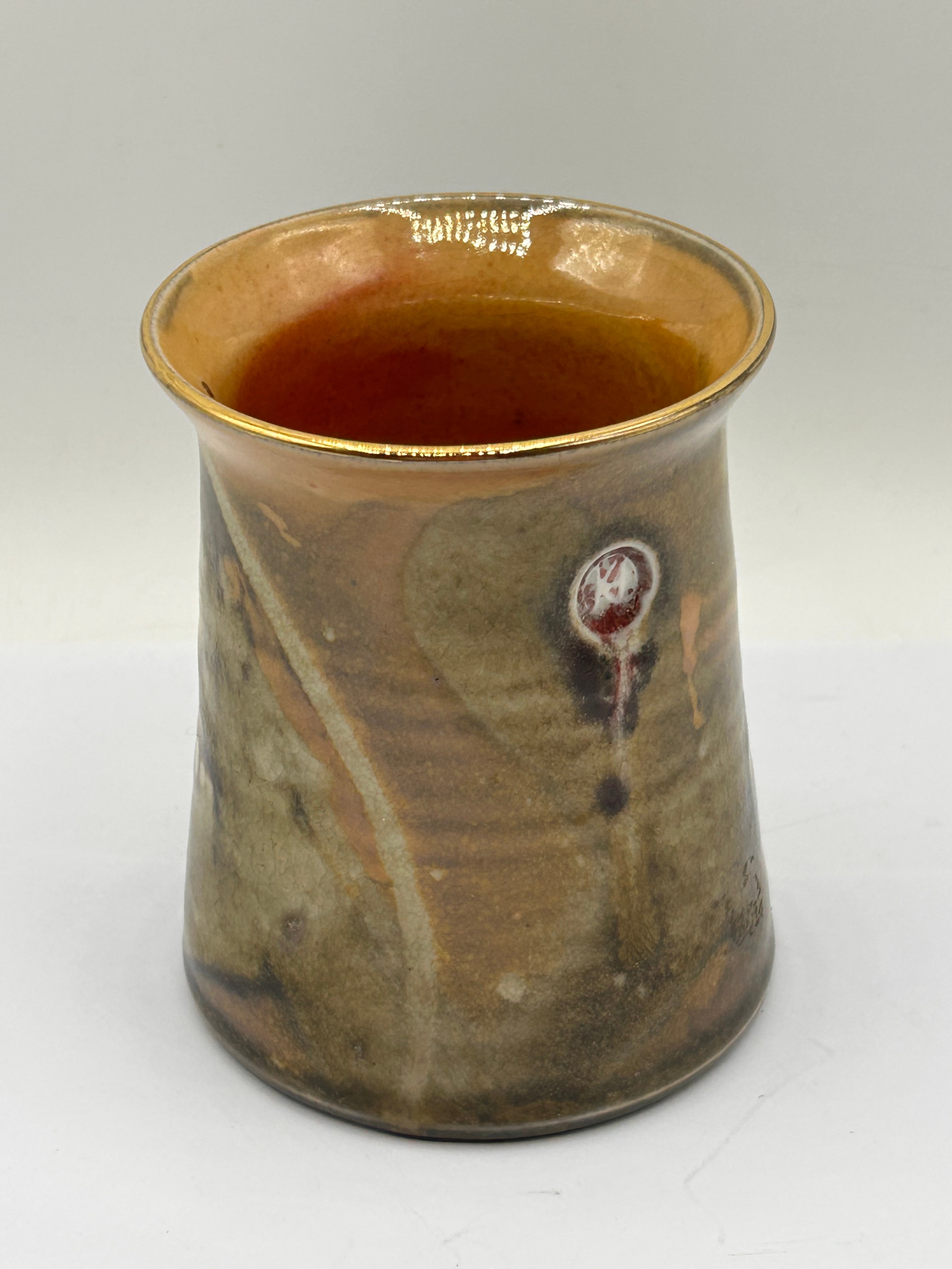 A ceramic, beaker-form vessel or vase, consistent with studio art pottery. It features a multi-tonal, mottled glaze in shades of earthy green, brown, and ochre, with the interior glazed in a warm orange-brown. A metallic luster band, likely gold, accents the top rim. A circular impressed or applied mark, appearing to be a stylized ‘K’ or ‘R’, is visible on the body.